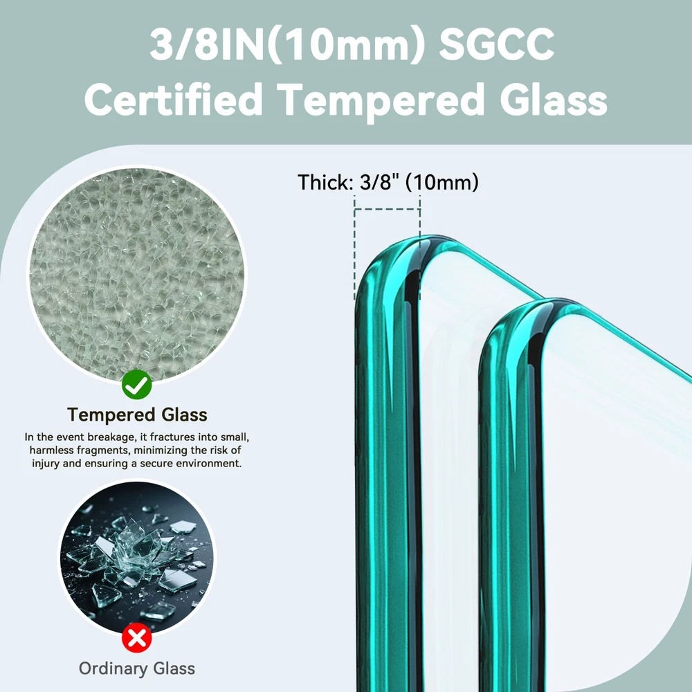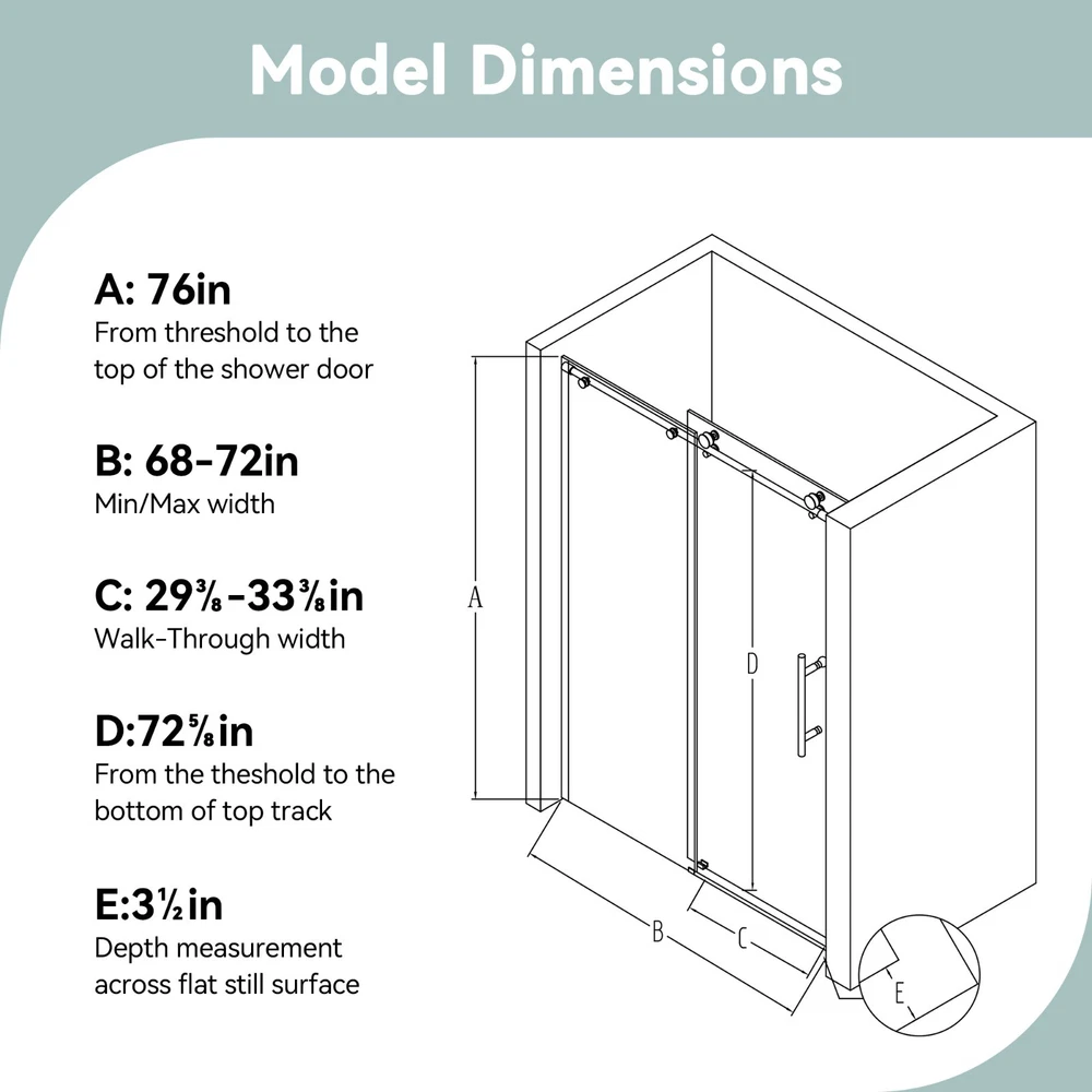Features: Tempered Glass Item Length: 68-72'' Item Weight: 210 lb Glass Thickness: 3/8" (10mm) SGCC Suitable For: Shower Set Includes: Shower Door Item Height: 76'' Maximum Width: 72 in Manufacturer Warranty: 1 Year Assembly Required: Yes Opening Mechanism: Sliding Brand: Unbranded Installation: Screw-In Shape: Rectangle Room: Bathroom Material: Glass, Metal Handle Type: Bar Minimum Width: 68 in Number of Items in Set: 1 Installation Side: Both Sides Country/Region of Manufacture: China Labels & Certifications: SGCC Glass Style: Clear Frame Finish: Matte Type: Shower Door Frame Material: Stainless Steel Color: Brushed Nickel Personalize: No Frame Type: Frameless