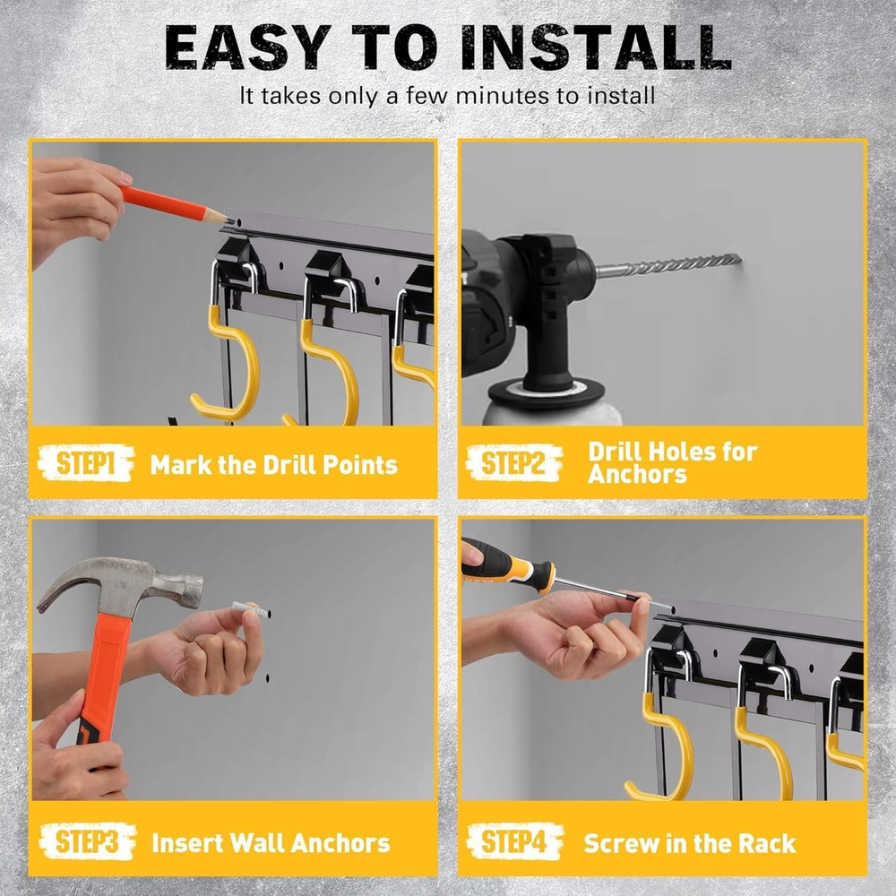 ALL-METAL DURABILITY - Built entirely from iron, this garden tool organizer boasts exceptional strength and stability. Unlike typical ABS hooks, our heavy-duty garage storage solution withstands the weight of shovels, rakes, and more without bending or breaking. VERSATILE ORGANIZATION - This all-in-one garage tool organizer features 20 adjustable, non-slip coated hooks, 24 fixed metal hooks, and 8 V-angle hooks, accommodating a wide range of tools such as mops, brooms, shovels, and rakes. With 16 heavy-duty screws and 16 durable dowels, it ensures stability and keeps your space tidy and accessible. ADJUSTABLE DESIGN - The garage tool organizer wall mount comes with adjustable hooks that can be easily repositioned to fit your needs. Perfect for organizing various tools, it adapts to different sizes and shapes, providing flexible garage storage solutions. LONG-LASTING RUST PROTECTION - Designed for both indoor and outdoor use, this garage organizer features anti-corrosion coating to withstand harsh conditions. Enjoy a tool organizer that resists rust and aging, ensuring long-lasting performance in any setting. EASY INSTALLATION - Quickly set up your garage tool organizer wall mount with included ABS nails, screws, and dowels. This garage organizer installs securely on any wall, making setup a breeze and saving valuable time. Product Description