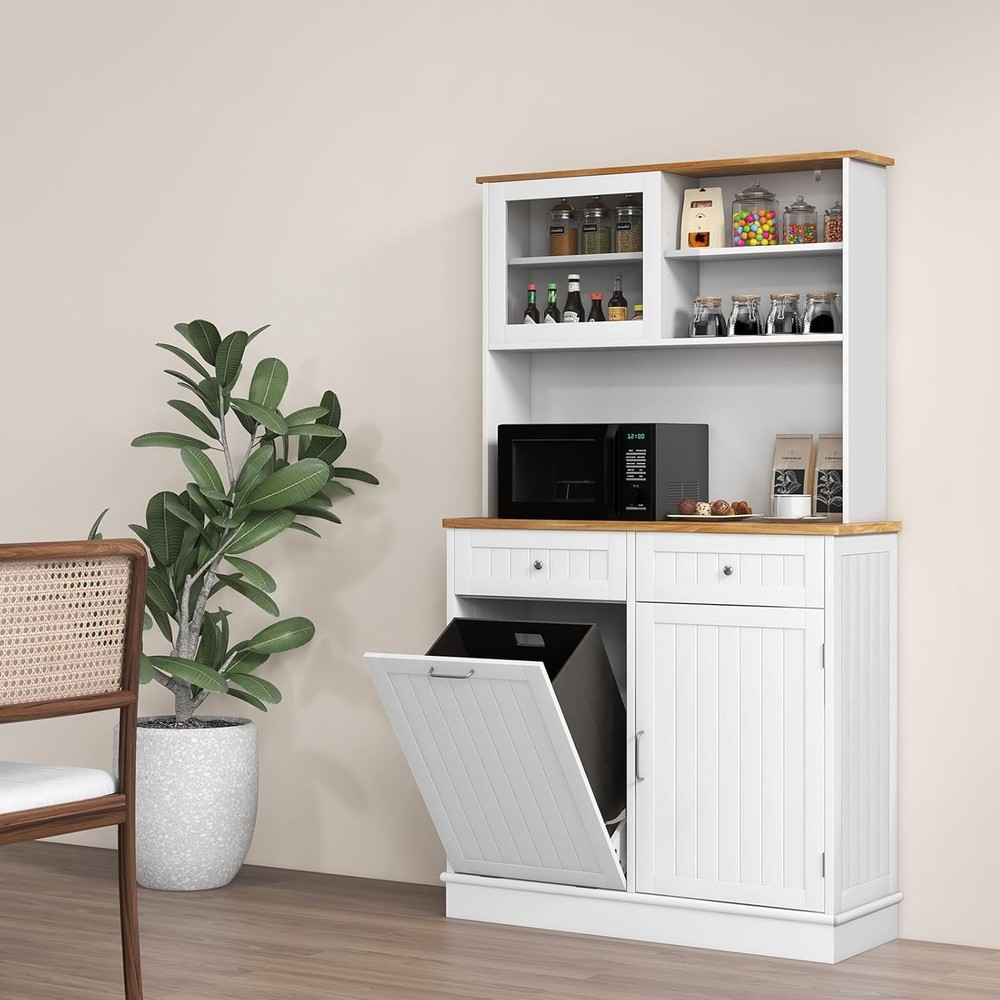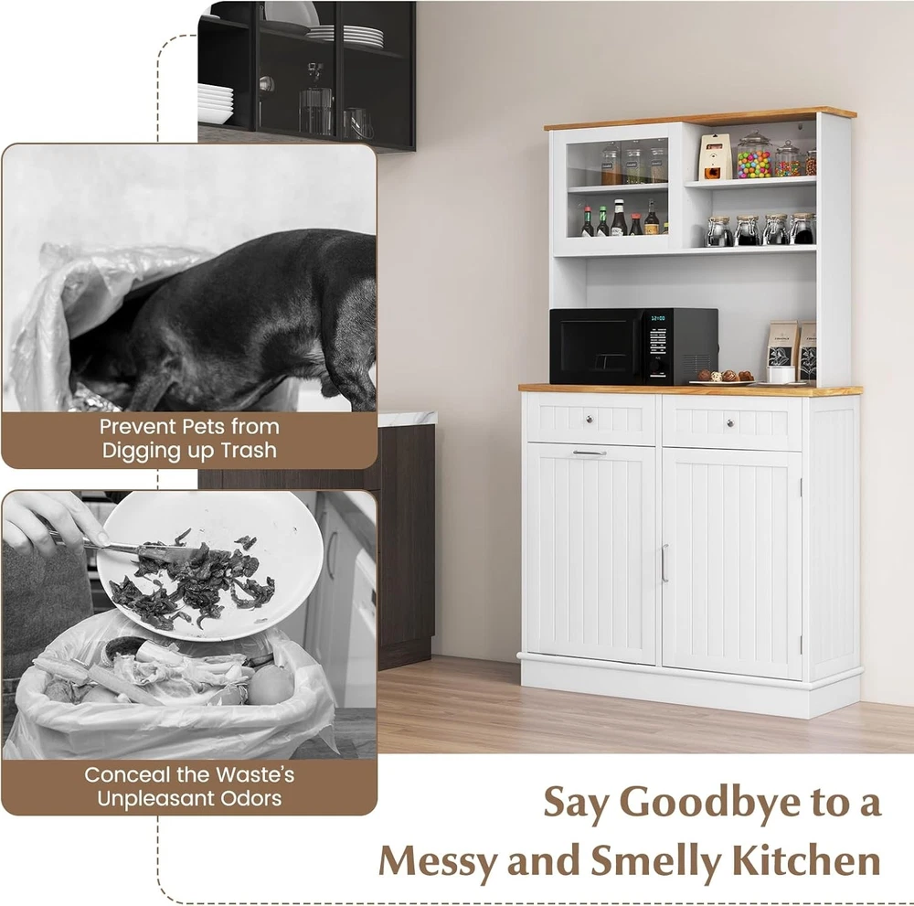 Product Description About this item Multifunctional Hutch Cabinet: 68” tall buffet cabinet combines the functions of closet, bar, T tilting garbage cabinet, storage cabinet and so on. Can be used as hutch cabinet, kitchen island, buffet sideboard, coffee bar cabinet, laundry basket. Large & Sorted Storage Space: Featuring storage hutch, 2 drawers and bottom cabinet, the pantry cabinet provides versatile storage options for your kitchen supplies. Plus, wide rubber wood countertop with cable management hole is a convenient spot to keep appliances with reach. Hidden Garbage Holder: This kitchen hutch cabinet features a hidden 10-gallon holder to conceal the waste’s unpleasant odors and prevent pets from digging up trash. Can not only this tilt out trash bin cabinet serve to be a waste bin in the kitchen, but also be used as a laundry basket in the laundry room, a recycle bin, a pet food bin in the living room. Note: Trash Bin is not included. Use with Convenience: The 3-position adjustable shelves in the food cabinet can maximize the storage capacity of upper and bottom cabinets, ensuring efficient utilization of space. In addition, the sliding tempered glass cabinet allows for more storage convenience. Plus, provides cable management holes for organizing cords. High Reliable Structure: Thickened board with tight connection casts a firmly constructed kitchen cupboard. When set against the wall, the kitchen hutch with trash can storage hold in place with anti-tip devices to prevent rocking or tipping. Description: Say goodbye to a messy and smelly kitchen! This kitchen pantry cabinet features a hidden 10-gallon garbage holder, allowing you to conveniently dispose of waste while keeping it out of sight. With a spacious countertop and drawers, you will get ample storage space for essentials. The adjustable shelves provide flexibility to accommodate your storage needs for various items. Besides, the sliding tempered glass cabinet not only adds display options but also protects your belongings. Meanwhile, specially designed with anti-toppling device, the floor trash cabinet is stable enough to hold kitchen utensils without wobbling.This modern tall kitchen cupboard can be used as recycling cabinet, pet food storage cabinet and laundry sorted cabinet, providing versatility and convenience. Features: 10 gallon trash cabinet can keep pets away from waste and hide smell Rubber wood countertop is sturdy and durable for a long life span Storage cabinets with 3-position adjustable shelves fit different sized items Sliding tempered glass cabinet for easy access 2 drawers provide ample classified space for kitchen supplies Secure the trash can cabinet with anti-toppling device for higher stability Cable hole keep the messy wires hidden at the back Equipped with sturdy metal hinge for 30°max opening angle Smooth metal slides make it convenient to push in and pull out Widely use as a trash cabinet, laundry sorter or recycle bin Specifications: Color: White + Natural Material: MDF, Rubber Wood, Tempered Glass Overall Dimensions: 39.5" x 13.5" x 68" (L x W x H) Upper Storage Cabinet Interior Dimensions (Each): 17.5" x 6.5" x 7.5" (L x W x H) Countertop Dimensions: 39.5" x 12.5" x 16" (L x W x H) Left Side Cabinet Panel: 18" x 24.5" (L x H) Right Side Cabinet Upper Storage Compartment: 18" x 12.5" x 10" (L x W x H) Right Side Cabinet Lower Storage Compartment: 18" x 12.5" x 14" (L x W x H) Drawer Interior Dimensions: 15.5" x 11.5" x 3" (L x W x H) Weight Capacity in Total: 300 lbs Net Weight: 89 lbs Max Opening Angle: 30° Package Includes: 1 x Tilt Out Trash Cabinet 1 x Instruction
