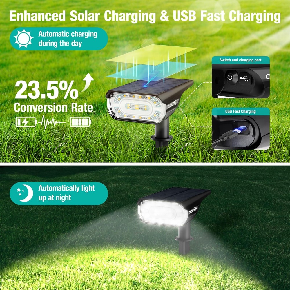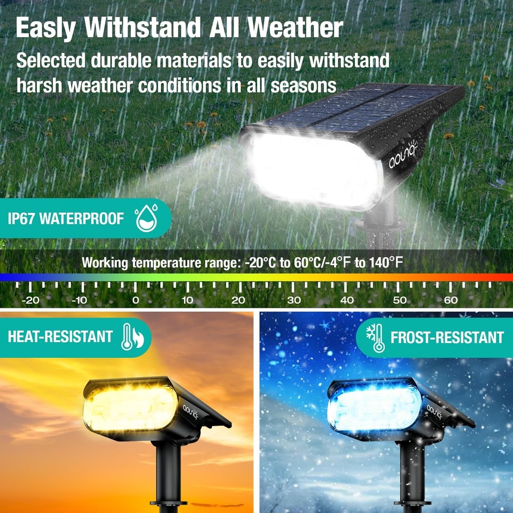 68 LEDs RGBW Solar Spot Lights Outdoor, 1000 Lumens 9 Lighting Modes Color Changing Solar Outdoor Lights, IP67 Waterproof Solar Spotlight 2-in-1 Landscape Garden Light for Yard Patio, 4 Pack Product Details Color: Multi-colored-4Pack Brand: AOUNQ MPN: AO-AO-USA 64LED Color UPC: 726929081462 EAN: 0726929081462 Brand: AOUNQ Color: Multi-colored-4Pack Material: High-impact ABS Plastic, High Efficiency Monocrystalline Silicon Style: Garden Light fixture form: Spotlight Product Dimensions : 5.7 x 4.13 x 9.84 inches; 2.42 Pounds Item model number : AO-AO-USA 64LED Color Batteries : 1 Lithium Ion batteries required. (included) Date First Available : September 20, 2023 Manufacturer : AOUNQ Country of Origin : China Customer Reviews: 4.0 4.0 out of 5 stars 253 ratings Brand: AOUNQ Color: Multi-colored-4Pack Material: High-impact ABS Plastic, High Efficiency Monocrystalline Silicon Style: Garden Light fixture form: Spotlight Room Type: Yard Product Dimensions: 5.7"L x 4.13"W x 9.84"H Specific Uses For Product: Provides bright and beautiful lighting for patios, decks, porches, walls, gardens, landscaping, pathways, flags, decorations, lawns, backyards, and more Indoor/Outdoor Usage: Outdoor Power Source: Battery-powered, Solar-powered, Or USB Charge Installation Type: 2-IN-1 Solar Spot Lights Outdoor: 1.With ground stakes and wall mounts. you can easily insert it into the ground as a solar landscape lights.2.Use screws (included) to fix it on the wall as a wall light Special Feature: Adjustable Color Temperature, New Super Bright 64 LEDs Solar Outdoor Lights for Yard Control Method: Touch Light Source Type: LED Finish Type: Polished Number of Light Sources: 64 Voltage: 5.5 Volts Theme: Flag Light Color: Multicolor Included Components: 4-pack lights in One Package, Each light consists of 64 led light Bulbs. Lighting Method: Adjustable Item Weight: 2.42 Pounds Number of Items: 4 Wattage: 2.1 watts Controller Type: Push Button Switch Type: Push Button Unit Count: 4.0 Count Water Resistance Level: Waterproof Brightness: 1000 Lumen Mounting Type: Wall Mount Fixture Type: Non Removable Assembly Required: No Manufacturer: AOUNQ UPC: 726929081462 Recommended Uses For Product: Light up trees or flags, porches, paths, swimming pools, patios, gardens, garages, driveways, paths, and more. Model Name: AO-AO-USA 64LED Color Part Number: AO-64-color Item Weight: 2.42 pounds Country of Origin: China Item model number: AO-AO-USA 64LED Color Batteries: 1 Lithium Ion batteries required. (included) Finish types: Polished Special Features: Adjustable Color Temperature, New Super Bright 64 LEDs Solar Outdoor Lights for Yard Batteries Included?: Yes Batteries Required?: Yes Bulb Features: Dimmable Color Temperature: 6500 Kelvin Date First Available: September 20, 2023 Super Bright 64 LEDs RGBW Solar Landscape Spotlight: The upgraded outdoor solar spotlight is equipped with an astonishing 64 RGBW LEDs (market leading), scientific and efficient LED arrangement makes it easy to generate 2700K~6500K+ 120o wide angle light output up to 1000 lm. Solar Spot Lights create the perfect lighting effect whether installed in the garden, yard or garage, pathway, etc. And let you enjoy the beautiful colored lights on the dark night without paying high electricity bills. 9 Lighting Modes of Outdoor Solar Lights & Auto ON/OFF: The solar lights outdoor waterproof have 9 lighting modes set to meet your needs in different scenarios-White, Rainbow, Red, Green, Blue, Lemon Yellow, Purple, Cyan, Color cycling, you can switch between modes by button. The solar panel of the solar spot lights have a light sensor, which can be automatically turned on and off according to the change of light in the environment. High-impact Material & IP67 Waterproof: High-strength PC+ABS material and thickened waterproof silicone layer design make the solar spotlights outdoor waterproof have strong IP67 waterproof and High-impact characteristics, can withstand the minimum -4F, the maximum 160F the external ambient temperature. Whether it is severe weather such as storm, heavy rain, snow, high temperature or other extreme weather, you can use solar lights with confidence. Efficient Solar or USB Charging & Longer Lighting Time: In addition to being equipped with larger area, more efficient polycrystalline silicon solar panels and 2000mAh battery, spot lights outdoor also supports "solar or USB charging" charging method, which can provide you with up to 20+ hours of lighting time in daily life; even in continuous cloudy days or lack of sunlight in winter, it can be powered by a USB charging cable (included) Fast charging, easy to solve your electricity anxiety. BUY "ONE" GET "TWO" - 2 In 1 Function & Easy Installation: With ground stakes and wall mounts, you can easily insert it into the ground as a solar landscape lights to illuminate your palm trees, agave, etc. It is fixed to the wall as a solar wall lights (with screws) to illuminate flag or wall. Both installations are easy to install and perfect for house, front door, yard, patio, fencing, garden, swimming pool, garage, driveway, pathway, porch, deck, flower bed and landscape lighting and more.