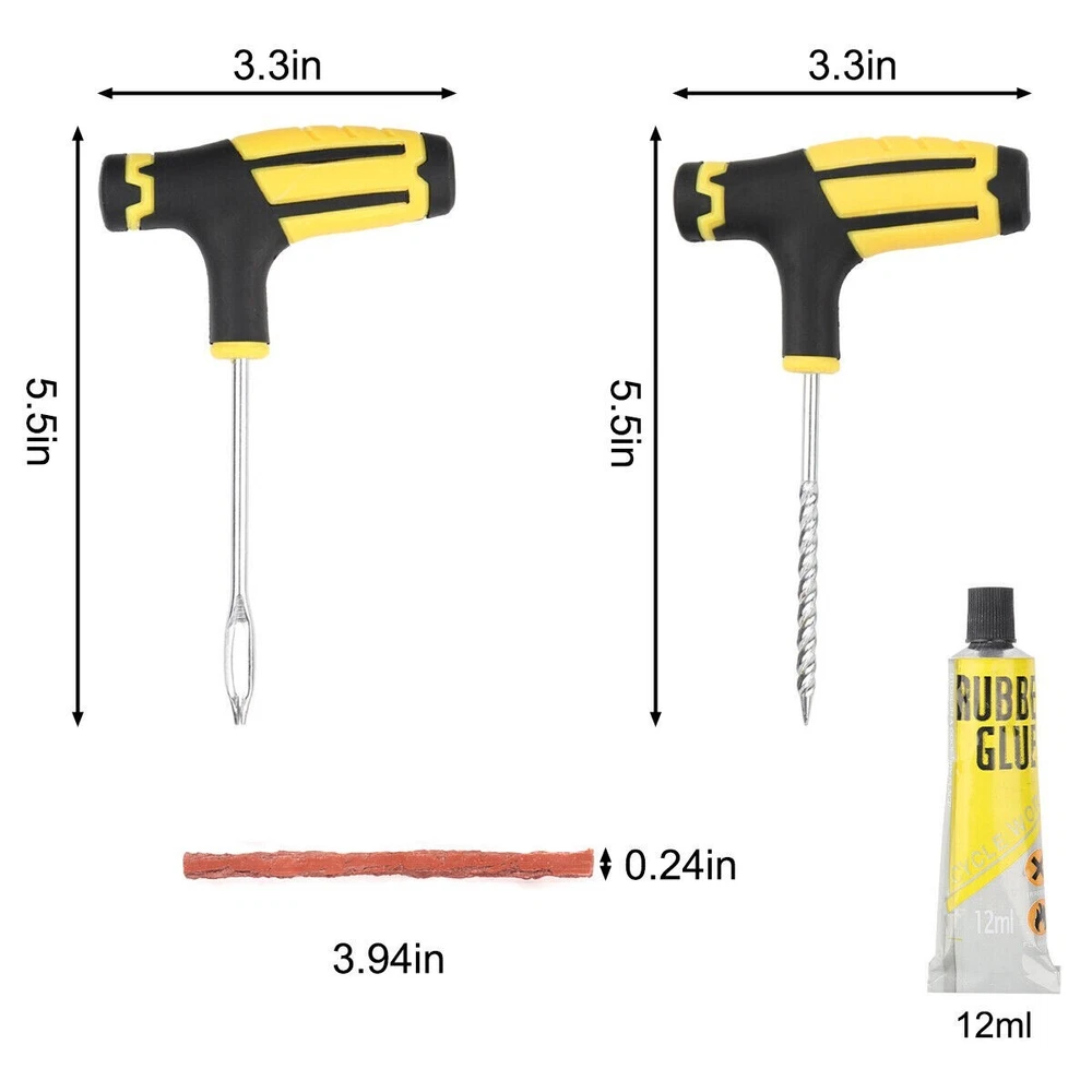68pc Tire Repair Kit DIY Flat Tire Repair Car Truck Motorcycle Home Plug Patch Item Description 68PCS Tyre Repair Kits Material: ABS+Steel+ Vulcanized Rubber Color: Brown+Yellow+Black Size: As Picture Show Package Include: 1X Rasper Tool 1X Needle Reamer Tool 1X Rubber Solution 65X Tyre Bar Features: 1. With high-level upgrade glue bar - the heavy brown glue bar (65pcs) can provide excellent security sealing. It is stronger and better than the cheap string in the budget kit. Every aspect of our tire plug kit is designed very strongly. 2. It adopts a universal flat tire repair kit - cars, motorcycles, ATV, tractors, grass cutters, RVs, off-road bicycles, trailers, SUVs, trucks and spare tire repair kits. With 65 Superior Brown tire plugs, make it the best sub -tire repair kit. 3. The product adopts high- quality professional tools- our tire burst maintenance kit includes a pair of strong high-quality tools. This is a major upgrade of the cheap tools in other tire plug repair packs. 4. With T-shaped handle tools that conform to ergonomic design-tools suitable for this job can easily repair the perforation of internal tireless tires in a few minutes. Our portable tire repair kit includes a color description that is easy to understand and easy to follow.