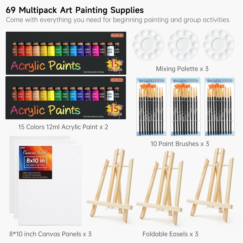 Store New Arrivals Add to Favorite View Feedback Contact Fast deliveries to the customer's home Quality customer service John Make the customers happy! 69 Pack Acrylic Paint Set, Acrylic Painting Set with 2 Pack of 15 Colors Acrylic Paint, 3 Sets of Wooden Easels, Canvas, Brushes & Palettes, Art Painting Supplies for Kids Adults Beginner Description 69 PACK COMPLETE SET : Shuttle Art 60 pack acrylic paint set contains 2 sets of 15 colors acrylic paints (12 ml tube) and 3 wooded easels, 3 sets of paint brushes (10 of each), 3 canvas and 3 mixing palettes. One set for each hand, open and start painting PREMIUM QUALITY : Artist grade acrylic paint bring bright colors, thick and creamy texture, as well as incredible consistency to painters. Foldable wooden easels, brushes and mixing palettes are reusable for many years when well-preserved FOR MULTIPLE PURPOSE : With enough paints, tools and painting accessories, this art painting set satisfy multiple people painting at the same time, perfect for family activities, parties, date night, group works and more. Ideal for kids, adults, beginners and art lovers NON-TOXIC & CERTIFICATED : Conforms to U.S. ASTM D-4236 & EN71-3, non-toxic and acid-free, safe and suitable for all ages SERVICE GUARANTEE : Your satisfaction is our top priority, please rest assured to purchase our products. If you are not satisfied with our products or have any questions, please feel free to contact us at any time Product Description 1 PAINT 2 MARKERS 3 PEN 4 PENCILS 5 SCHOOL&OFFICE ARTIST QUALITY PAINTS Rich & Vibrant Colors Rich pigments and high viscosity, easy to blend and layer. Ideal for Painting & Crafting Turn out vivid colors and smooth consistency on canvas. Complete Accessories & Giftable Package Perfect for Beginners & Group Activities Contian canvases, brushes, easels, mixing palettes and paints that are essential for impromptu painting. Giftable Choice for Artists Packaged in a nice sturdy box, ideal gifts for kids, beginners and hobbyists. Item Package Quantity 1 Item dimensions L x W x H 12 x 8.1 x 4.7 inches Finish Satin Included Components brushes Color 15×2 Colors Size 69 Pack Material Wood, Canvas, Acrylic Style 69 Pack Item Weight 3.74 pounds Batteries Included? No Age Range (Description) Kid Batteries Required? No Seasons All Seasons Special Features Non Toxic Special Feature Non Toxic Product Dimensions 12 x 8.1 x 4.7 inches Paint Type Acrylic Number of Pieces 2 ABOUT US We offer the best prices around on high quality products. Our E-store includes media such as books, movies, music and games while offering electronics, toys, sporting apparel, clothing, tools, general home, garden items and more. SHIPPING We are always working hard to ensure your package arrives as soon as possible. Please understand that some factors like weather, high postal traffic, and the performance of shipping companies are outside of our control. We offer free shipping to the lower 48 states and ship within 2 business days of payment, usually sooner. We do not accept P.O. Boxes. Please provide a physical address. For shipping outside of the continental USA, we only use eBay's Global Shipping Program. The item is shipped to KY and then sent to the rest of the world. International customers are responsible for all duties and taxes. Continue to 'check out' to calculate costs for shipping the item to your country. Messages regarding eBay's Global Shipping Program MUST be directed at eBay EXCLUSIVELY. RETURNS We offer a 30-Day Return Policy on items in which you are not completely satisfied with. You have the option of a full-refund or an exchange of the item. No returns are available on items shipped outside of the USA PAYMENT We accept PayPal. CONTACT US This page content is yet to come Please ad us to your favorite seller and visit again later Thank You CUSTOMER SATISFACTION We try our very best to make sure every customer is completely satisfied. If there's a problem, message us! We're happy to help. WE ACCEPT