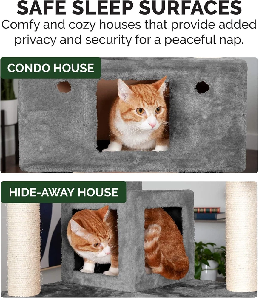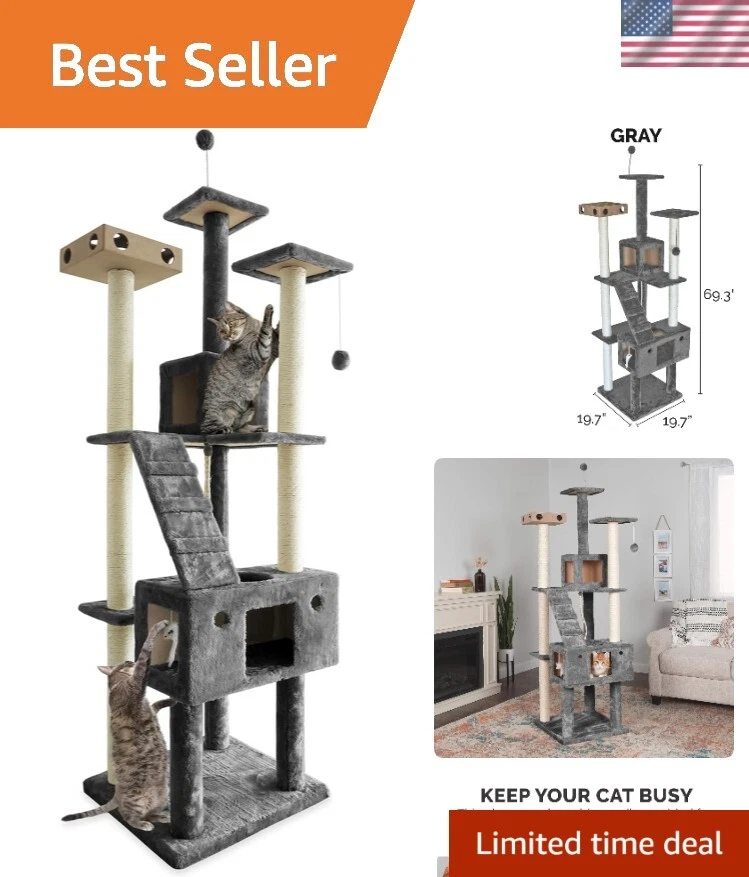 " Tall Cat Tree for Indoor Cats, Ft. Sisal Scratching Posts, 2x Cat Condos, & Toys - Tiger Tough Double Decker Interactive Playground Tower - Silver Gray, One Size FUN AND PLAY: The tall cat tree tower playground features plenty of activities and entertainment to keep your cat engaged and mentally stimulated, such as sisal posts, plush ball toys, a prey toy, a hanging rope, and an interactive cat IQ busy box TOWER DESIGN: The towering multi-level design of the cat tree playground promotes climbing and exercise, which helps encourage and motivate felines into a healthier and active lifestyle SCRATCH POST: The cat scratching posts are wrapped in sisal fiber, which carries the rough, bark-like texture of a tree to better satisfy your cat's scratching needs; sisal is also durable, long-lasting, and economical PRODUCT DETAILS: Silver Gray; " x " x " AVAILABLE VARIANTS: The cat playground comes in Cream and Silver Gray EASY CARE: The cat tree is made easy to clean for your convenience; for more specific cleaning instructions, please refer to the hang tag and/or seam label (if applicable) Age range description: all stages Your cat will love the Tiger Tough Cat Tree Double Decker Playground! It features two separate enclosed cat condos, a Cat-IQ busy box, dangling mouse toy, sisal scratching posts, a dangling ball and springy-wand ball cat toys! This tall 5-ft. 8-in. cat tower has multiple levels of enjoyment, and whether your kitty is on the lower level playing with the dangling mouse toy, relaxing in privacy in one of the kitty condos, or stretching on an upper cat perch to play with the Cat-IQ Buys Box, you will know that your cat is happy and safe. The bottom base is large and sturdy, and to keep it interesting, the fabric-covered cat shelves, and the cat houses, come in different shapes and sizes. Several tall columns keep the cat tree secure and are covered with sisal rope-covered cat scratching posts for your cat’s scratching training and pleasure. The cat condo on the second level has a cat ladder that reaches up to the second cat house, and your kitty will want to climb to the upper levels and play with the Cat-IQ busy box, the dangling cat toy, and the spring-y ball toy. Your kitty will get plenty exercise jumping, stretching, and playing on this amazing piece of cat furniture. The Double Decker Playground cat tree is easy to clean by spot-washing with a damp cloth and vacuuming it when needed.