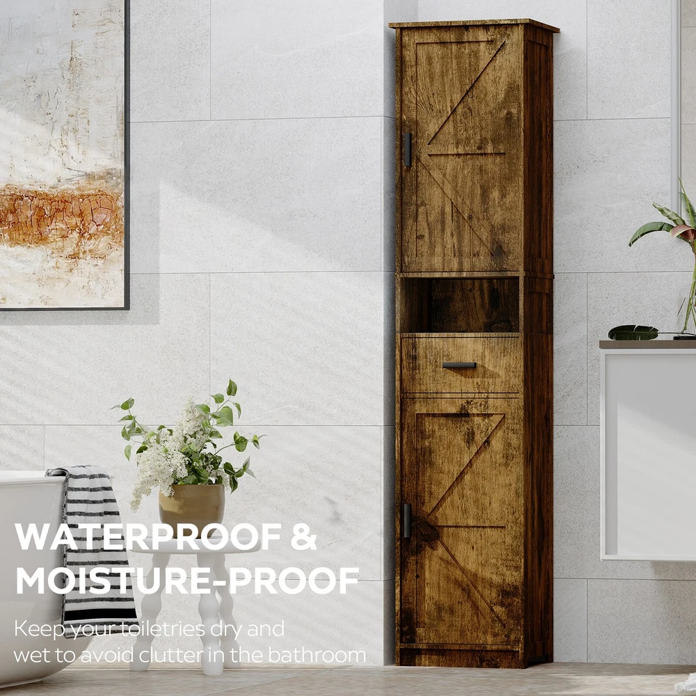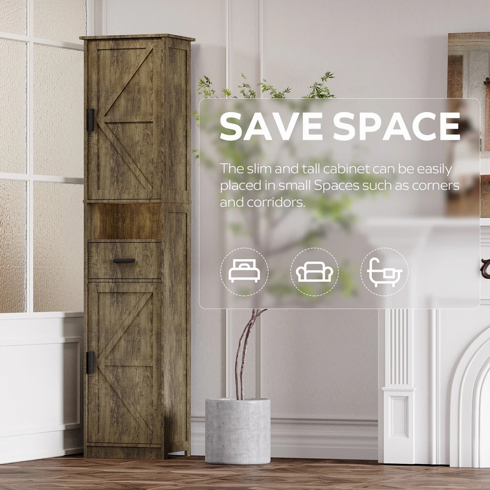 69" Tall Storage Cabinet with 2 Doors, 1 Drawer and Adjustable Shelves, Bathroom Product Features 【Large Storage Space】This tall storage cabinet cleverly combines adjustable shelf space and hidden cabinets to provide ample storage space. It has 2 doors 1 drawer 7 storage spaces. The upper cabinet can store your beauty products, the lower cabinet can store heavy objects and sundries. 【Multipurpose】This floor storage cabinet is very practical, not only can be used as a sideboard suitable for kitchen, but also can be used as bathroom storage cabinet, living room floor cabinet, or even a bookcase in your home office, it depends on you. 【First Choice for Small Spaces】Slim design of narrow storage cabinet, small footprint, only 15.75"W X 11.81"D X 68.9"H, perfect for narrow corners, and is a great choice for urban small apartments and small spaces. 【Stable and Durable】This narrow tall cabinet is made of high-quality particleboard, giving you long-lasting durability and extraordinary experience. Meanwhile, 4 solid wood legs on the bottom and an anti-tip kit on the back add extra stability. Description