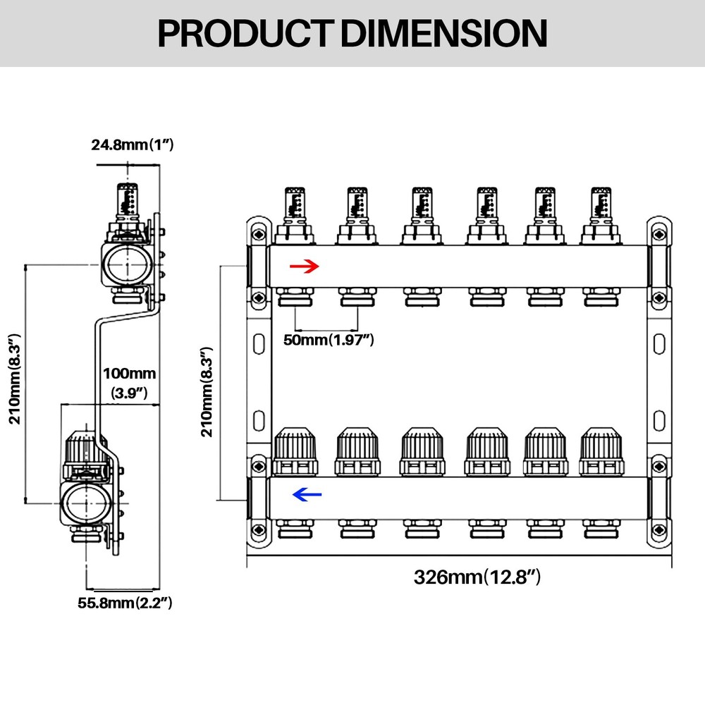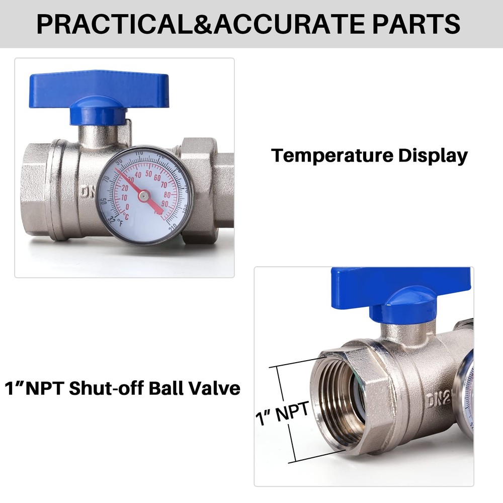 Specifications: Connection Size (Supply / Return): 1" NPT Material: Stainless Steel Temperature Gauge: Fahrenheit and Celsius The tail end: Automatic exhaust valve and drain valve Branch Connection Adapters/Nuts: 1/2'' (Included) [Product Parameters]:6 loops;1"NPT main inlet&outlet valves; the thermometer is equipped with an integrated thermometer for Fahrenheit and Celsius, which is more convenient to observe the temperature; all-copper globe valve core; large-diameter pipeline;the maximum flow rate: 1.4GPM. [High Quality]The radiant floor heating manifold kit is made of high-quality 304 stainless steel. The tube body is demagnetized and does not absorb impurities, which can effectively avoid internal blockage; corrosion resistance, ensuring safe water use. [Visual Flow Meter] Visually and accurately adjust the flow of each channel, and the flow of each channel can be adjusted to a consistent scale, so that the water flow of each channel is balanced, and there will be no water grabbing phenomenon. [Easy to Install]Simple installation steps, just use regular pliers or wrench to fix the main tube on the bracket, no PEX tools are required; the radiant manifold kit includes heavy-duty stainless steel mounting brackets, making it easy to install on the wall. [All-Copper Adapter]Equipped with 1/2" Adapter,Compatible with 1/2" PEX pipe (12 pcs); all-copper floor heating pipe adapter joint, independent valve core, high-quality sealing ring, more firm and tighter; easy to disassembly,more convenient to replace and clean.