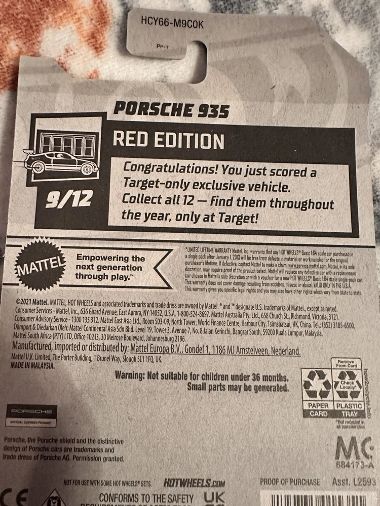 Recommended Age Range:3+Age Level:3-4 Years, 8-11 Years, 12-16 YearsMaterial:Diecastgtin13:Does not applyModel:HCV57M9C0BTheme:Target Red EditionBrand:Hot WheelsColor:RedModified Item:NoFeatures:Unopened BoxScale:1:64Gender:Boys & GirlsVehicle Type:CarSeries:Target Red EditionVehicle Make:PorscheCharacter Family:CarsCountry/Region of Manufacture:MalaysiaCustom Bundle:NoUPC:Does not apply