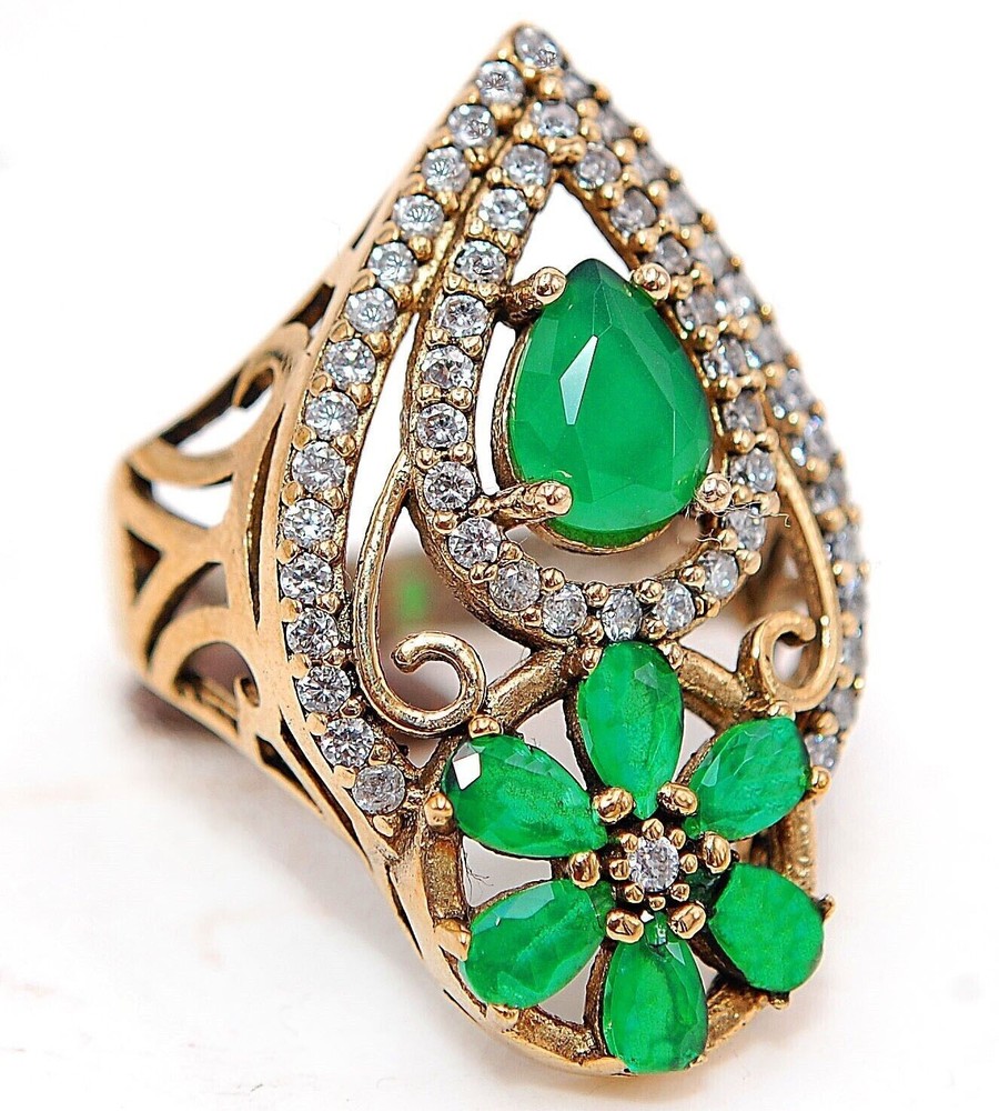 Menu Store FAQ Payment Shipping returns Feedback CONTACT US SHOP BY RING SIZE 4 4.5 5 5.5 6 6.5 7 7.5 8 8.5 9 9.5 10 10.5 11 11.5 All STORE CATEGORIES 99 cent daily deals Auctions Ending Soon New Arrivals Buy it now Rings Pendants Earrings Necklace Bangles & Bracelets POPULAR STONES Aquamarine Ruby Sapphire Pink Sapphire TREATED EMERALD Topaz Opal Pearl Amethyst Blue Topaz Kunzite Herkimer Diamond Hand Carved Fossils Citrine Garnet Alexandrite Natural Rough Two-Tone Sterling Silver Store Newsletter Add old-english-silver to your Favorites and receive our e-mail newsletters about new items and special promotions. General Interest Sign Up Gemstone : TREATED EMERALD & WHITE TOPAZ Metal : Genuine 925 Solid Sterling Silver Total Carat Wt : 6 Total Gram Wt : 6 Dimensions : 3/4" Long & 1" Wide. Ring Sz : 7 Shipping & Handling