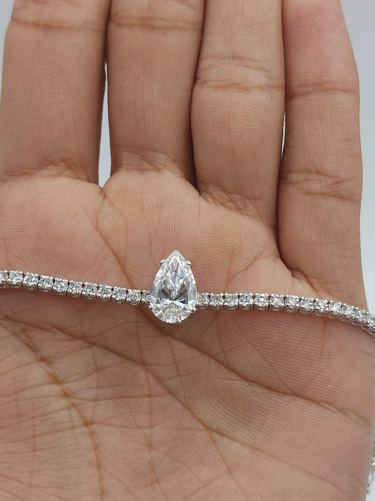 This 6Ct Pear Cut Simulated Diamond 925 Yellow Sterling Silver Women's Tennis Bracelet is a stunning piece of jewelry suitable for various occasions like engagements, weddings, birthdays, and more. The bracelet features a pear-cut simulated diamond in a yellow sterling silver setting with a secure snap closure. It is handmade and adjustable, with a length of 7.5 inches and a charming design that can be personalized as per the buyer's requirements. The tennis link style and eye-clean gemstone clarity grade make this bracelet a beautiful and elegant accessory for any outfit.