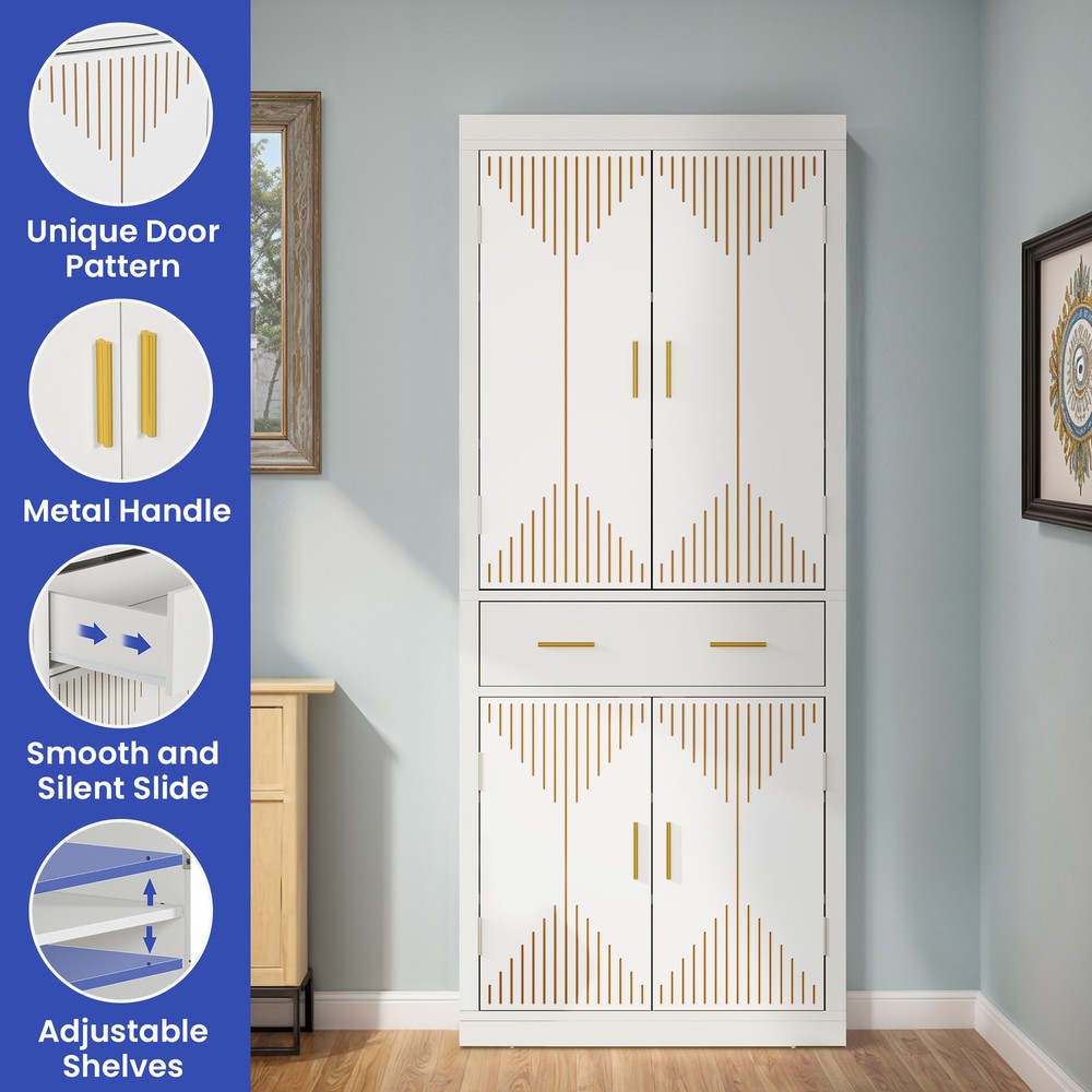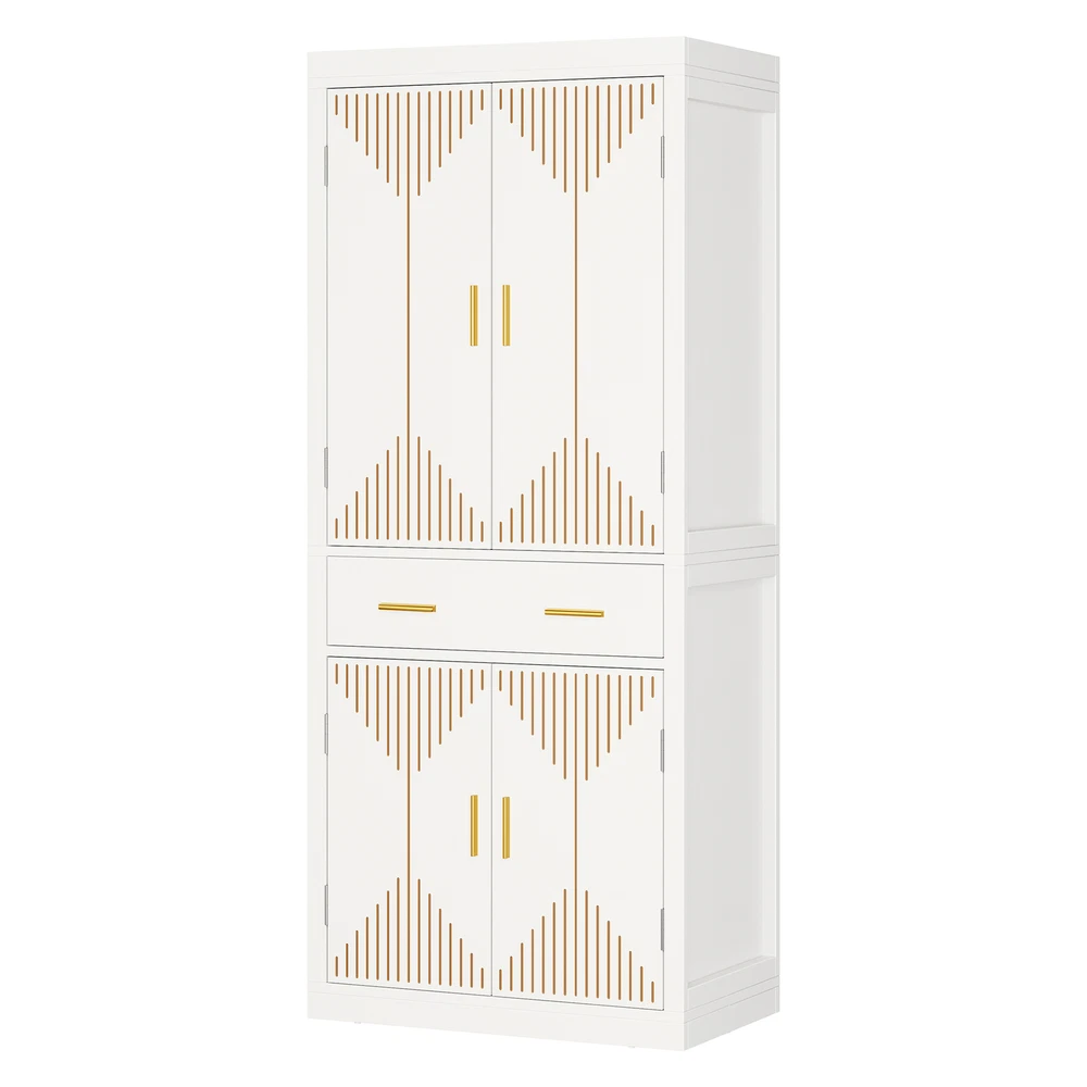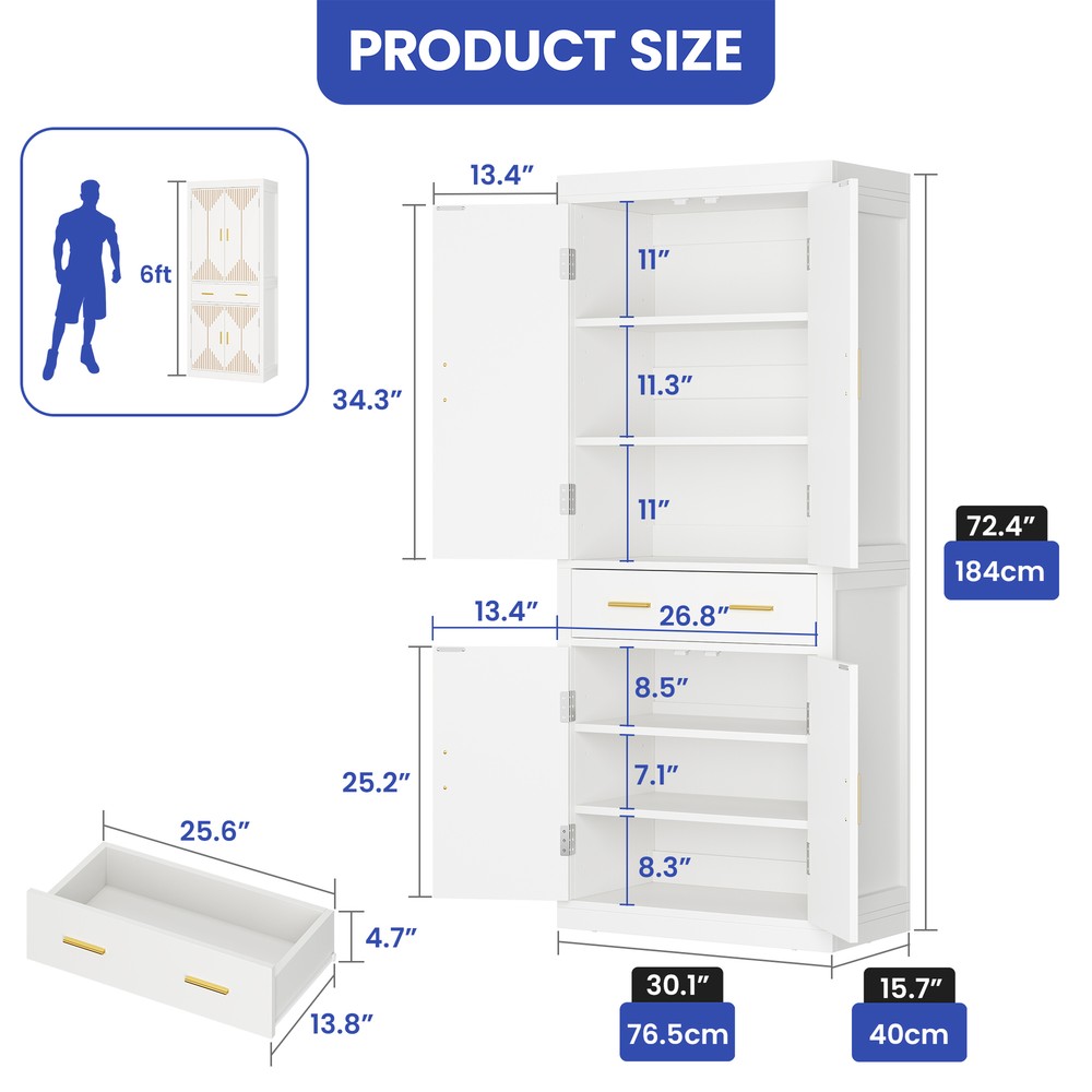 72" Tall Cupboard Storage Cabinet with a Drawer & Adjustable Shelves 4 Doors Freestanding Buffet Food Organizer Carved Design Door for Kitchen, Dining Room, Living Room, White Product Description NOTE: Professional Installation would be Highly Recommended. Description: 1. Color: White 2. Material: Engineered Wood 3. Handle Material: Steel 4. Room Placement Recommendation : Entryway, Kitchen, Living Room, Hallway, Dining Room 5. Special Features : Adjustable Shelf, Anti-tipping, Magnetic Suction, Guide Rail Design, Metal Handle Features: 1. Spacious pantry with lots of storage: This pantry provides generous storage with two large cabinets, one sliding drawer, and six door shelves, offering ample space to organize everything from food supplies to dinnerware and kitchen tools, making it versatile for placement anywhere. 2. Moveable Shelves For Different Sized Things: This modern, freestanding tall kitchen cabinet offers customizable storage with four adjustable shelves. Each of the top and bottom shelves includes dividers that can be set to three different heights, allowing for flexible storage of items in various sizes. 3. Durable Sideboard with Safety Features: This sideboard is constructed from high-quality engineered wood, ensuring durability and stability with a weight capacity of 300 lbs. It features magnetic supports for easy door operation, water-resistant coatings for longevity, and an anti-tip kit for safety, making it a robust and secure storage solution. 4. Multi-purpose Storage Cabinet with Stylish Design: This versatile storage cabinet serves multiple purposes: it can be a pantry in the kitchen, a bookcase in the study, or even a TV stand in the living room. Its unique triangle carvings and modern gold handles add style and functionality, making it a stylish and practical addition to any space 5. Stylish and Practical Pantry Cabinet: This artistic pantry cabinet features a unique inverted triangle carving and modern gold handles, adding style and character to your space. Its design not only enhances the look of your kitchen but also makes cleaning the floor easier. 6. Easy to Assemble: The cabinet is easy to assemble with clear, step-by-step instructions and numbered parts. For quicker setup, it is recommended that two people work together to assemble it. Dimensions: 1. Product Dimensions: 30.1"L x 15.7"W x 72.4"H 2. Drawer Dimensions: 25.6"L x 13.8"W x 4.7"H 3. Top Larger Door Dimensions: 13.4"L x 34.3"H 4. Bottom Door Dimensions: 13.4"L x 25.2"H 5. Weight Capacity Each Shelves : 60 lb 6. Weight Capacity: 300lbs Package Included: 1 x Storage Cabinet 1 x Accessory Kit 1 x Instructions Tips 1. Select the appropriate size for your needs prior to purchase. 2. The actual product's color may be a little different compared to website photos. Shipping 1. Normally the item will be dipatched within 1 business day if payment is cleared before 12pm PST. 2. Please verify the correct shipping address in your PayPal account before making the payment. We only dispatch the item to the address that is sent to us at the time of checkout. 3. We don't ship to Hawaii, Alaska, Puerto Rico, APO/FPO/PO Boxes. 4. We don't provide local pick-up service. 5. Normally we will use USPS, UPS, FedEx & LTL to dispatch items. Payment 1. We accept PayPal and credit card. 2. We will ship to the confirmed Paypal shipping address that is provided with the payment only. Return 1. 30 days Money Back Guarantee. 2. Please contact our customer service to receive a RMA form first if want to return the item. 3. All returned items MUST in new condition with the original package. Contact If has any problem, please contact us by sending an ebay message. Our customer service will resolve the problem as soon as possible. On Aug 7, 2024 at 01:12:17 PDT, seller added the following information: On Mar 10, 2025 at 23:38:03 PDT, seller added the following information: