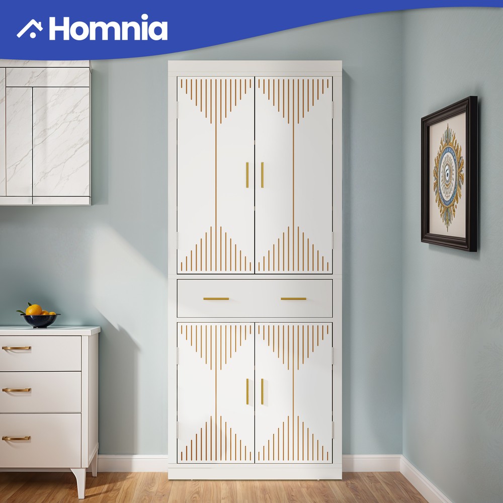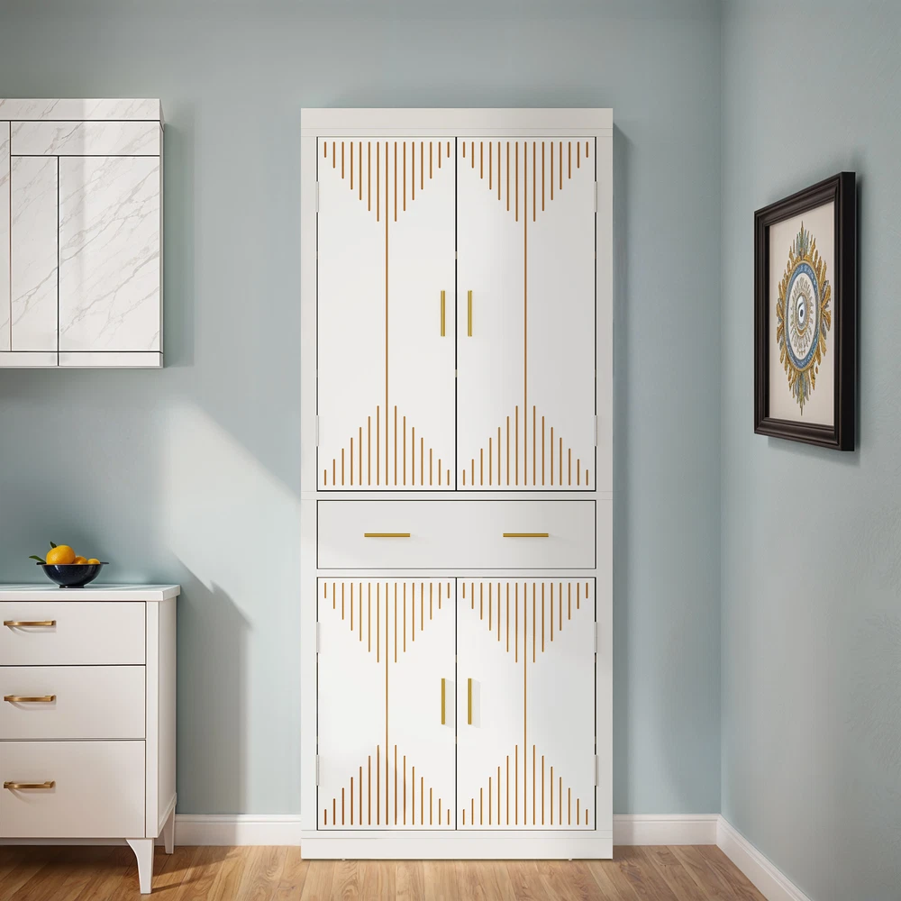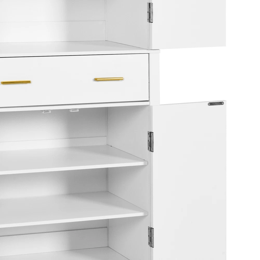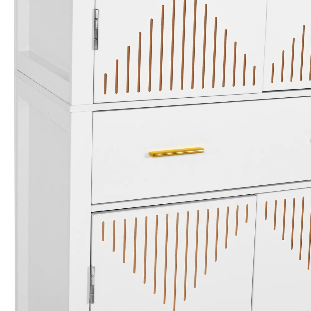 72" Tall Cupboard Storage Cabinet with a Drawer & Adjustable Shelves 4 Doors Freestanding Buffet Food Organizer Carved Design Door for Kitchen, Dining Room, Living Room, White Product Description NOTE: Professional Installation would be Highly Recommended. Description: 1. Color: White 2. Material: Engineered Wood 3. Handle Material: Steel 4. Room Placement Recommendation : Entryway, Kitchen, Living Room, Hallway, Dining Room 5. Special Features : Adjustable Shelf, Anti-tipping, Magnetic Suction, Guide Rail Design, Metal Handle Features: 1. Spacious pantry with lots of storage: This pantry provides generous storage with two large cabinets, one sliding drawer, and six door shelves, offering ample space to organize everything from food supplies to dinnerware and kitchen tools, making it versatile for placement anywhere. 2. Moveable Shelves For Different Sized Things: This modern, freestanding tall kitchen cabinet offers customizable storage with four adjustable shelves. Each of the top and bottom shelves includes dividers that can be set to three different heights, allowing for flexible storage of items in various sizes. 3. Durable Sideboard with Safety Features: This sideboard is constructed from high-quality engineered wood, ensuring durability and stability with a weight capacity of 300 lbs. It features magnetic supports for easy door operation, water-resistant coatings for longevity, and an anti-tip kit for safety, making it a robust and secure storage solution. 4. Multi-purpose Storage Cabinet with Stylish Design: This versatile storage cabinet serves multiple purposes: it can be a pantry in the kitchen, a bookcase in the study, or even a TV stand in the living room. Its unique triangle carvings and modern gold handles add style and functionality, making it a stylish and practical addition to any space 5. Stylish and Practical Pantry Cabinet: This artistic pantry cabinet features a unique inverted triangle carving and modern gold handles, adding style and character to your space. Its design not only enhances the look of your kitchen but also makes cleaning the floor easier. 6. Easy to Assemble: The cabinet is easy to assemble with clear, step-by-step instructions and numbered parts. For quicker setup, it is recommended that two people work together to assemble it. Dimensions: 1. Product Dimensions: 30.1"L x 15.7"W x 72.4"H 2. Drawer Dimensions: 25.6"L x 13.8"W x 4.7"H 3. Top Larger Door Dimensions: 13.4"L x 34.3"H 4. Bottom Door Dimensions: 13.4"L x 25.2"H 5. Weight Capacity Each Shelves : 60 lb 6. Weight Capacity: 300lbs Package Included: 1 x Storage Cabinet 1 x Accessory Kit 1 x Instructions Tips 1. Select the appropriate size for your needs prior to purchase. 2. The actual product's color may be a little different compared to website photos. Shipping 1. Normally the item will be dipatched within 1 business day if payment is cleared before 12pm PST. 2. Please verify the correct shipping address in your PayPal account before making the payment. We only dispatch the item to the address that is sent to us at the time of checkout. 3. We don't ship to Hawaii, Alaska, Puerto Rico, APO/FPO/PO Boxes. 4. We don't provide local pick-up service. 5. Normally we will use USPS, UPS, FedEx & LTL to dispatch items. Payment 1. We accept PayPal and credit card. 2. We will ship to the confirmed Paypal shipping address that is provided with the payment only. Return 1. 30 days Money Back Guarantee. 2. Please contact our customer service to receive a RMA form first if want to return the item. 3. All returned items MUST in new condition with the original package. Contact If has any problem, please contact us by sending an ebay message. Our customer service will resolve the problem as soon as possible. On Aug 7, 2024 at 01:12:17 PDT, seller added the following information: On Mar 10, 2025 at 23:38:03 PDT, seller added the following information: