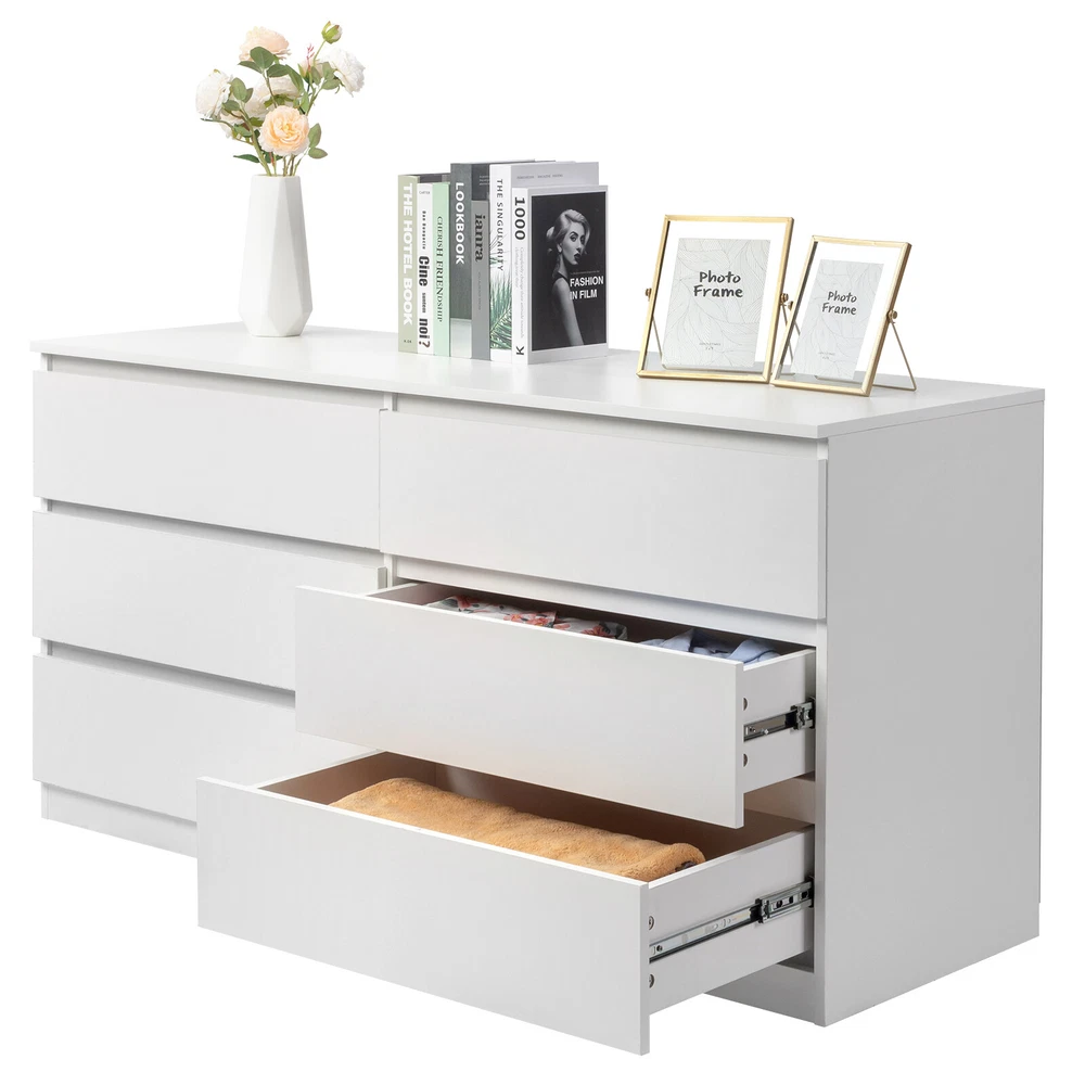 This dresser is a game-changer for bedroom organization! The sturdy P2 particle board construction feels solid, and the smooth-gliding drawers make storage effortless. The sleek white finish fits any decor, while the spacious double design offers tons of room for clothes, linens, or accessories. Perfect for small spaces yet surprisingly roomy—love how it keeps everything tidy without sacrificing style!