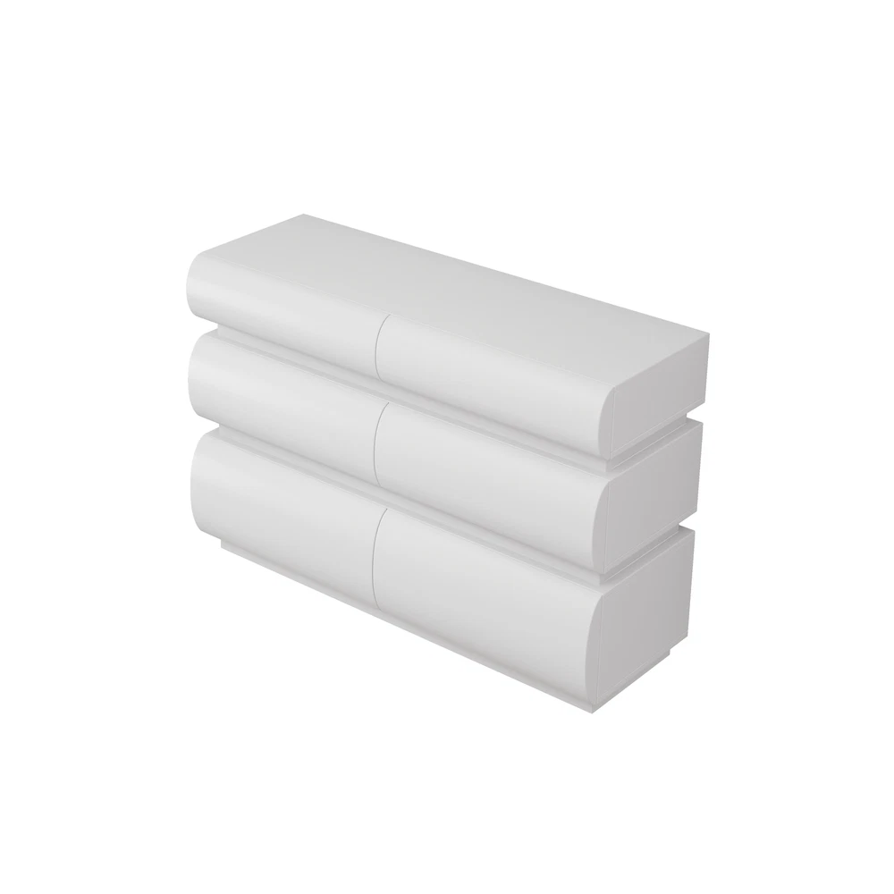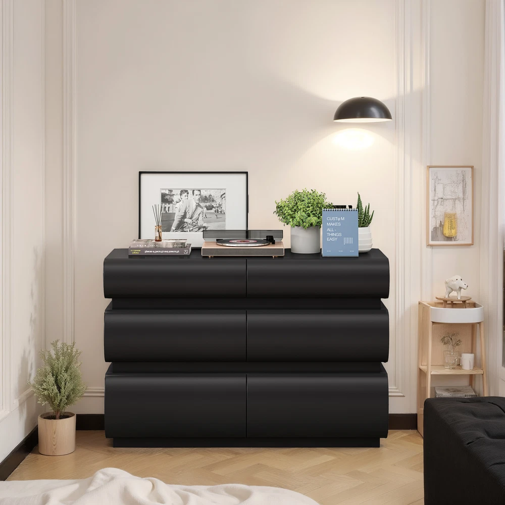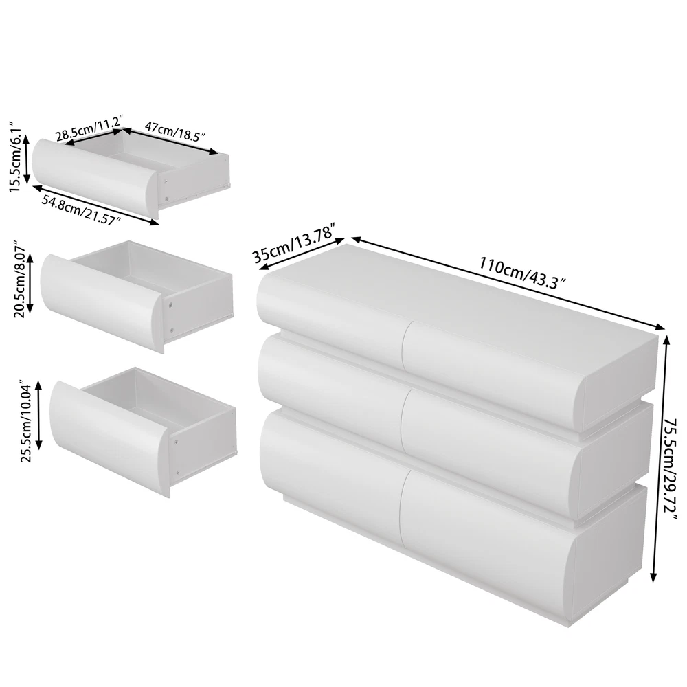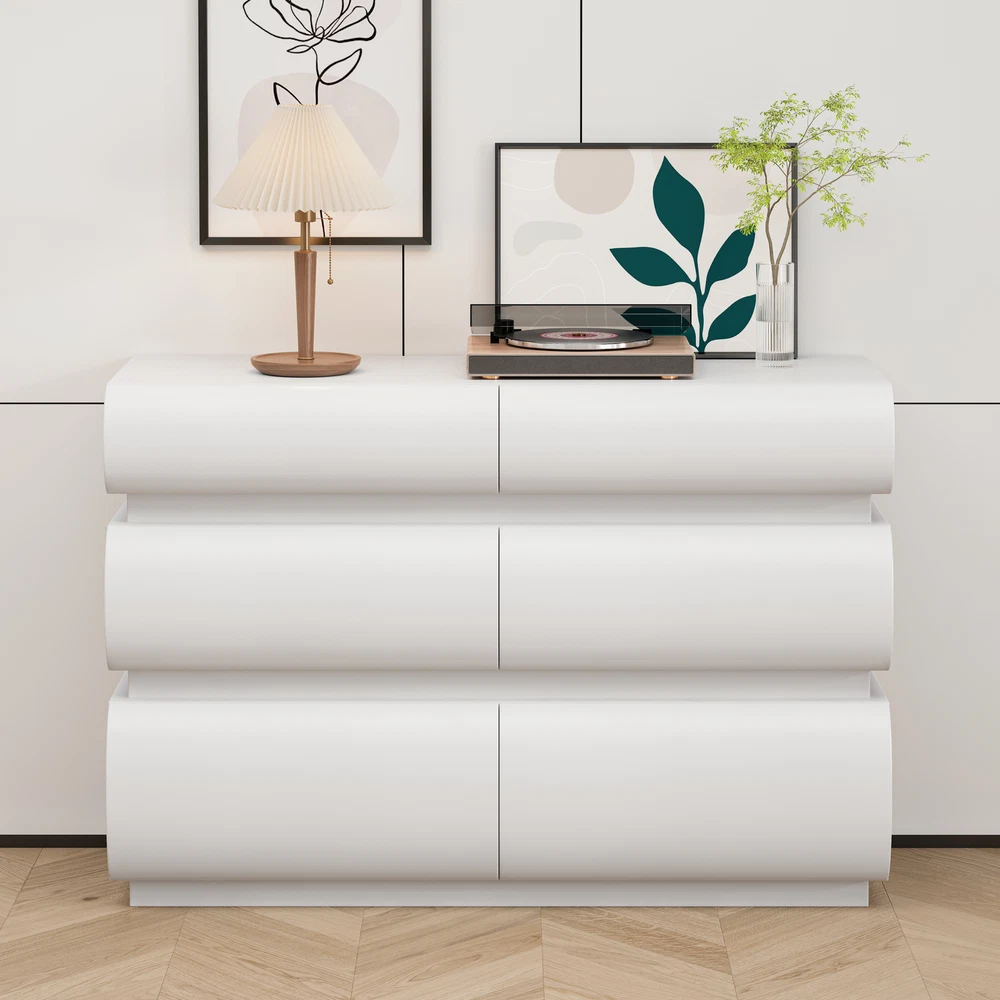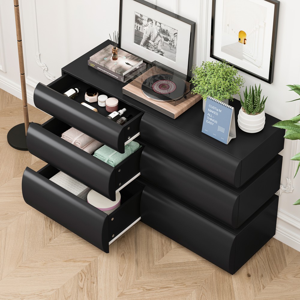 Product Features MINIMALIST MODERN: Showcase a minimalist modern style for your bedroom with thispull-less dresser. The dresser, handle-less slide drawers, crisp vertical and horizontal lines, and graceful curved lines are perfect for your home's theme. MULTIFUNCTIONAL ORGANIZATION: 6 different sized drawers provide ample storage space for both personal essentials and household items. The water-resistant surface can be easily cleaned of dust, making it ideal for use in the bedroom, living room or entryway. THICK AND STRONG: This chest of drawers is mainly composed of density fiberboard material, which is stable and durable. The drawers are connected by metal slides to form a stable structure that perfectly meets the storage needs of large and heavy items. There is also an anti-tipover device on the back panel to prevent tipping over, adding more safety to your home. REASONABLE WEIGHT-BEARING CAPACITY:In order to meet a variety of requirements in your daily life, the load-bearing capacity setting of this dressing table is reasonable and practical. The load-bearing capacity of the tabletop is 265 lbs. In that case, you can put most of daily sundries on the tabletop without worried about the load-bearing issues. The six drawers have the same load-bearing capacity, that is 22 lbs/per. EASY TO ASSEMBLE: The dresser comes packaged with all the necessary hardware, tools and clear instructions for easy assembly.