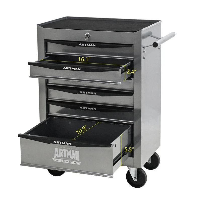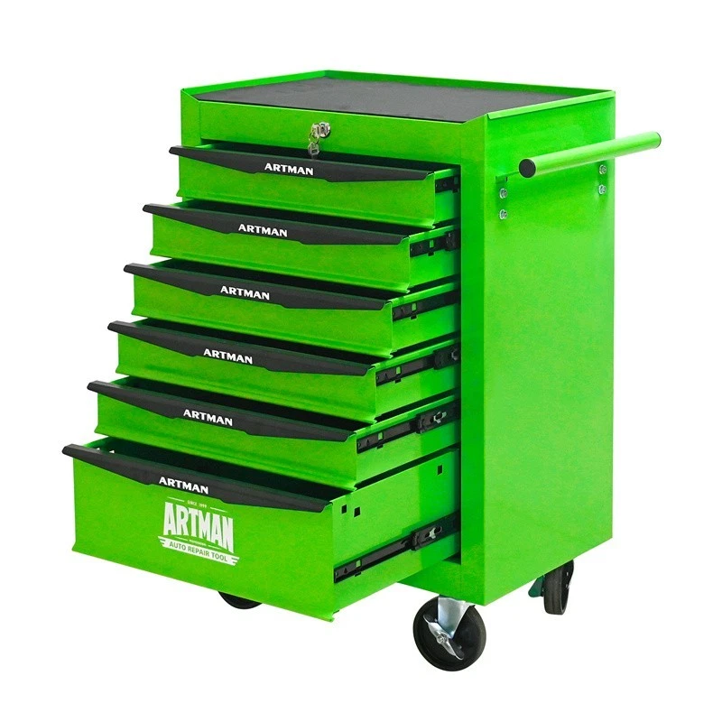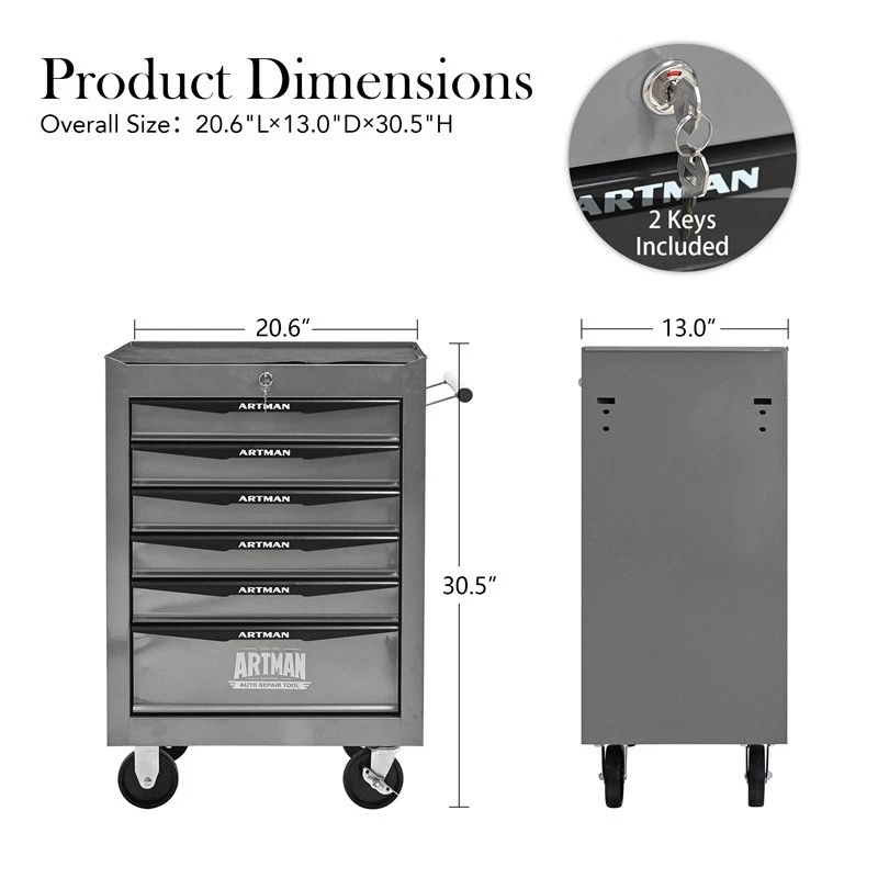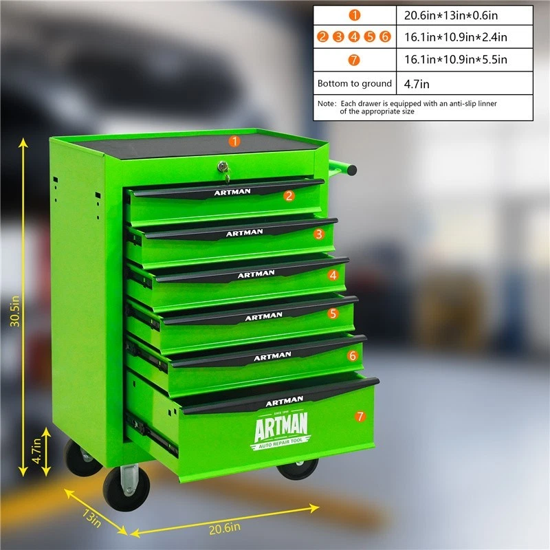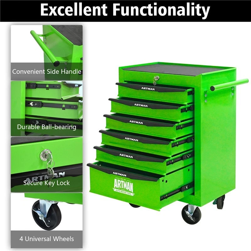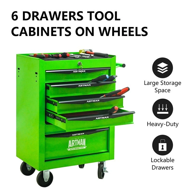 Features and Details: 6 drawers with wheels multi-purpose tool car, black and blue color with more durable The tool box is also lockable and can be used as a removable, attachable and mobile case The opening and closing of the drawers of the tool cabinet is very gentle thanks to the ball-bearing drawers The robust and powder-coated steel construction is used for high wear resistance. This assembly trolley has 4 steering wheels, 2 of which with parking brakes, so you can move the trolley freely in the garage, but also stop in one place Smooth steel countertops are cleaner and more durable. Specification: Color: Green / Silver Metrail:Cold Rolled Steel Surface Finish: Powder Coating Casters: 4" Casters (2PCS with brake and 2PCS without brake) Product Size (with wheels):20.63"L×12.99"W×30.59"H Product Dimensions:20.63"L×12.99"W×25.83"H Product Weight (lbs.): 51.59LBS