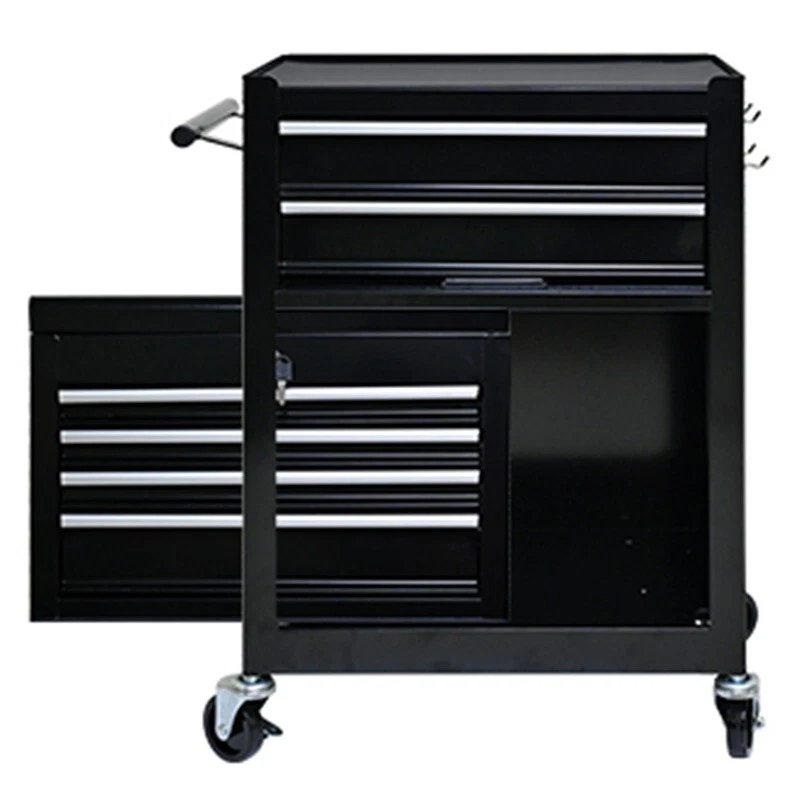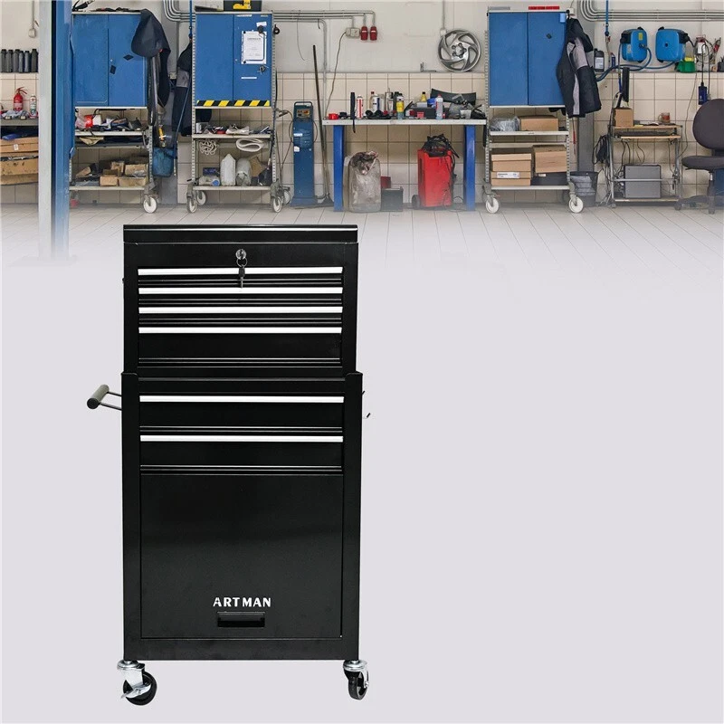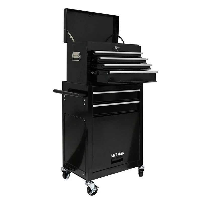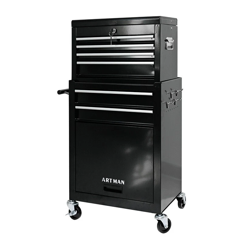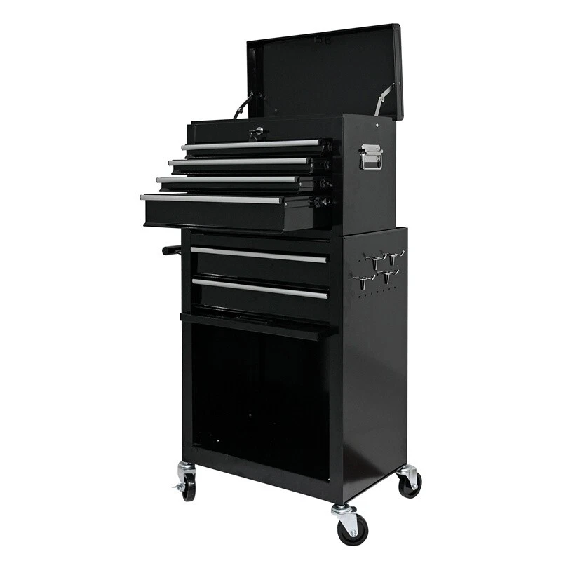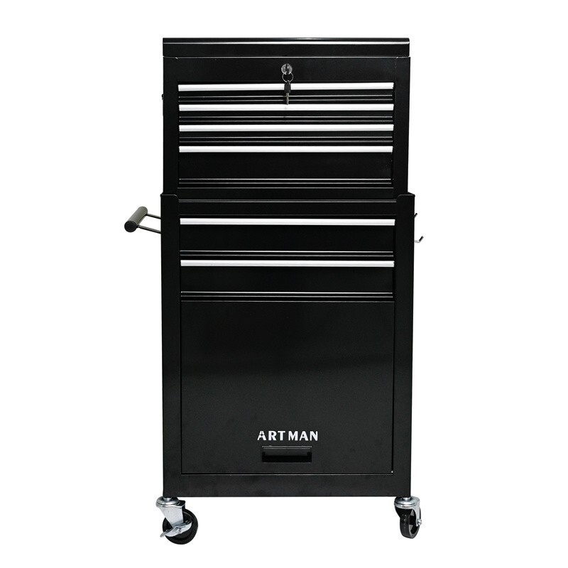 Features and Details: There are six drawers in the metal tool cabinet. The metal storage cabinet comes with four wheels, two of which have parking brakes, so you can move the cabinet around freely or park in one place. The overall bearing capacity of the tool cabinet is 100KG. The bearing capacity of drawers is 15KG. This product only has tool box with lock. Note that the drawer can only be opened by opening the top of the tool box, and when you lock it, you need to close the drawer thoroughly to lock the tool box. Specification: Color: Black+Red Material:Metal Surface Finish :Powder Coating Casters:4" Casters (2PCS with brake and 2PCS without brake) Upper Box Size:20.00*10.40*13.40INCH Product Dimensions: 20.67"L× 12.99"W ×42.91"H Capacity up:220lbs Weight (lbs.): 53.35