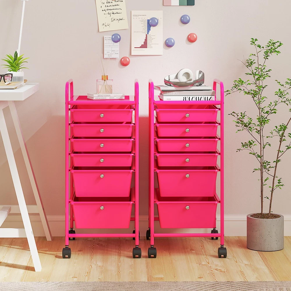 【Large Storage Space with 6 Drawers】: This 6-drawer rolling storage cart includes 2 large drawers and 4 small drawers, providing you with enough space to different categories of things, keeping your office supplies, cosmetics, handicrafts and tools free from dust and your room neat. 【Sturdy Metal Frame & Durable Drawers】: Our storage rolling trolley is made of chrome-plated steel, which is rust-resistant and corrosion-resistant for long service life. And 6 drawers are made of high-quality plastic, ensuring great load capacity and durability. 【4 Flexible Wheels】: Four universal wheels (2 are lockable) can swivel 360 degree and help you move the storage cart anywhere you needed easily. Moreover, the mute wheels won’t make any noise and can also protect your floor from scratches. And handles on the top of the cart are for easy moving. 【Convenient Knob for Easy Access】Each drawer is equipped with a round knob which brings great convenience to hold. Besides, the space between each drawer allows you to easily open the drawer to get what you need. The smooth surface is easy to clean and maintain, bringing convenience to daily use. 【Versatile Rolling Storage Cart】: Weighing only 6 lbs, the storage organizer cart is an ideal choice for your workplace, entryway, bathroom, garage, or home to be more organized. Meanwhile, its compact size won’t take up too much floor space, which makes it suitable for corners. Different colors offer you much convenience to classify your stuff.