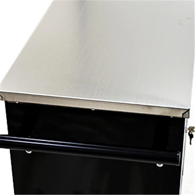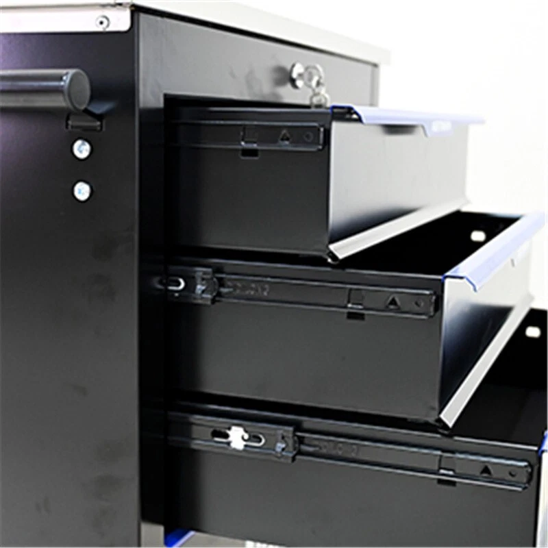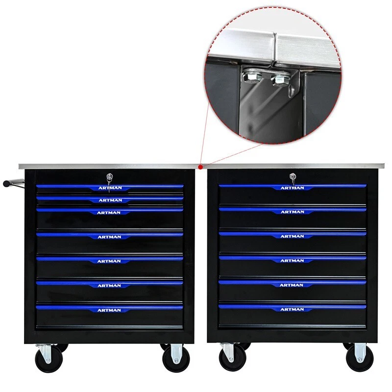 Features and Details: 6 drawers with wheels multi-purpose tool car, black and blue color with more durable The tool box is also lockable and can be used as a removable, attachable and mobile case The opening and closing of the drawers of the tool cabinet is very gentle thanks to the ball-bearing drawers The robust and powder- coated steel construction is used for high wear resistance. This assembly trolley has 4 steering wheels, 2 of which with parking brakes, so you can move the trolley freely in the garage, but also stop in one place This is a set of cabinets, can use a round hook at the bottom of the table to connect another tool car, thus forming a combination. Smooth steel countertops are cleaner and more durable. Specification: Color: Black+Blue Material: Cold Rolled Steel Surface Finish: Powder Coating Powder Coating: 4" Casters (2PCS with brake and 2PCS without brake) Item Size (with wheels and countertops) : 25.91*13.58*26.46INCH Size (with countertops): 25.91*13.58*25.98ICNH Item Weight: 59.52LBS