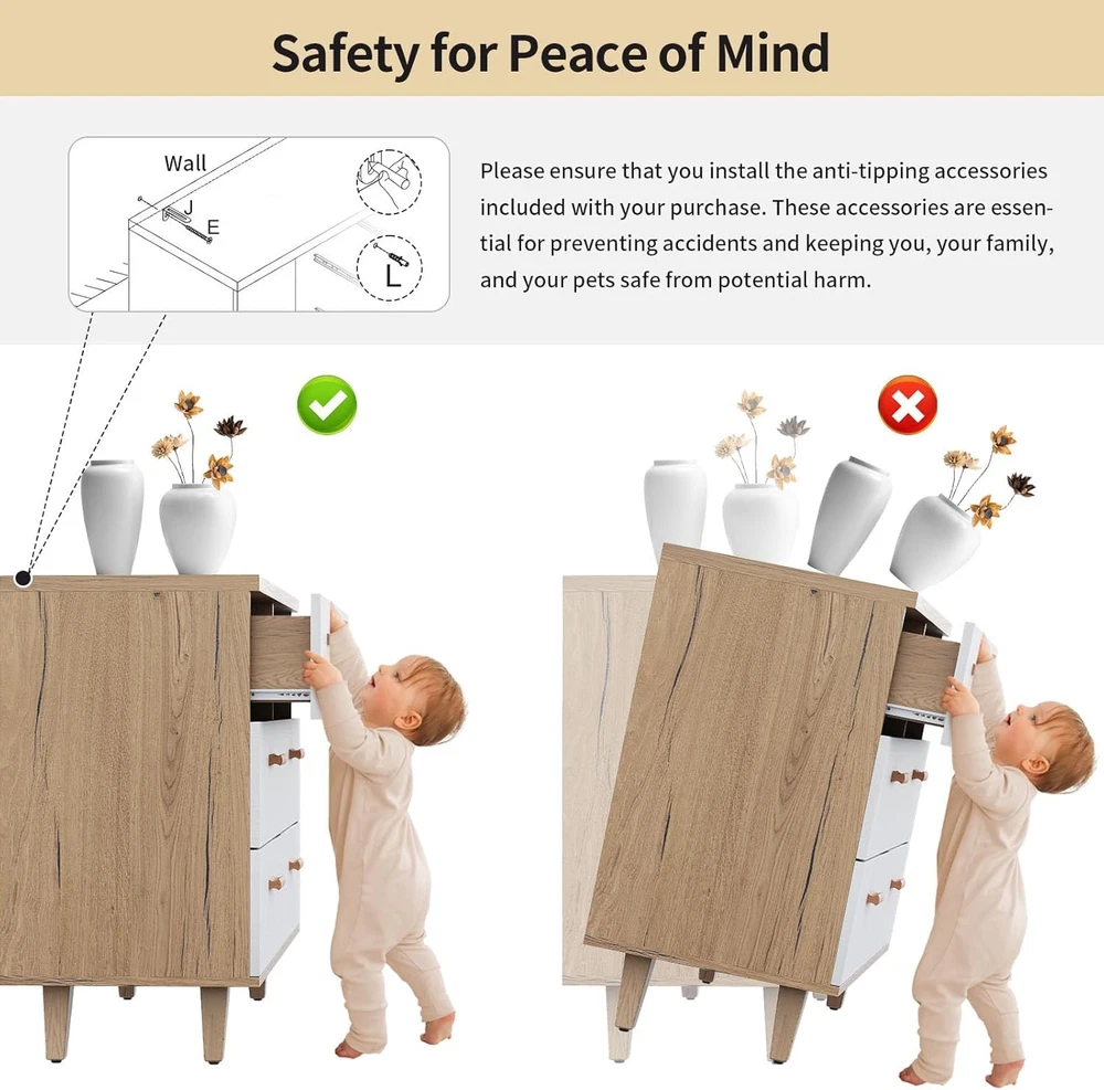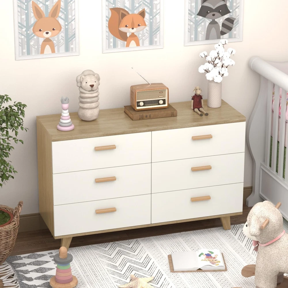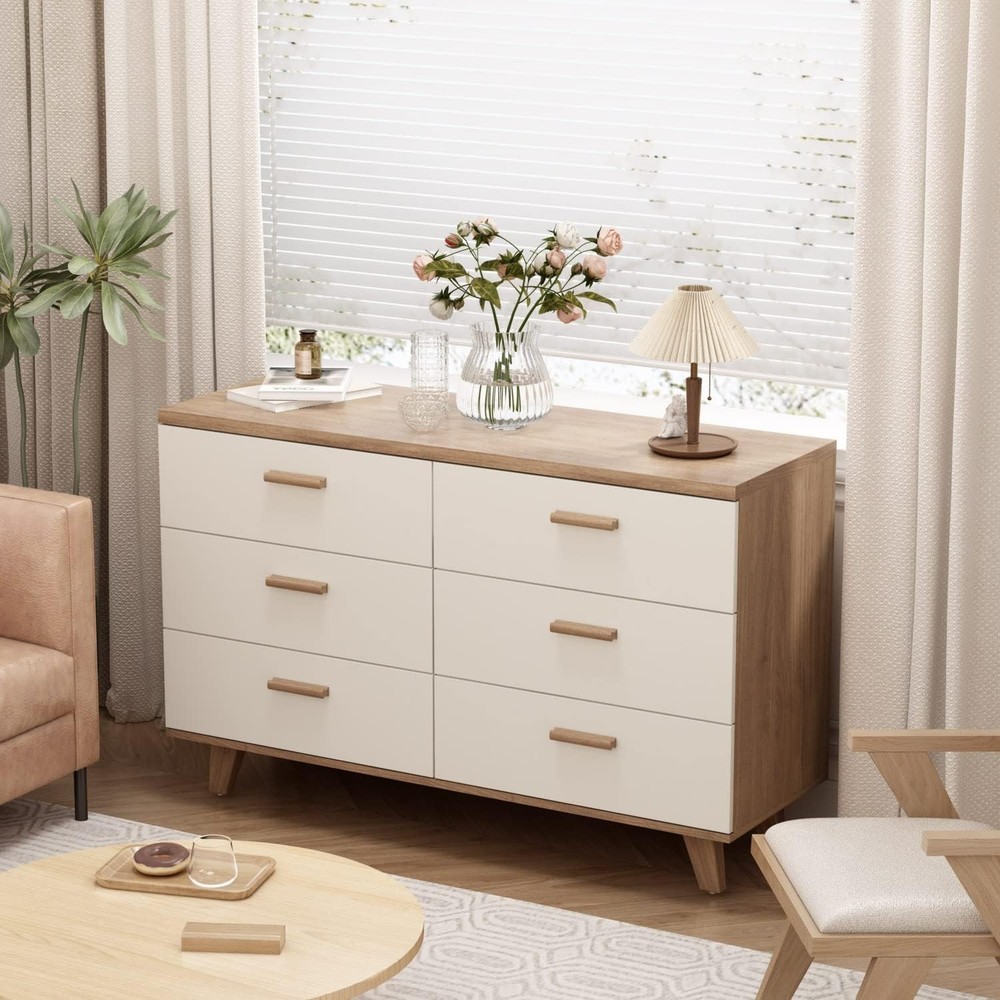 Product Description About this item 【Modern White Dresser】The 6-drawer modern dresser for the bedroom features a modern design accented with beech solid wood handles. The clean lines and elegant white color will blend with any bedroom décor or furniture. Smooth guides allow drawers to be pulled out and closed quietly and easily. 【Large Storage Space】 The height of the drawer is 5.91". Large drawer box design can accommodate toys, clothing, magazines, red wine, bowl spoon and so on. All can be accommodated, the use of space is diverse and flexible! 【Stable & Durable】The white dresser is made of E1-grade particle board and solid wood, which is thicker than similar products. And it's waterproof and scratch-resistant, easy to clean. Solid wood thickened feet provide more stable support, a stable and sturdy structure to accompany you for many years. 【Multi Use】This wide chest of dressers can be used in closets, bedrooms, nurseries, playrooms, entryways, churches, and offices. Very beautiful and generous, match your other furniture attractively, ideal for home furniture. 【Details of the Dresser】2 Packages in total. The top panel of the drawer cabinet used environmental protection particle board 25mm(9.8") thick, which is 10mm(4")thicker than that of similar products. This product is strong, and the bearing capacity is up to 220 pounds. White 6-Drawer Dresser for Bedroom White Dresser for Bedroom The white dresser features solid wood, wood grain with warm white matched, sophisticated and very elegant. The top panel of the drawer cabinet used high-quality particle board, which not only adds durability but is also resistant to water & scratches. It can be used in closets, bedrooms, nurseries, playrooms, entryways, churches, and offices. The bearing capacity is up to 220 pounds. 6-Drawer Nursery Bedroom Dresser Modern Design Wide Wood Table Top 6 Large Drawers for Storage Sturdy Legs Bedroom, Nursery Room, Kids Room, Living Room, Entryway Product Details Color: White+Wood Material: MDF+Solid Wood Weight Capacity: 220lbs Assembly Required: Yes Specification Product Dimension:47.2"L x 15.7"W x 30.3"H Package Size:52.36"L x20.87"W x8.46"H Package Weight:111.33lbs Number of Packages: 1 On Aug 6, 2025 at 23:21:55 PDT, seller added the following information: