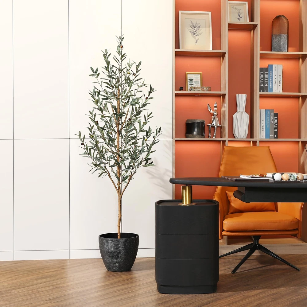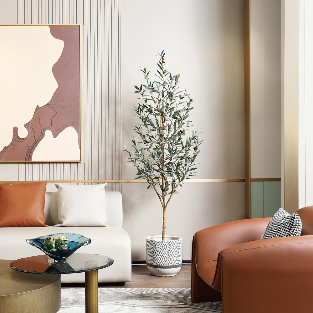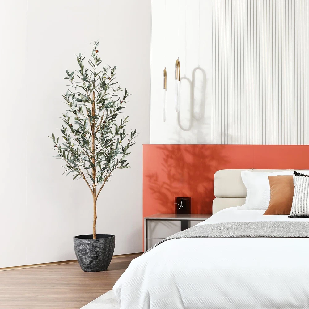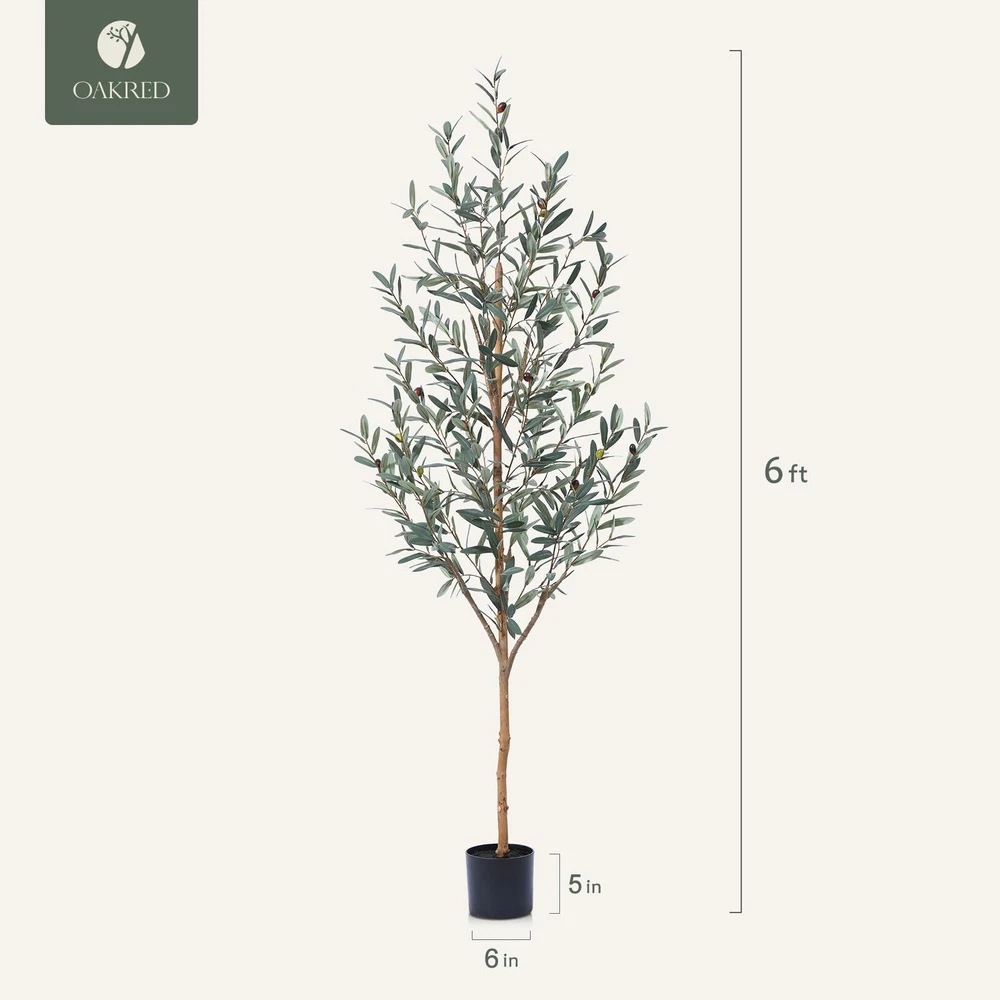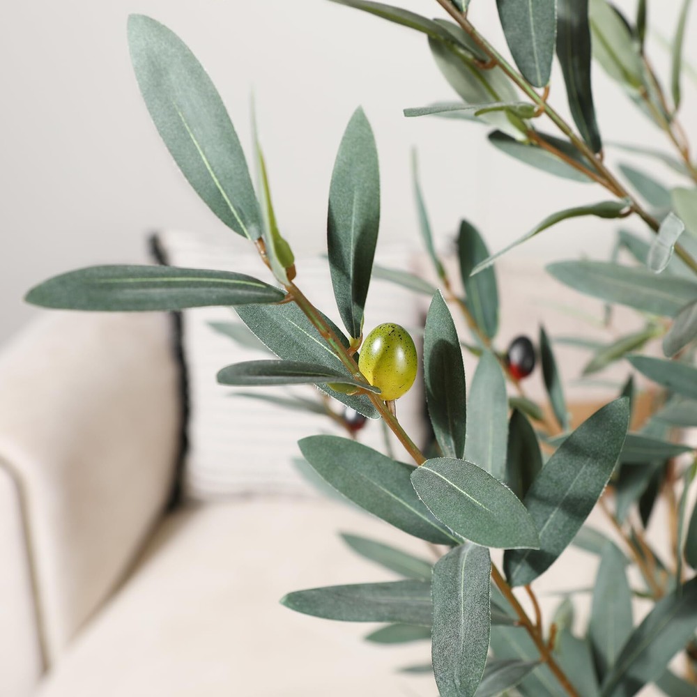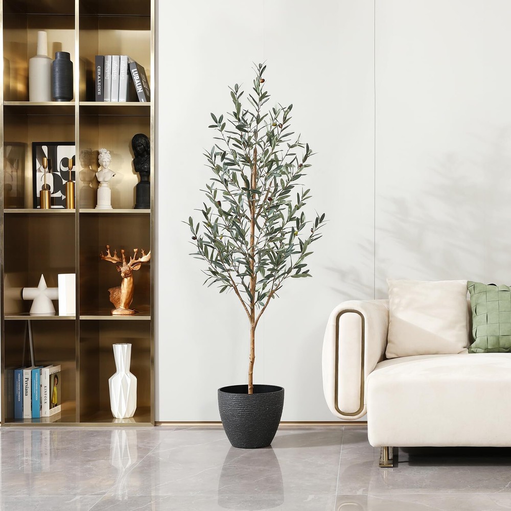 This fake olive plant not only has a natural trunk and highly realistic leaves and fruits, but also has a unique style, simple and high-end. The faux plant can perfectly complement any scene or theme, making it the perfect choice for home, living room, office decor. Artificial olive tree is an ideal low maintenance decoration that does not require watering, fertilizing, pruning, or daily maintenance. The leaves of tall plant are always dark green, plump, perfectly shaped and colored, and long-lasting. In addition, removing dust only requires a gentle sweep. Our faux olive tree branches and leaves are made of high-quality plastic and silk materials, as well as metal wires, which are very durable and realistic. The black pot of the olive trees artificial indoor is filled with solid cement to increase weight and ensure it is strong enough to prevent easy tipping. Only one step is needed to assemble it. Then adjust the branches and leaves to create your favorite shape and style for this artificial olive tree. From the bottom of the black pot to the top of the large plant, it is approximately 6 feet tall, with a black pot diameter of 6 inches and a height of 5 inches. The natural style and realistic appearance of this tall artificial plants indoor make it the perfect decor for living rooms, bedrooms, offices,or porchs.
