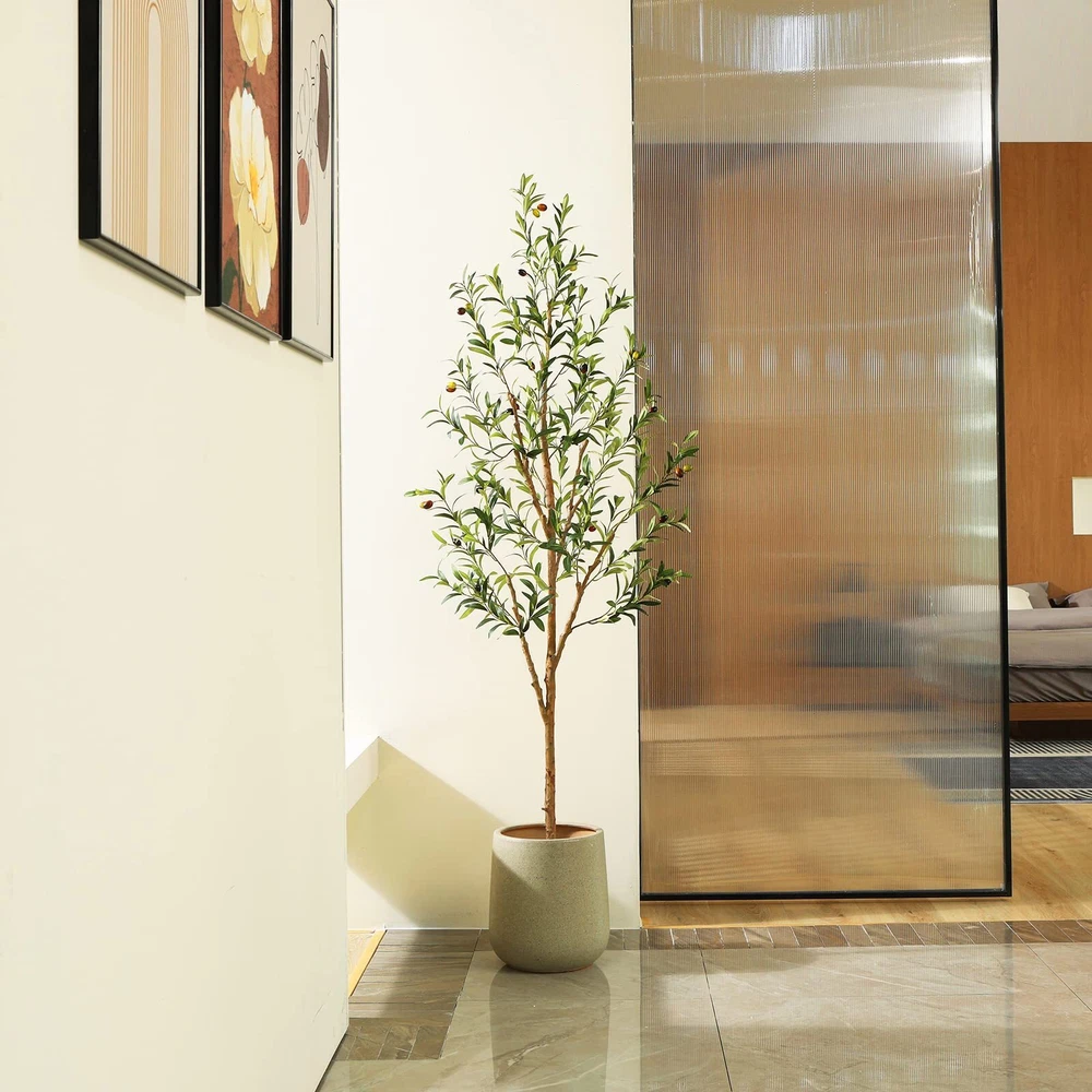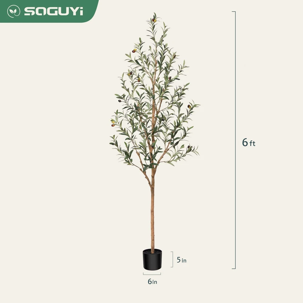 Realistic Details & Lifelike Design:Bring the beauty of nature into your home with our stunningly lifelike faux olive tree! Our tree features intricate detailed leaves and branches that perfectly mimic a genuine rubber tree, and stands out with a genuine wood trunk and lifelike fruits – a unique and authentic touch you won't find in other faux trees. Potted in A Stable Base:Our fake silk olive trees come pre-assembled in sturdy plastic and concrete pots, designed to stand securely on their own. The pots are perfectly sized at 6x5 inches, making them easy to transplant into a attractive planters that will complement any decor. Perfect Addition to Any Space:Standing at 72 inch tall, this faux olive tree brings the beauty of nature to any indoor decor. Whether you're looking to enhance your home, office, or commercial space like a hotels, restaurants, and malls, this lifelike artificial plant is an absolute must-have. It will transform any room into a soothing oasis that captivates all who behold it. Low-Maintenance Elegance:Tired of taking care of live plants? Our artificial olive tree requires no sunlight, watering, or pruning, and always looks lifelike and vibrant without any worry of leaves falling off. Furthermore, it never dies or fades, making it a stunning and long-lasting addition to your decor. Budget-friendly Greenery:Save time and energy maintaining real trees and plants and try our hassle-free artificial olive tree. Simply place it wherever you want to add a touch of fresh, green decor. It offers the perfect aesthetic addition to any space at a low cost.