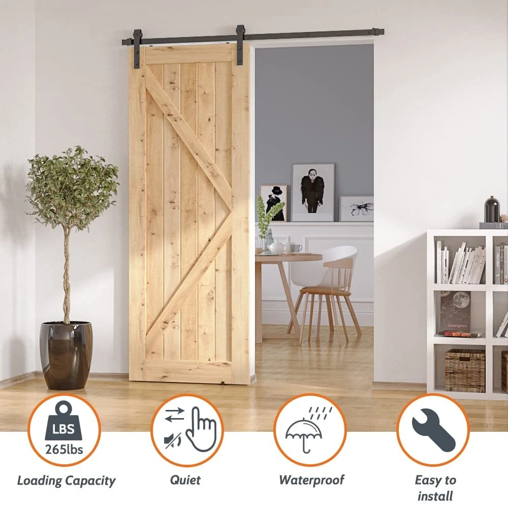 6FT Barn Door Hardware Kit [HIGH STANDRAD MATERIAL]Barn door rail,Barn door roller arm are made of carbon steel in 1/4" thickness,Great performance on hanging doors. Barn door wheels are POM made,More sturdy than steel,Smooth and Quiet during sliding , protect both of track and roller ,ensure the barn door system will last long. [STEP BY STEP INSTALLATION]"IMPORTANT:ONLY BARN DOOR HARDWARE KIT INCLUED,BARN DOORS ARE NOT FOR SALE". Manual included,just follow it from step A to Z.Normally it take 30-60 mins to install the whole system based on different installation conditions.In case you find you are missing parts after received the package or you have more doubt on installation ,kindly contact us for the missing part or your questions ,we will get back to you in 24 hours. [BARN DOOR HARDWARE KIT ]Color:Matt Black(black powder coated),Condition Type:New; Main Material: Carbon Steel,Door weight capacity: 250 lbs; Fit for maximum panel width: 36"; Bolt for barn door roller fit for door thickness from 1-3/8" to 1-3/4";Need at least 6" clearance from top of barn door to ceiling.the barn door track hole spacing is 16" pre-drilled. [PACKAGE CONTENT] 5 x barn door track, 5 x wall spacers with leg screws, 2 x barn door stoppers, 2 x barn door rollers, 2 x anti jump pads, 1 x barn door floor guide, 1 x instruction [WHY US] We are a leading manufactory of barn door hardware for more than 10 years ,all sets barn door hardware track kit have been inspected before leaving our warehouse,barn door rollers have been tested over 1000,000 times opening and closing cycle .You can get heavy duty barn door kit here with a manufacturer price,why not ? In case you got any confustion during shipping ,kindly feel free to submit a question or contact us via amazon directly ,thank you .