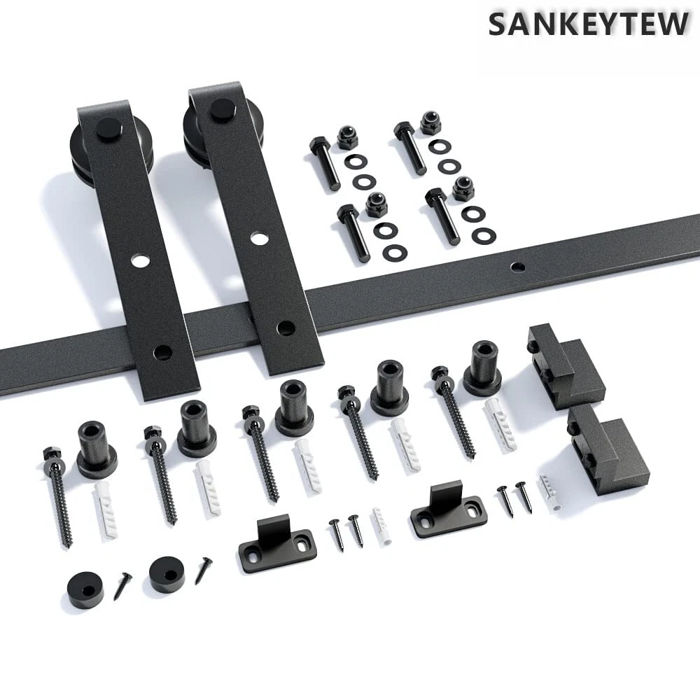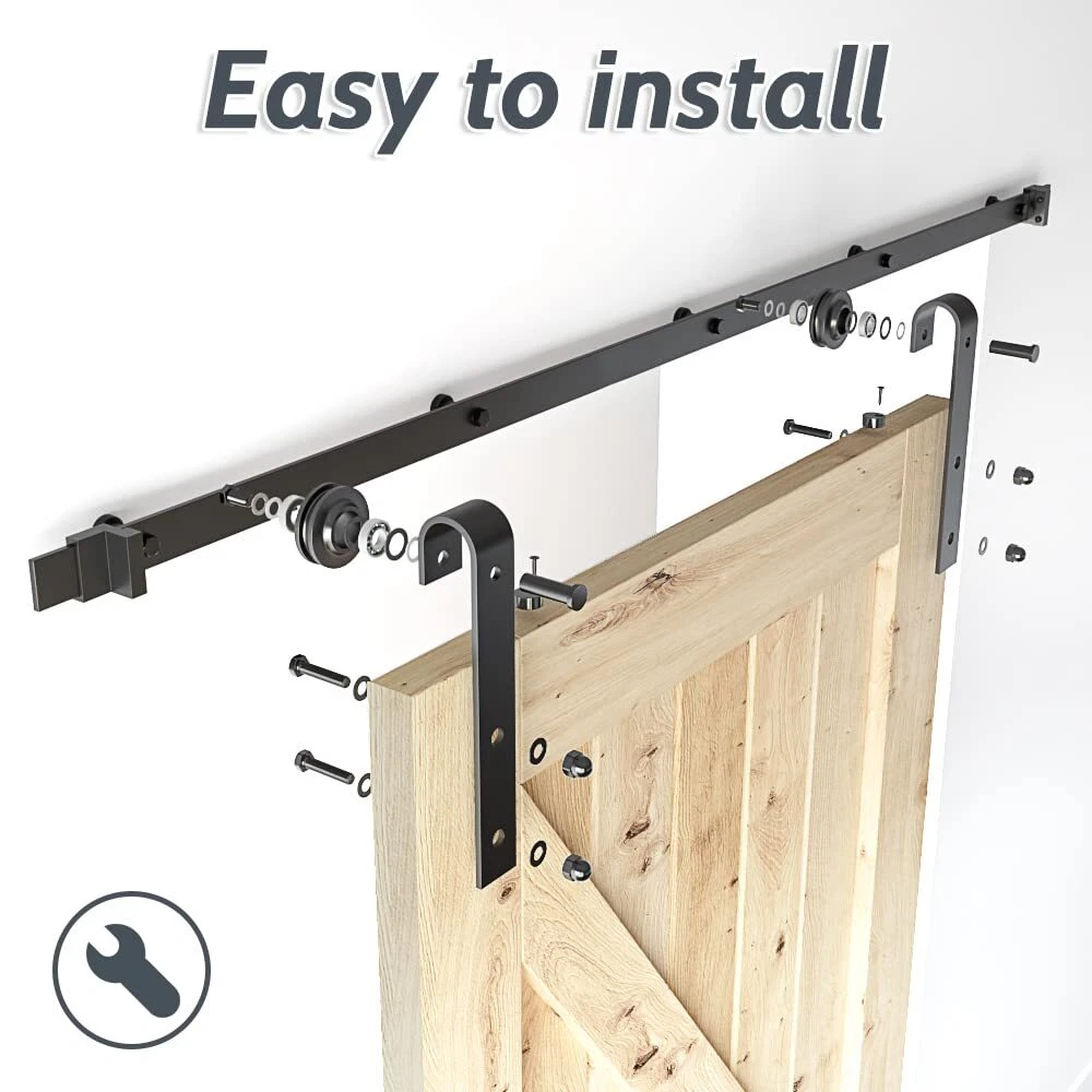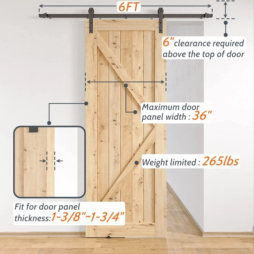 6FT Barn Door Hardware Kit [HIGH STANDRAD MATERIAL]Barn door rail,Barn door roller arm are made of carbon steel in 1/4" thickness,Great performance on hanging doors. Barn door wheels are POM made,More sturdy than steel,Smooth and Quiet during sliding , protect both of track and roller ,ensure the barn door system will last long. [STEP BY STEP INSTALLATION]"IMPORTANT:ONLY BARN DOOR HARDWARE KIT INCLUED,BARN DOORS ARE NOT FOR SALE". Manual included,just follow it from step A to Z.Normally it take 30-60 mins to install the whole system based on different installation conditions.In case you find you are missing parts after received the package or you have more doubt on installation ,kindly contact us for the missing part or your questions ,we will get back to you in 24 hours. [BARN DOOR HARDWARE KIT ]Color:Matt Black(black powder coated),Condition Type:New; Main Material: Carbon Steel,Door weight capacity: 250 lbs; Fit for maximum panel width: 36"; Bolt for barn door roller fit for door thickness from 1-3/8" to 1-3/4";Need at least 6" clearance from top of barn door to ceiling.the barn door track hole spacing is 16" pre-drilled. [PACKAGE CONTENT] 5 x barn door track, 5 x wall spacers with leg screws, 2 x barn door stoppers, 2 x barn door rollers, 2 x anti jump pads, 1 x barn door floor guide, 1 x instruction [WHY US] We are a leading manufactory of barn door hardware for more than 10 years ,all sets barn door hardware track kit have been inspected before leaving our warehouse,barn door rollers have been tested over 1000,000 times opening and closing cycle .You can get heavy duty barn door kit here with a manufacturer price,why not ? In case you got any confustion during shipping ,kindly feel free to submit a question or contact us via amazon directly ,thank you .