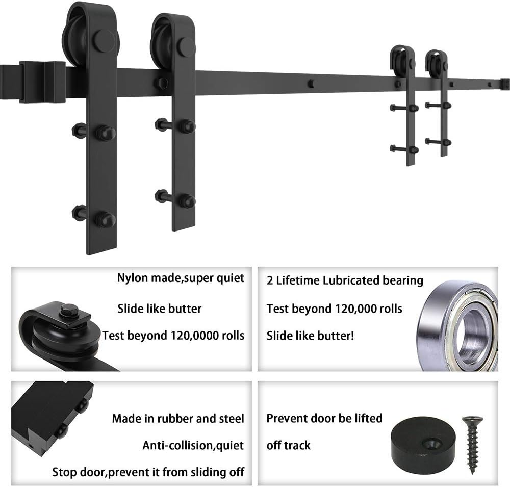 Store New Arrivals Add to Favorite View Feedback Contact 6FT Barn Door Hardware Kit: Double Sliding Door Hardware - Black Barn Door Track Kit - Carbon Steel Heavy Duty Door Rail - J-Shape Easy to Install for 36" Closet Panel(No Door) Description Style 6FT /72" 2 Doors Track Kit Pattern Bending Design Thickness 6 Millimeters Batteries Included? No Usage Install Barn Doors Batteries Required? No Finish Black Product Dimensions 73 x 5 x 4 inches Material High Quality Carbon Steel Handle Material Metal Installation Method Wall-Mounted Maximum Weight Capacity 230 Pounds Is Discontinued By Manufacturer No Item Package Quantity 1 Number Of Pieces 27 Item Weight 19.29 pounds Part Number GCM2086-A Mounting Type Wall Mount Color Double Door Kit Shape Bending Design Included Components 5 x lag bolts and spacers, 4 Door stoppers, 2 X 3FT Track, Steel Hangers, Floor Guide, Anti-Jump Pad, other Screw parts Size 6FT Track Kit Sturdy and durty barn door hardware: The side-mounted sliding barn door kit is made of high-quality carbon steel, that can ensure durability and studity to support barn door weight up to 277 lbs. The surface of barn door track is adhered to a fine black powder coating by high temperature to ensure that it can be used for a long time. How to choose the Double barn door hardware kit: The sliding door track length should be at least double the door width. And there should be a minimum of 5.1" gap between the barn door and the ceiling.Fit door panel width: 32", door panel thickness: 1 3/8" - 1 3/4". It can be paired with wood barn door, closet door, MDF barn doors, and more.(If you have thicker door, and longer pipe clamp screws can be supplied) Quiet and smooth sliding door hardware: The high-quality carbon steel track kit ensures barn door slide smoothly. J-Shape barn door rollers can provide smoother rolling. With carbon steel anti-hopping block and stopper for stable movement and long useing. Easy to install: The barn door hardware kit package include:(1) 2 X 3FT Tracks (5) Wall Connectors (4) Rollers (4) Door Stoppers (2) Floor Guide (1) Installation manual; All necessary hardware is included. And we can provide installation video to make you easier when install the barn door kit.This sliding door hardware takes up to 2 people to install in 40 minutes. If you have any issues, please let us know, and we will do our best to assist you.(DOOR NOT INCLUDED) Versatile sliding barn door hardware: The black barn door track provides a sleek, modern look that can complement various interior design styles, from rustic to industrial, including residential homes, offices, and commercial spaces. Barn door hardware kit allow doors to slide parallel to the wall, saving valuable floor space compared to traditional swinging doors. This makes them ideal for smaller rooms or areas with limited space. Product Description 1 Long Lasting 2 Safe & Reliable 3 Track Connector L Floor Guide 2 installation methods allow you groove the door bottom or not. The floor guide can prevent the doors from swing, allow open and close door freely. Safety-ensuring Measures Anti-jump Pad prevent door be lifted off rail. Install them on the top of your door, it can hold the rail once the door hit the stopper. Heavy Duty Track The anti-scratch high temperature fine black powder coated surface and heavy duty 1/4" thick carbon steel rail will last a long time. Strong Load-Bearing Capacity Quality carbon steels is applied for more sturdy. 8.8 grade self-tapping screws and roller screws can hold two 230lbs doors comfortably. Room Dividers Barn door hardware kits can be used in a variety of applications, both practical and decorative. They are great space-saving solutions. Sliding Doors Barn door hardware kits can be used in a variety of applications, both practical and decorative. They are great space-saving solutions. Kitchen Cabinets Barn door hardware kits can be used in a variety of applications, both practical and decorative. They are great space-saving solutions. Interior & Exterior Doors Barn door hardware kits can be used in a variety of applications, both practical and decorative. They are great space-saving solutions. Can I cut the rail to fit my wall? Yes, the rail can be cut to any length. We recommend using an angle grinder to cut the rail. What is the weight capacity? Your door limited 230lbs. What is the compatible door thickness? 1-3/8" ~ 1-3/4". Note: If you have door thickness that falls out of this range, please let us know your exact door thickness so that we can put shorter hex bolts for your thinner doors or longer hex bolts and spacer extenders for your thicker doors. When do I need a headboard? a. If the pre-drilled holes in the rail don't line up with your wall studs. b. If there is a doorway trim. Attach a header board with the same thickness as your doorway trim into your studs first, and then mount the rail onto the header board. How to Choose Product from WINSOON shop? Add to Cart Add to Cart Add to Cart Add to Cart Add to Cart Add to Cart Customer Reviews 4.6 out of 5 stars 641 4.6 out of 5 stars 5,031 4.6 out of 5 stars 2,729 4.4 out of 5 stars 1,602 4.4 out of 5 stars 1,602 4.6 out of 5 stars 5,031 — Price $72.90 $ 72 . 90 $51.98 $ 51 . 98 $108.90 $ 108 . 90 $86.24 $ 86 . 24 $79.99 $ 79 . 99 $51.98 $ 51 . 98 — Used For 2 Doors 1 Door 2 Doors 2 Doors 2 Doors 2 Doors 1 Door Door Overlap / / / 8-10" 8-10" 8-10" / Min Space Needed Above Door 6" 8" 5.1" 5.1" 5.1" 8" 5.1" Door Panel Thickness 1-3/8" ~ 1-3/4" 1-3/8" ~ 1-3/4" 1-3/8" ~ 1-3/4" 1-3/8" ~ 1-3/4" 1-3/8" ~ 1-3/4" 1-3/8" ~ 1-3/4" 1-3/8" ~ 1-3/4" Material high quality carbon steel high quality carbon steel high quality carbon steel high quality carbon steel high quality carbon steel high quality carbon steel high quality carbon steel ABOUT US We offer the best prices around on high quality products. Our E-store includes media such as books, movies, music and games while offering electronics, toys, sporting apparel, clothing, tools, general 
