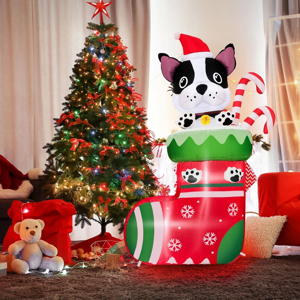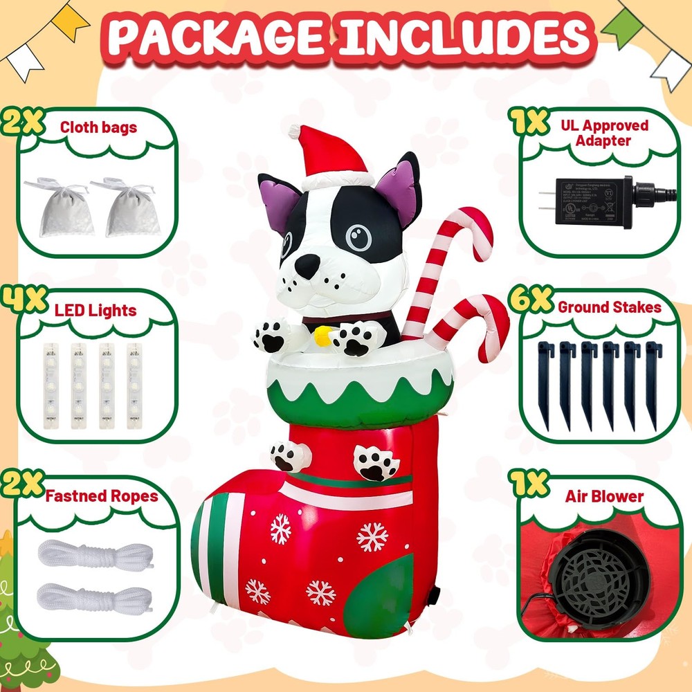 AerWo 6 FT Christmas Inflatable Outdoor Decoration, Christmas Inflatables Dog in Stocking, Christmas Blow Up Yard Decorations with LED Lights, Christmas Decorations for Indoor Outdoor Party Decor Adorable Dog in Stocking Design: The 6-foot inflatable Christmas decorations feature a cute puppy wearing a Santa hat, sitting happily inside a festive Christmas stocking. The charming design is sure to capture the hearts of your family, guests, and passers-by, making this Christmas blow ups dog a delightful addition to your outdoor Christmas decorations Weather-Resistant Materials: Made from durable 210T polyester, this outdoor Christmas inflatable is designed to withstand outdoor elements. It is waterproof, tear-resistant, and built to last, ensuring that your Christmas outdoor inflatable dog remains vibrant and intact throughout the holiday season, even in unpredictable weather. Make your Christmas decorations outdoor last year after year Quick and Easy Setup: Equipped with a built-in 0.8A blower, the Christmas inflatable outdoor decoration inflates quickly and effortlessly in just a few minutes. The 1A UL-approved plug and 78.7-inch power cord eliminate the need for extension cords, providing you with a convenient setup that’s hassle-free and stress-free. You can easily place the Christmas blow ups for outside anywhere you want Stable and Secure Outdoor Christmas Decor: To ensure your Christmas blowups dog stays securely in place, the package includes 6 ground stakes, 2 sandbags, and 2 x 59-inch fastened ropes. These accessories provide stability for funny Christmas inflatables even in windy conditions, so you can enjoy your Christmas outdoor decorations throughout the season without worrying about it blowing away Eye-catching Christmas Party Decorations: The outdoor inflatable Christmas decorations are equipped with 4 energy-saving internal lights that brighten up the dog Christmas inflatable and create a warm, festive glow. Our Christmas inflatables are suitable for outdoor use, in the courtyard, garden, or at home, for gatherings, art decorations, Christmas events, and Christmas Eve activities, etc
