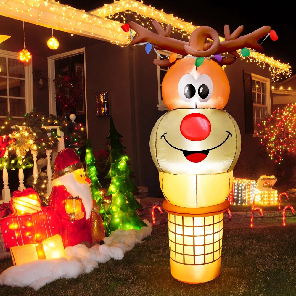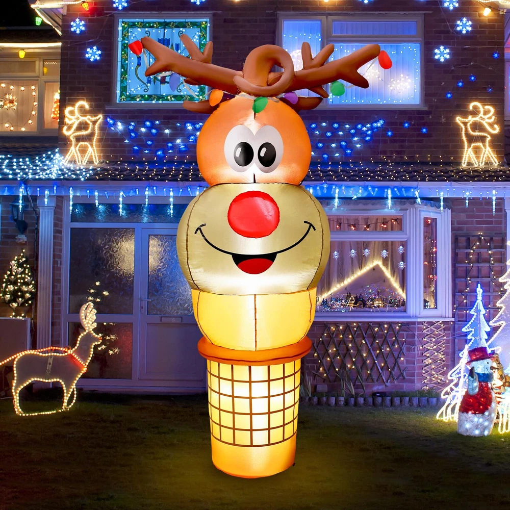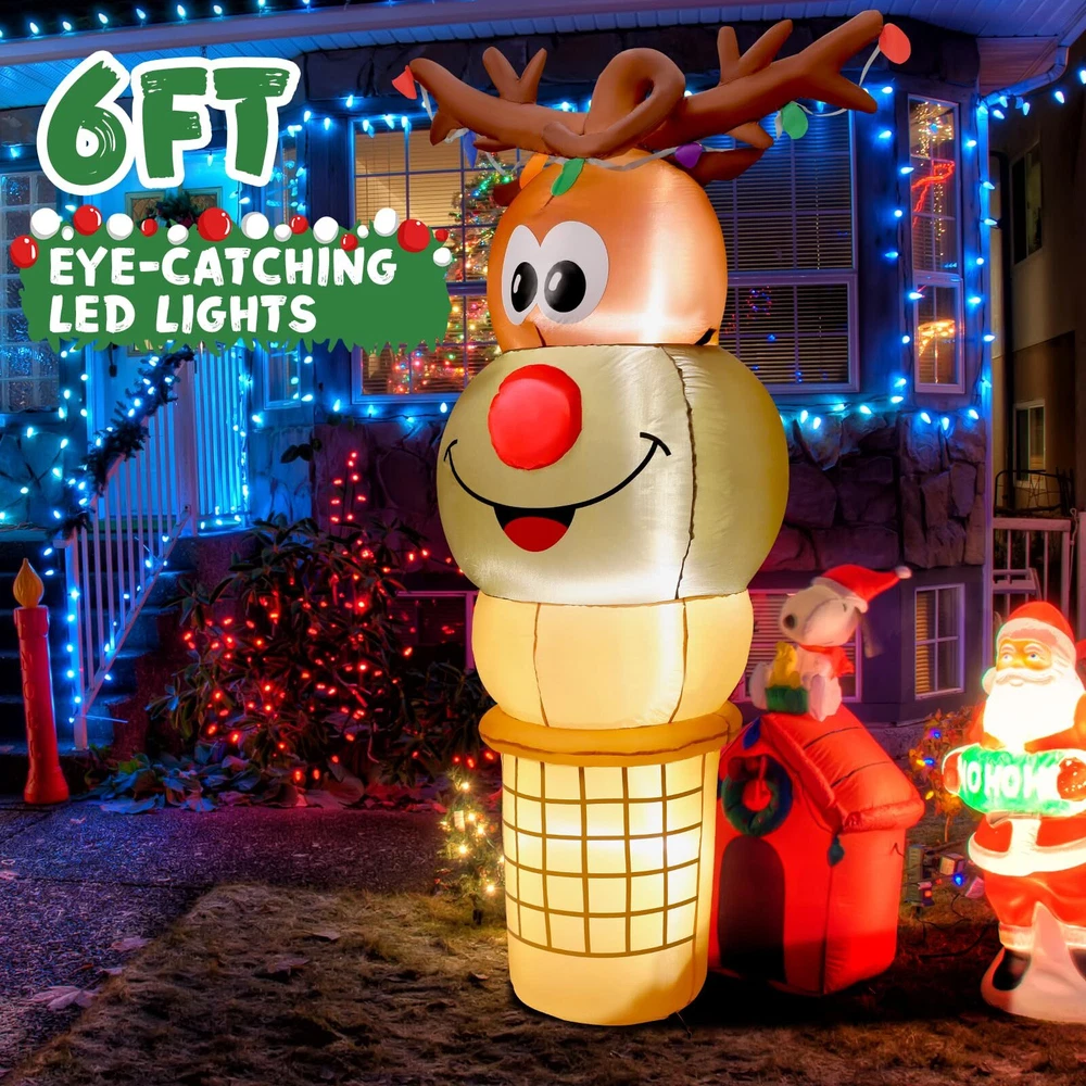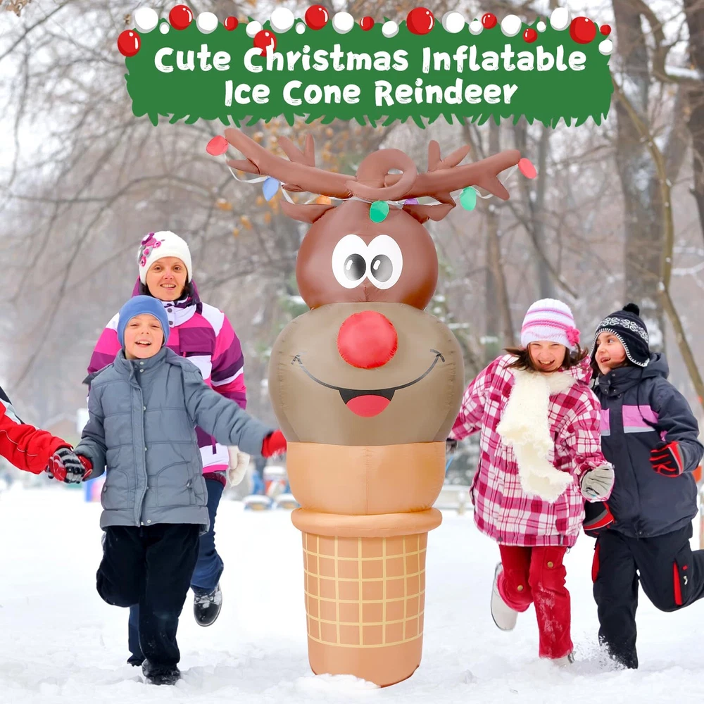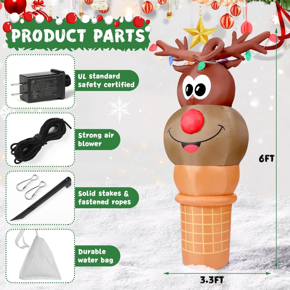 6FT Tall Christmas Inflatable Reindeer Cone Outdoor Decoration, Christmas Inflatables Yard Blow Ups Christmas Decorations Outdoor, blow up Reindeer Christmas Inflatable Christmas Decorations Outdoor Cute Outdoor Christmas Decorations: The fun and adorable 6 FT tall Christmas Inflatable Reindeer Ice Cream Cone design is sure to make kids exclaim in delight at how cute it is when they see it and will never forget this wonderful Christmas holiday Built-in Bright LED Lights: This blow up reindeer ice cream was built in several bright LED lights, casting a shinning glow to create a very pleasant and festive Christmas atmosphere, catching people's eyes at the first glance Premium Material: Supported by a CE and UL-certified adapter, and crafted of high-quality polyester, our Christmas inflatable blow up decoration is safe to be used for years come Fast Installation: Thanks to the strong air blower, this reindeer Christmas inflatable can be inflated in less than one minute, just plug it into the socket, you'll have a cute glowing reindeer cone inflatable. Super easy to install Great for Indoor and Outdoor Decor: Our Christmas inflatables reindeer ice cream are suitable for indoor and outdoor use. Great to decorating yard, home, stage, shopping mall and any occasion you like. You also can send it to others as a Christmas gift Customer Service: If you have any question, please don't hesitate to contact us via "Ask a question" button at our store page. We will help you solve the problem in time