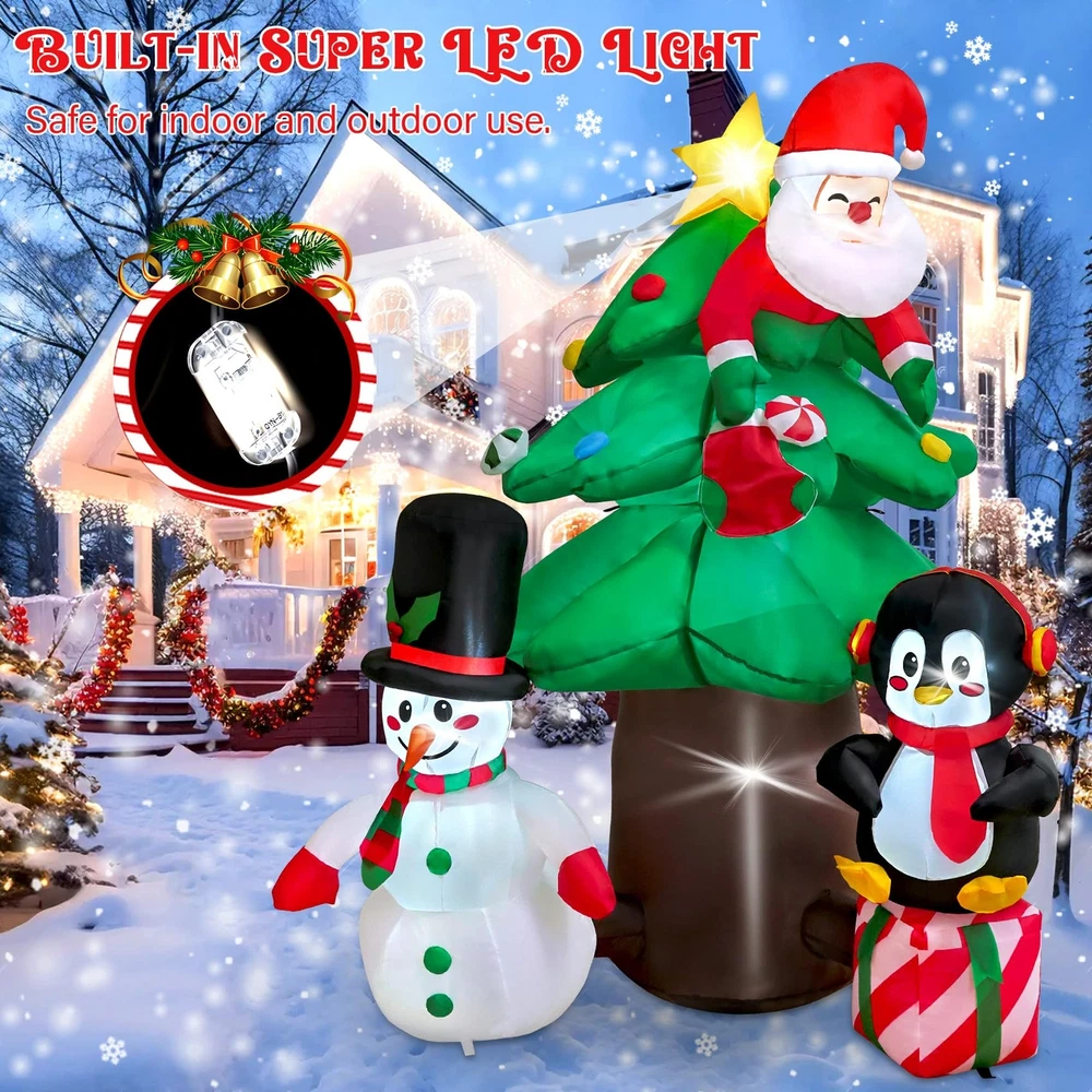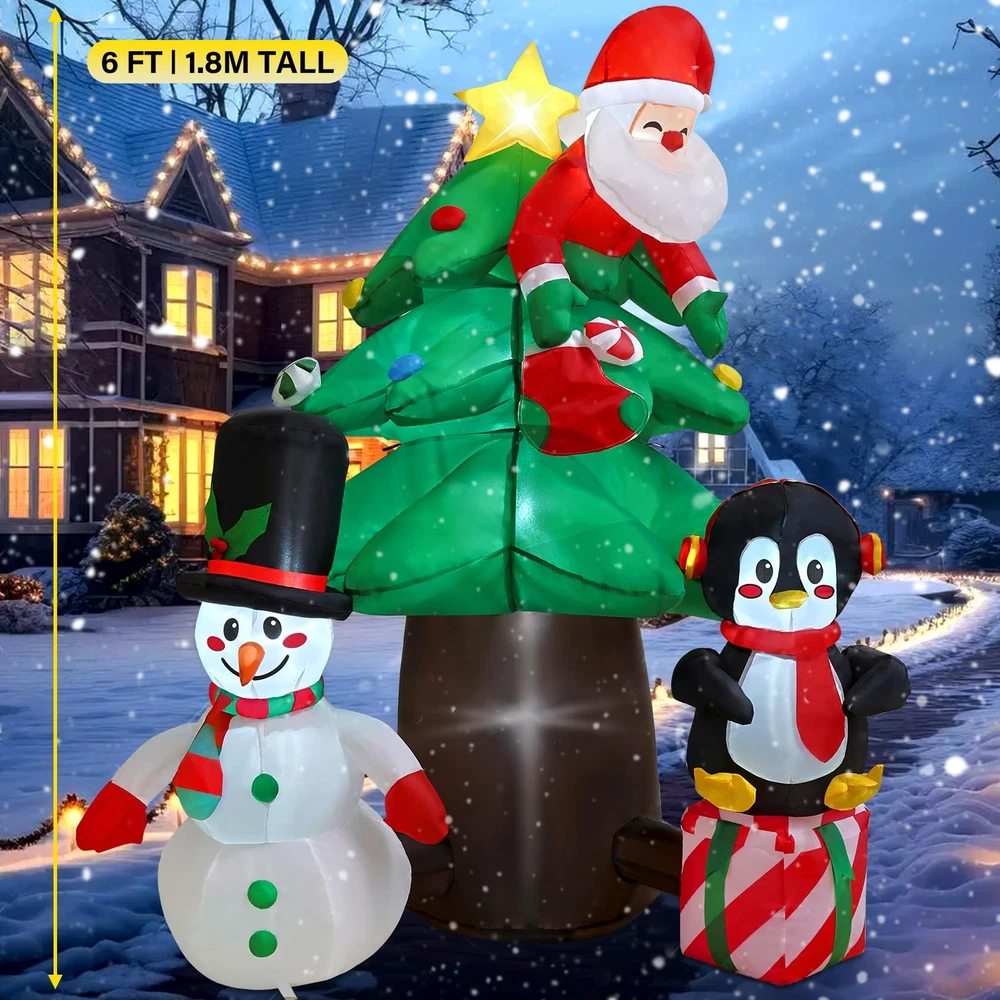 Inflatable Christmas Tree 【Christmas Inflatable Tree Decoration】 6FT high inflatable Christmas tree decoration, Santa Claus lying on the lovely Christmas tree, penguin sitting on the gift box, snowman in holiday attire, waiting for Christmas with great anticipation, waterproof and durable 1 minute to complete the inflatable, placed in your yard, party, outdoor are very suitable 【Waterproof and Durable】 Our Christmas inflatable decorations are made of high quality polyester fiber to ensure waterproof and durable. Equipped with windproof rope, ground stake and extended power cord, it is safe and easy to use both indoors and outdoors. No need to worry about the Christmas yard inflatable tree being blown away by the wind, the ropes and ground stakes will keep it securely 【Built-in Led Lights】 Our inflatable Christmas trees are equipped with bright festive LED lights inside, enhancing the evening's holiday spirit and making your Christmas yard decoration a big hit, attracting children, neighbors and guests 【Easy to Inflate】Our inflatable decorations come with a powerful blower for quick inflation, just plug it in and it will be inflated in a minute. Please make sure the zipper is closed and the blower is not blocked when you use it. Turn off the power when storing, convenient and quick 【After-sales Service】 If you have any questions or concerns when using our products, our professional customer service to reply to you, we will respond to your information within 24 hours to help you solve the problem quickly