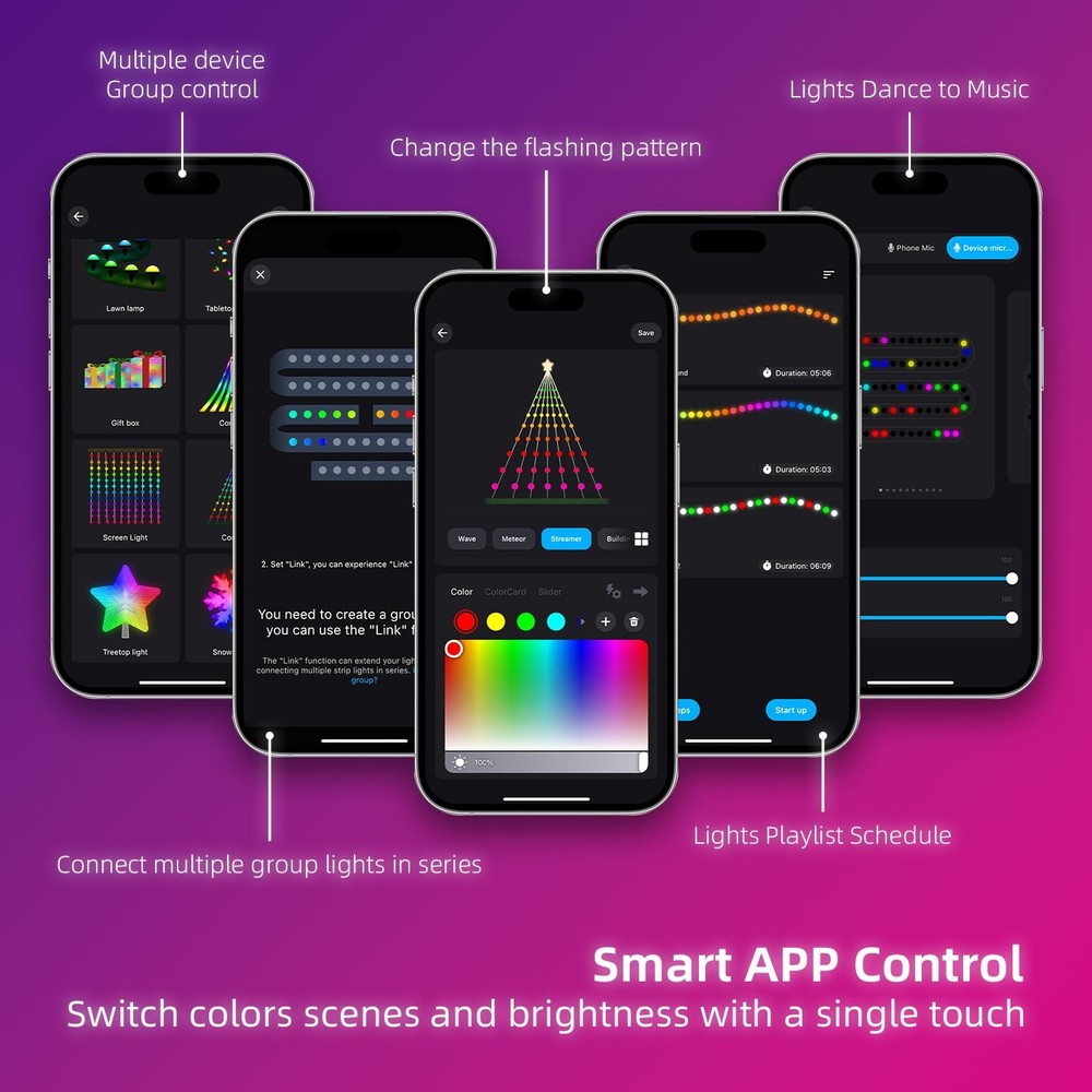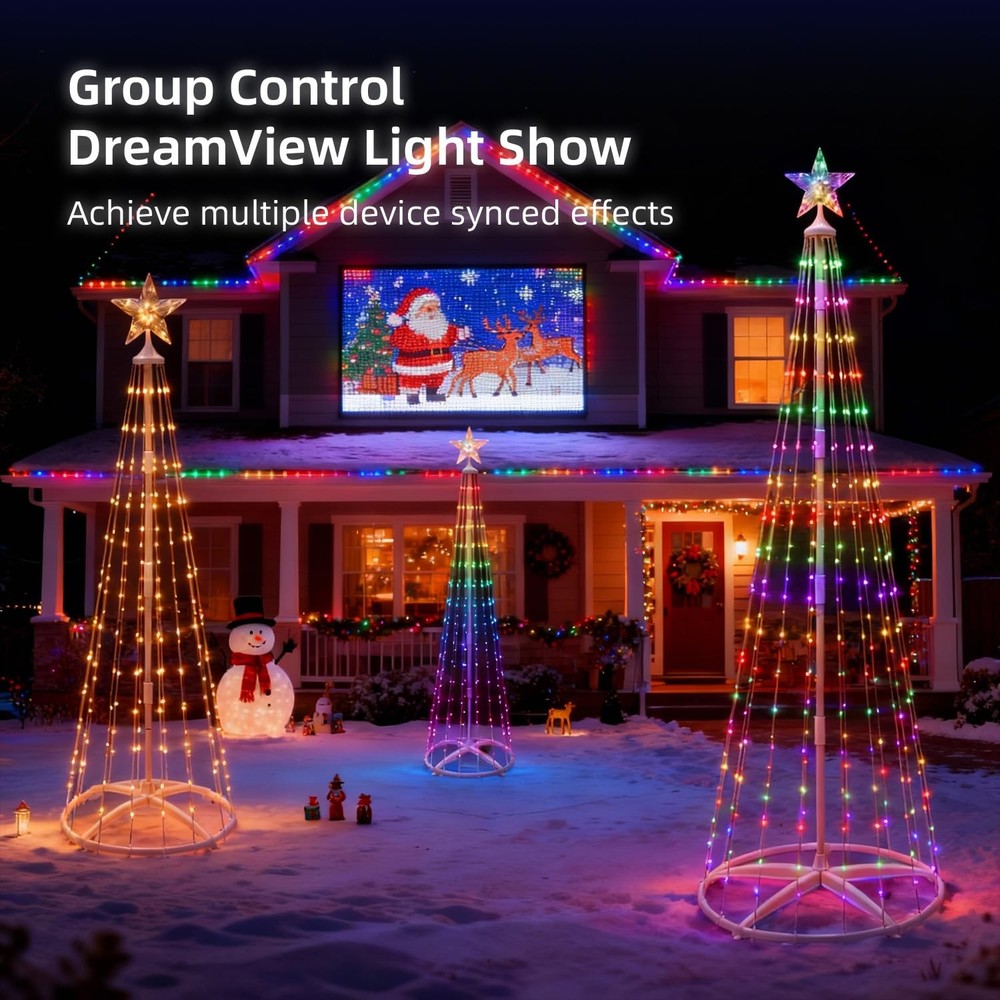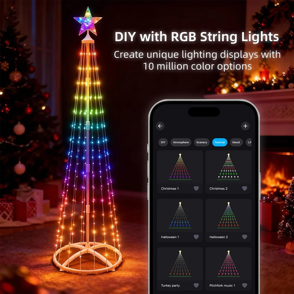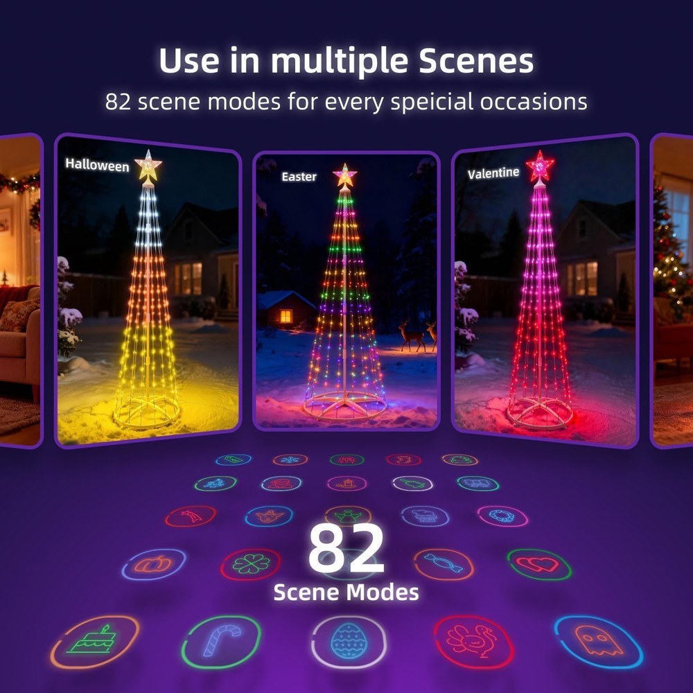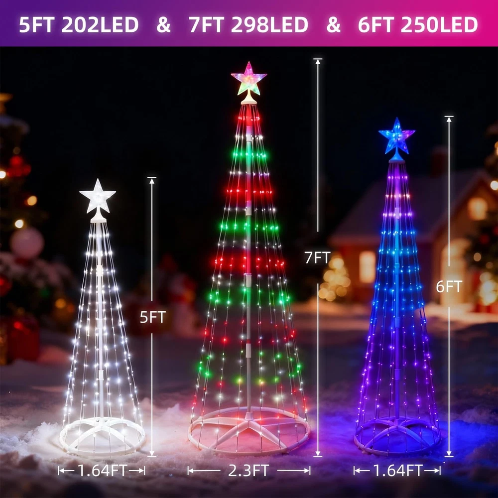 PRESET SCENES: 6 ft Christmas Tree includes 295 fairy lights, built-in dozens of preset modes, and sixteen million colors. You can choose the pattern and color you like. The beautiful light show is perfect for outdoor Christmas decorations. Colorful RGB Lights: The Christmas tree with lights use -IC Control technology that allows for independent color assignment from 16 million options. You can freely create DIY lighting effects to your liking, making them ideal for Christmas decorations in the yard and patio Scene Mode & Music Mode: The 82+ preset scene modes of the lights are designed to meet the needs of any occasion and holiday. These Christmas tree with lights feature a built-in microphone that detects surrounding sound, allowing the lights to dance in sync with the music. App & Remote Control: Seamlessly control your lights your way. Use the user-friendly app from anywhere or the handy remote. Reliably adjust colors, modes, brightness, timer, and set schedules with a stable connection every time. 5-Minute Setup & Compact Storage: Your time is precious — we it. Experience frustration-, plug-and-play installation in minutes. After the holidays, the tree folds down effortlessly into a compact size for convenient, space-saving storage. Christmas Cone Tree Light: Our outdoor Christmas tree with lights are 7ft tall and 2.6ft wide at the base. 298 beads are spread across 18 string lights with shining star lights on the top. The 13.1ft power cord allows you to place the tree lights anywhere.