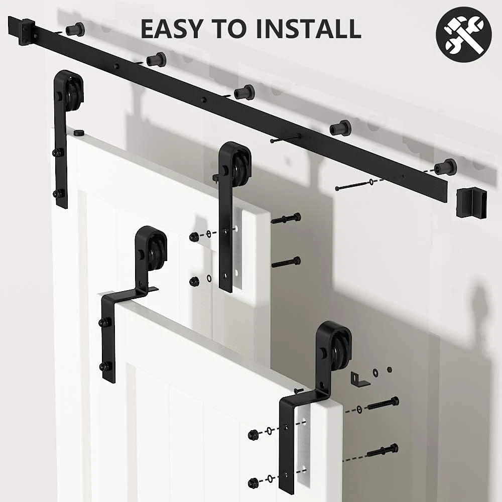 Store New Arrivals Add to Favorite View Feedback Contact 6FT Heavy Duty Sliding Barn Door Hardware Single Track Bypass Double Door Kit Black(Bypass J Shape-1) Description Item Package Quantity 1 Batteries Required? No Finish Coated Assembly Required Yes Color Black Material Carbon Steel Item Weight 9.25 Kilograms Batteries Included? No Size 6 Feet Product Dimensions 37.4 x 5.51 x 3.15 inches Included Components Sliding Barn Door, installation kit and manual [IMPORTANT] Please noted the bypass barn door will have a overlap after install , Kindly make sure that your barn door is wider enough."ONLY HARDWARE KIT INCLUDING, BARN DOORS WERE NOT INCLUDED." Product Description "ONLY BARN DOOR HARDWARE KIT INCLUDING,"BARN DOORS NOT INLCUDED,NOT FOR SALE" "SINGLE TRACK BYPASS SYSTEM HAVE A OVERLAP BETWEEN TWO BARN DOORS ,PLEASE MAKE SURE YOUR BARN DOOR IS WIDE ENOUGH TO FIT THE SYSTEM AND DOOR OPENING" Q: How much space do i need to keep from ceiling to doorway? A: At least 6" Q:My door is in thickness of 35 mm,how can i fit it with the existing bolt ? A:you can use the 5 mm black shim we put in package for roller bolt,then your door will be fit perfectly. Q:Can i cut my rail to fit my space ? A: Sure,rail can be cut in any length ,but make sure you were cutting the right length you need Q:if i got a barn door with 40" width,will this rail suit for me ? A:Yes ,rail length should be twice of door width Q: How to make sure the barn door is safe and stable after install it ? Door Stopper : 2 Door stoppers will keep the door between the door stopper,they will stop the door when the roller reach it ,make sure the barn door will not leave the track when you opening or closing the door . Floor Guide : Floor guide is install under your barn door with a groove ,it can stop your door swing under movement. Anti-jump : the small round pieces install on the top of barn door to stop the door jump out when closing ,opening or moving . Q:What can i do if i can't install it by myself? A:you can learn the video in our page and we have put the instructions in the package ,it is step by step guide,easy to installation. Q:Can i use them out door ? A:we do not suggest to use our kit out door ,but if you insist on that ,please make some cover over the track ABOUT US We offer the best prices around on high quality products. Our E-store includes media such as books, movies, music and games while offering electronics, toys, sporting apparel, clothing, tools, general home, garden items and more. SHIPPING We are always working hard to ensure your package arrives as soon as possible. Please understand that some factors like weather, high postal traffic, and the performance of shipping companies are outside of our control. We offer free shipping to the lower 48 states and ship within 2 business days of payment, usually sooner. We do not accept P.O. Boxes. Please provide a physical address. For shipping outside of the continental USA, we only use eBay's Global Shipping Program.The item is shipped to KY and then sent to the rest of the world. International customers are responsible for all duties and taxes. Continue to check out in order to calculate costs for shipping the item to your country. Messages regarding eBay's Global Shipping Program MUST be directed at eBay EXCLUSIVELY. RETURNS We offer a 30-Day Return Policy on items which you are not completely satisfied with. You have the option for a full-refund or an exchange of the item. No returns are available on items shipped outside of the USA. PAYMENT We accept PayPal. CONTACT US This page content is yet to come Please ad us to your favorite seller and visit again later Thank You CUSTOMER SATISFACTION We try our very best to make sure every customer is completely satisfied. If there's a problem, message us! We're happy to help. WE ACCEPT Copyright © 2021 AutoDS. | All Rights Reserved