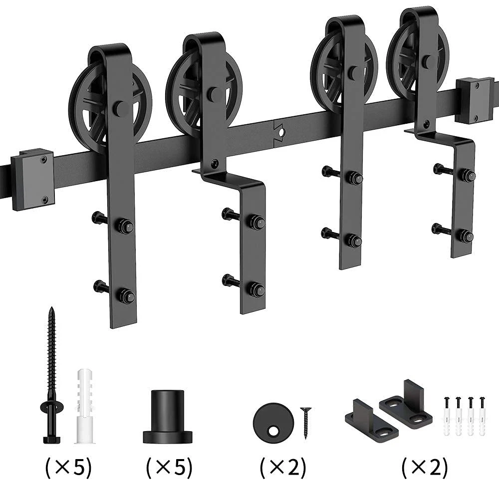 Heavy Duty Sliding Barn Door Hardware Single Track Bypass Double Door Kit [Single Track Bypass Barn Door Hardware Kit] Condition: New; Material: Carbon Steel(High Standard); Surface: Black Powder Coated(Anti-Rust); Door weight capacity: 265 lbs; Fit door panel width: Up-36"; Door Thickness: 1 3/8" - 1 3/4"; [One Single Track for Bypass System Available] Normally we need to install the bracket for bypass system,however it is not a easy job for most of us . Some Customer were not have enough space between the ceiling and Doors .But now it will not be a problem ,we have upgrade the bypass system and make it can be install on one track . [EASY TO INSTALL] Step by Step Instruction. Our Instruction is listing every step for installation, you can do it step by step, It is very easy when you install the barn door hardware.In case you get any problem or missing parts during installation ,please free feel to . [Package Included] 2*3FT Flat Track ,4*Rollers , 2*Anti-jump Pads ,2*Floor Guides ,2*Door Stoppers ,5*Leg Screws ,5*Wall Spacers ,1*Manual [IMPORTANT] "ONLY HARDWARE KIT INCLUDING, BARN DOORS WERE NOT INCLUDED."
