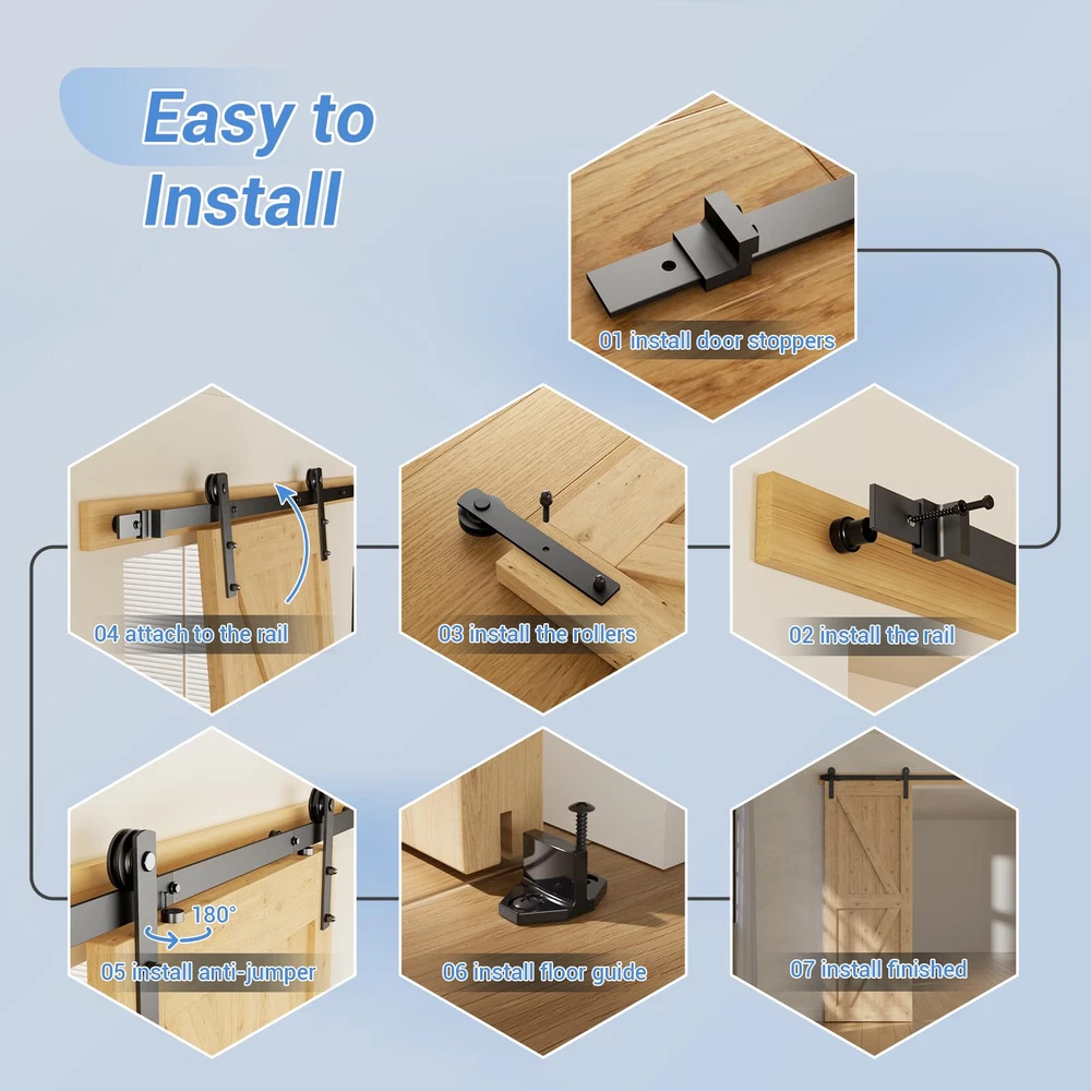 Reliable Choice: Made by heavy duty carbon steel with frosted black surface, water proof, rust proof, move smoothly and quietly. Get premium quality hardware kit with 1/3 of the market price. Easy to Install: Professional install instruction and team to help you solve all problems in time. Step by step service save your cost of finding a carpenter and enjoy joyful DIY. Door Weight Capacity: 330lbs; fit door panel width: 36"; fit door panel thickness: 1.18"-1.96"; the space above the top of the door needs more than 5". Fit most doors for kitchen, bedroom and bathroom. Package Includes: Complete barn door hardware kit (6 feet splicing track, Rail Spacers, 2x Rollers, 2x Door Stops, 2x Anti-jump Discs, 1x T-shape Floor Guide, 1x Hex Key) *Door Not Included. Advantage to Your House: 1. This decor complements modern style with classic barn door; 2. Not only saves space, but allows to open up multiple rooms without swinging door.
