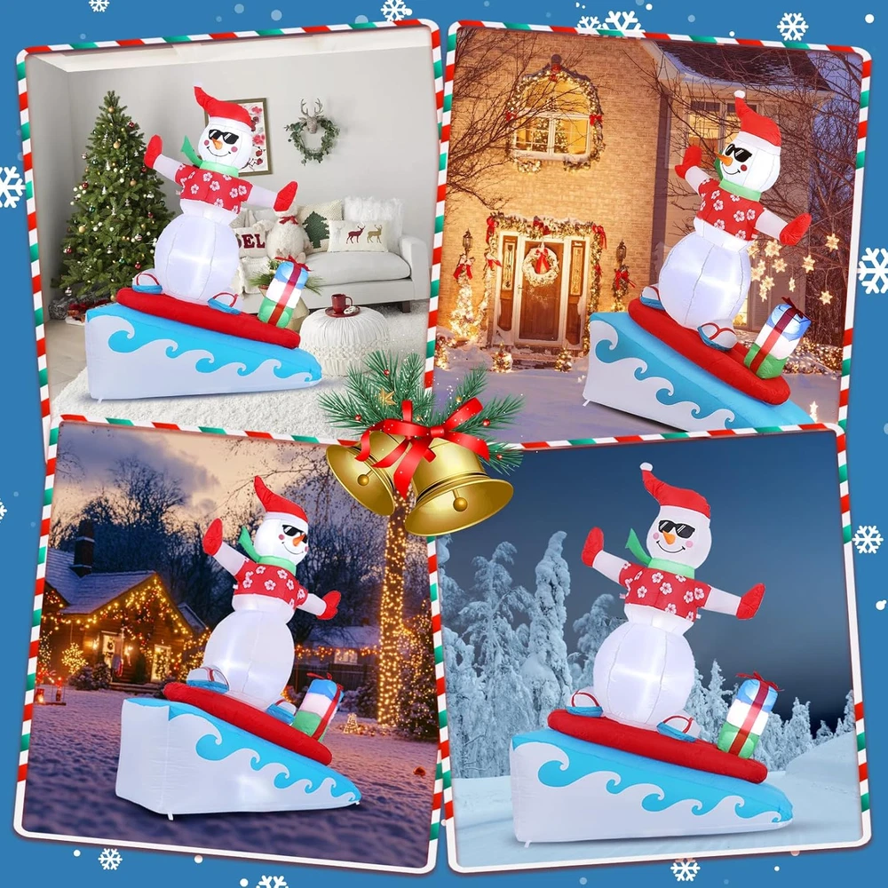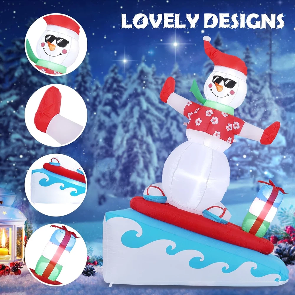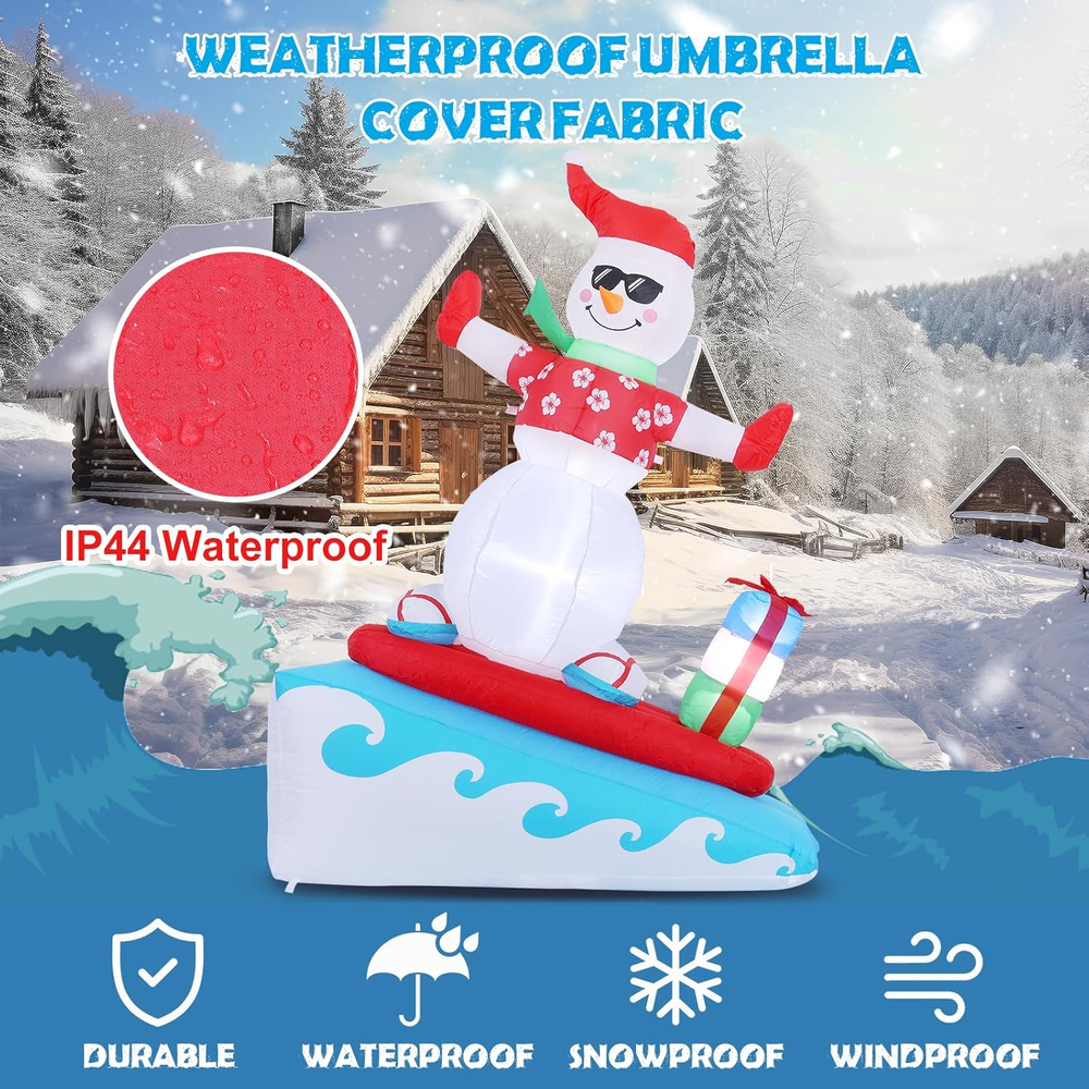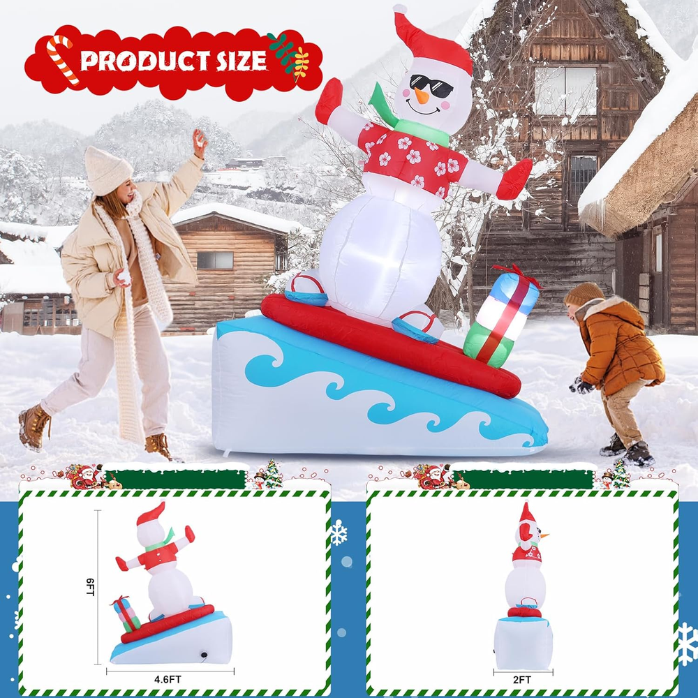 Cartoon Character: Snowman Color: Christmas Colors gtin13: 7445021441433 Additional Features: Easy Setup, Fade Resistant, Durable, Easy Deflate Brand: Does not apply Theme: Christmas Type: Does not apply Subject Character: Snowman UPC: 7445021441433 Occasion: Christmas Item Shape: 6FT Surfing Snowman Item Dimensions: 55.2 x 24 x 72 inches