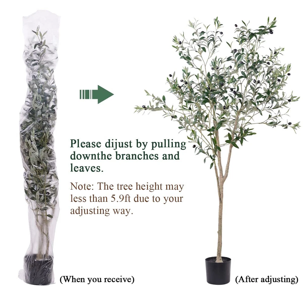 SIMULATED SIZE & GOOD MATERIAL - 6FT(1.8m)after assembly, you can adjust the height according to your preference and place. Green realistic craftsmanship adds green life to the room. The size of the faux olive tree is designed with reasonable home aesthetics, and the latest technology and high-quality polyester materials are used to ensure safety. VIVID REALISTIC SILK TREES - Trunks , branches and leaves is carefully designed and manufactured to truly replicate real plants. The olive trees artificial indoor are lifelike, when it is windy, it can sway in the breeze, creating a natural and comfortable atmosphere, bringing you comfort and adding color to your room. FREE MAINTANCE - This artificial olive tree doesn't need sunlight, and fertilizing and watering it will save you from the trouble of falling leaves. Make sure artificial olive tree are lifelike, evergreen, and require no pruning. No need to water every day or pay special attention, just wipe it off with a damp cloth when it gets dusty. Suitable for living room, shop, bedroom, office and other places GOOD THINGS FOR DECORATION - The indoor fake olive tree symbolize peace, tenacious fighting spirit , life and eternity. In your home, bedroom or office, having an olive tree in your store may bring you unexpected goodies. At the same time, the dark green leaves look pleasing to the eye, relieve your fatigue of the day , and give you peace. CONSIDERATE AND PRACTICIAL AND FUNCTIONDESIGN - The tall olive tree is made of high-quality polyester fiber plastic, professional flower plastic and the height is adjustable. The craftsmanship can be visually realistic and tactile. The green little fruit is so cute that one can't help but take a bite and pinch it. The concrete base enhance the overall stability and prevents children and pets from tripping over it.
