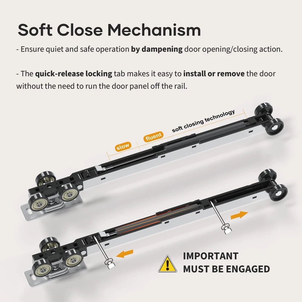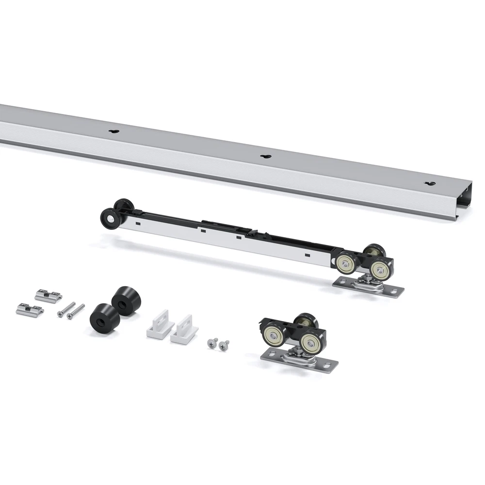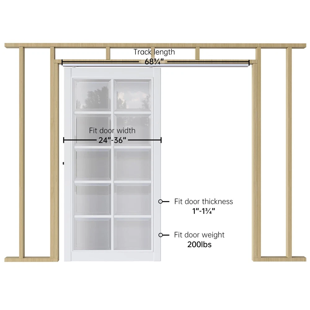 Commercial Grade Pocket Door Hardware: High precision aluminum box track for pocket door, concealed sliding ensures beauty and durable. Pocket door track can be cut into any length to meet your own require Soft Close Sliding Door Track: Ball bearing three wheel roller slide smoothly and quietly, tested beyond 100,000 rolls. The quick-release locking tab makes it easy to install or remove the door without the need to run the door panel off the rail Package Includes:(1)68-3/4" rail,(2)rollers,(1)door stops,(2)floor guide. DOOR NOT INCLUDED. Fit door width 24"~36";Fit door thickness 1" ~ 1-3/4"(25mm~45mm);Door weight capacity: 200lbs Easy Install: Easy installation tracks for sliding closet doors. We provide step-by-step graphic & text installation parsing manual, you can also get soft online copy and professional installation guide from our online service. All items have been multiple inspected before on market 24Hours Stand By: specialize in sliding door and hardware many years, if there anything missed or broken, please let us know, we are whole day online to solve your problem Notice: Our track length is 68inch instead of 72inch, and the spare 2 inches at each end is reserved for service