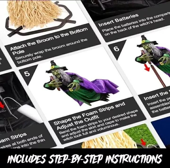 6Ft Halloween Decorations Outdoor Animated Hovering Witch Animatronics Sound LARGE HOVERING WITCH - This 6ft animated hovering witch is perfect for your indoor or outdoor display. ADDS SPOOKINESS - The unique design creates the illusion of a frightening witch in purple, floating above the ground. FRIGHT IN SIGHT AND SOUND - Eerie audio scripts play in tandem with animations with Illuminated with bright LEDs. SOUND & TOUCH ACTIVATED - Sound and motion sensors activate the witch's jaw movements, engaging passersby and filling them with Halloween dread. EASY ASSEMBLY REQUIRED - Just assemble and insert the pole to prop.( Requires 3 AAA batteries, not included