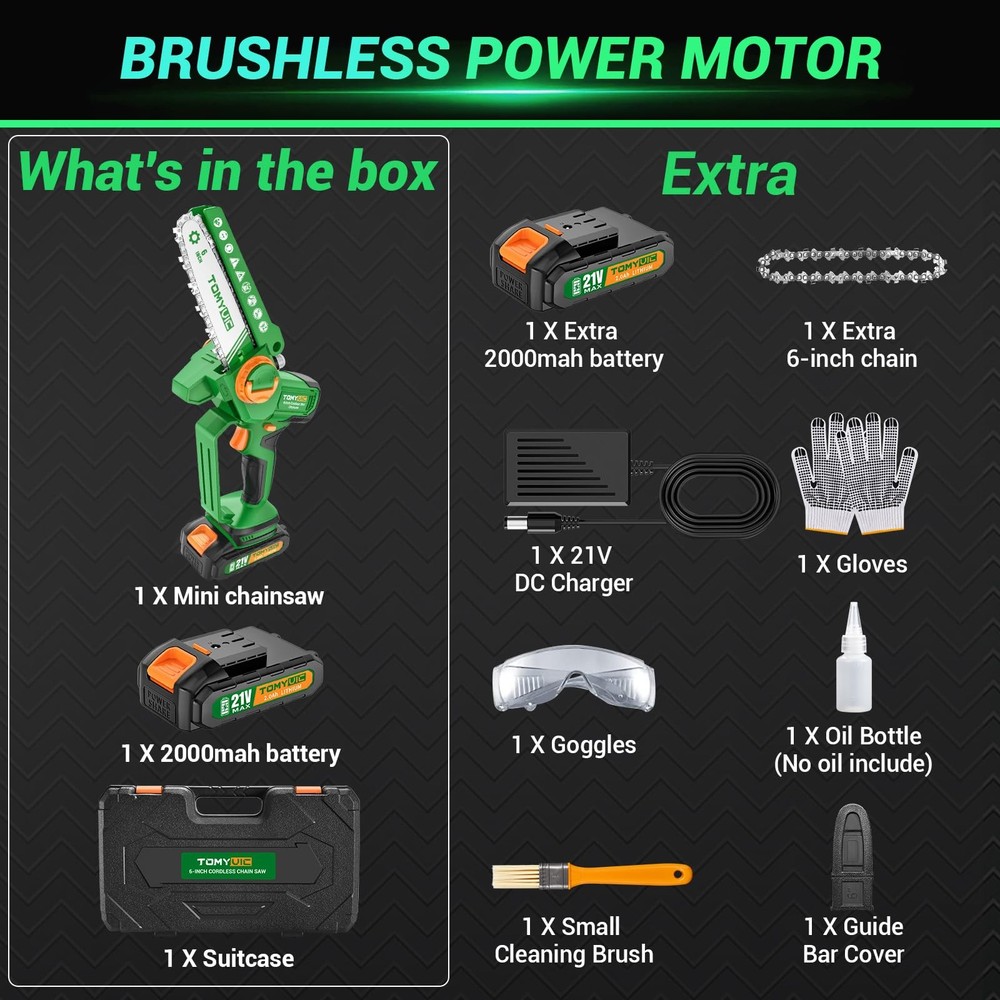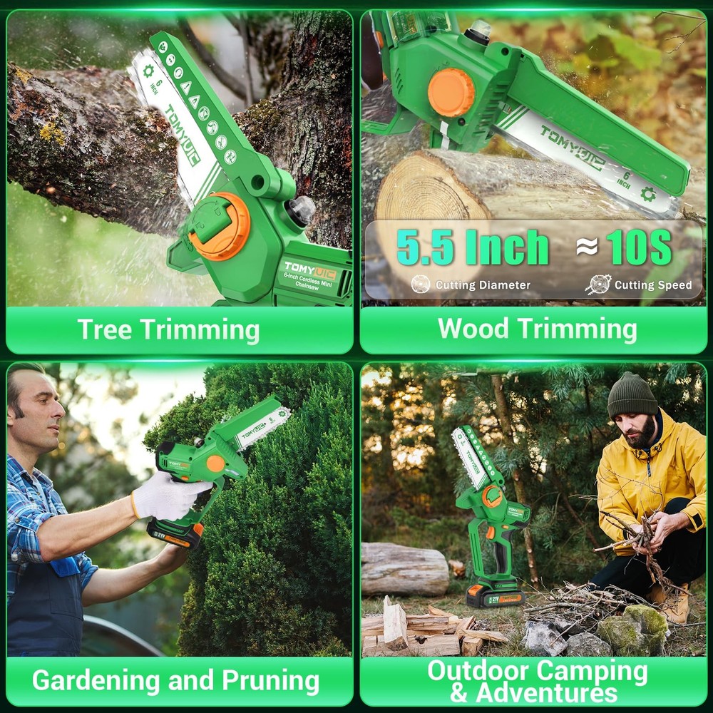 The Mini Chainsaw Cordless 6-Inch is the ultimate outdoor companion for everyone—right- or left-handed. Its ambidextrous design and ergonomic grip ensure effortless control, whether you're pruning unruly rose bushes, clearing storm-tossed branches, or prepping firewood for a family bonfire. Gardener Mia, a left-handed user, raves: "Finally, a chainsaw that fits my hands! The auto-oiler system keeps the chain gliding smoothly, and the tool-free tensioner let me adjust the chain in seconds mid-task—no fumbling with tools!" Lightweight yet powerful, this cordless chainsaw slices through 4-inch logs effortlessly. The brushless motor minimizes noise, perfect for quiet neighborhoods or peaceful garden mornings, while the auto-chain brake and secure grip prioritize safety during backyard cleanup. Included in this small chainsaw with battery and charger kit: safety goggles, gloves, and a rugged case for instant action. Backed by a 1-year warranty and trusted by 10,000+ users, it's more than a tool—it's confidence for every hand. 🔋 6-Inch Cordless Mini Chainsaw with 2×2000mAh Batteries: Cut through 4-inch logs effortlessly! This battery-powered chainsaw combines portability with a hardened steel chain, ideal for tight spaces and quick yard tasks—no cords, no gas, just pure cutting freedom. ⚡ Brushless Motor & Auto-Oiler System: Advanced brushless motor boosts efficiency by 25% while reducing noise and heat. The auto-oiler keeps the chain lubricated for smooth, maintenance-free operation—engineered for durability in demanding conditions. 🛠️Tool-Free Chain Tensioning in Seconds: No tools needed! Adjust the chain tension instantly with our enhanced mechanism. Secure, reliable, and hassle-free—perfect for beginners or pros who value efficiency. 🌳 Tackle Branches, Pruning & Storm Cleanup: From trimming apple trees to cutting firewood, this electric mini chainsaw handles small-to-medium tasks effortlessly. Lightweight design & 6-inch blade are perfect for DIYers and gardeners. 🪓 Full Kit: Ready to Use Out of the Box: Includes 2 batteries, 1 extra pre-sharpened chains, charger, gloves, goggles, empty oil bottle, small cleaning brush and a rugged suitcase. Everything you need for immediate action—just grab and go. 🎁 Gift-Ready with 1-Year Warranty: Backed by reliable support and packaged for gifting, this cordless chainsaw is a hit for holidays, birthdays, or Father’s Day. Practical, durable, and trusted by homeowners.