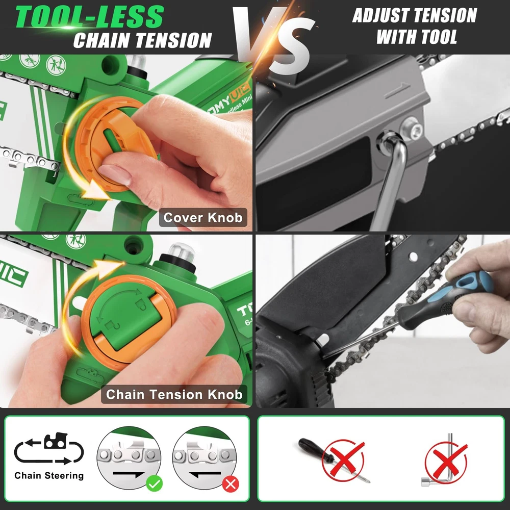 This mini chainsaw is a game-changer for yard work! Lightweight yet powerful, it handles branches and small logs with ease. The auto-oiler keeps things running smoothly, and the tool-free tension adjustment is so convenient. Perfect for both lefties and righties—no more hand fatigue! Great for quick pruning or firewood prep. Highly recommend for hassle-free cutting!