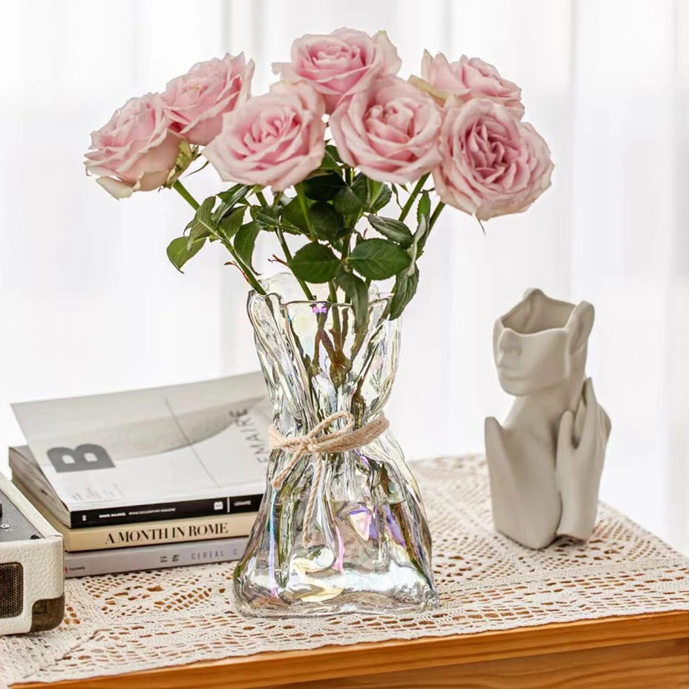 【Unique Design】This glass flower vase captures people's attention with its unique and creative design. Decorative vase perfectly matched with natural woven grass rope, injecting new inspiration and style, creating a Unique artwork. 【Premium Material】Made of thickened quality glass, our vases are made of purer crystal glass with higher strength and transparency, which is not only delicate and beautiful in appearance, but ensuring stability and durability. It must be a surprise! 【Modern Art Style】This beautiful vase is an ideal choice for various flowers, dried flowers or artificial flowers, silk flowers, and vase fillers. With its excellent quality and elegant appearance, you can decorate it as you wish, adding fun and vitality to your life! 【Aesthetic Home Decoration】This glass vase is suitable for a wide range of settings and environments. Whether it's in the living room, study, office, dining room, bookshelf, or coffee table, it brings a sense of modernity and a stylish atmosphere to the space, showcasing your taste and personality. 【Perfect Gift】Our modern flower vase is a perfect gift for any occasion, including Valentine's Day, Thanksgiving Day, housewarming parties, weddings, anniversaries, and birthdays. Your friends and loved ones will appreciate its elegant design and versatility. 【100% After-sales Service】We are proud to provide you with beautiful flower vase. Because our vases are made of glass, if you have any problems, please feel free to us, we will provide you with a satisfactory solution within 24 hours!