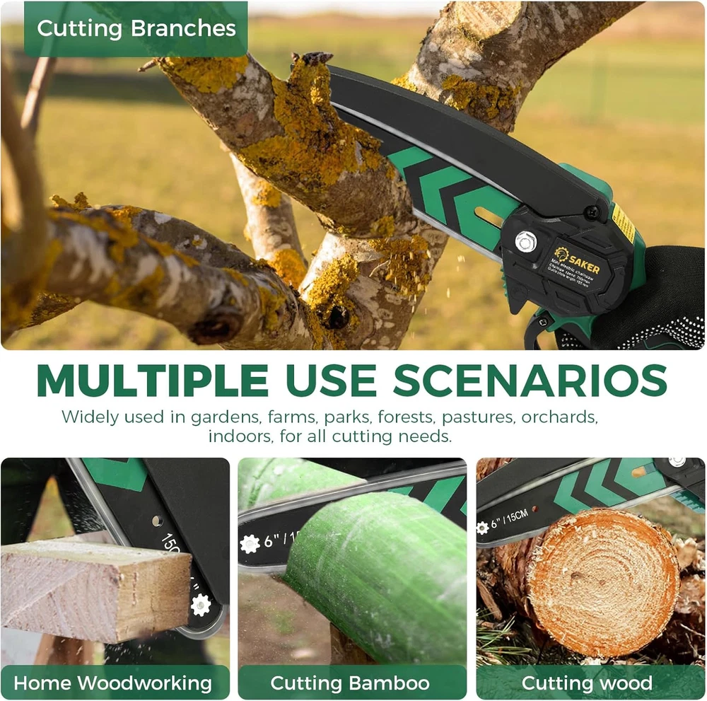 Menu Other Items Feedbacks About Us Contact Us Add To Favorites Mini Chainsaw,6 Inch Portable Electric Chainsaw Cordless, Small Handheld Chain Saw for Tree Branches,Courtyard, Household and Garden(Sk1806D-G) 🎁 Mini Chainsaw Cordless 6 Inch Perfect Tool for Mom, Friends,DIYer, Women Who Like to Do Woodworking or Like to Organize the Yard🎁 【LARGER CUTTING SURFACE】 - Saker mini chain saw 6 inch cordless has a cuttable face length of 6 inches and a total steel plate length of 9 inches. You can cut thicker trees to meet more of your needs. 【STRONG DYNAMIC SYSTEM】 - Saker mini chainsaw cordless adapts a high-quality guide chain that has undergone a deep quenching process to ensure smooth cutting. In addition, Saker mini chainsaw cordless uses a pure copper motor, which is very powerful. Cutting efficiency is higher and faster. 【RECHARGEABLE ELECTRIC CHAINSAW】 - Saker mini chainsaw is equipped with a 20V 1500mAh rechargeable lithium battery, which can be used for a long time. Saker mini chainsaw 6 inch cordless with 2 batteries can charge at any time.Saker electric chainsaw cordless is convenient and fast.If you do not use it for a long time, please remember to fully charge the battery first, for a better experience the next time you use it. 【EASY TO CARRY 】- Although the suitcase is small, it can store all the accessories perfectly. Smart saker mini chainsaw is small chain saw,it is small and convenient, quick and easy to assemble, just need 1 minute for all install. 【UPGRADED COPPER WIRE HIGH-EFFICIENCY MOTOR】 -Mini chainsaw 6 inch cordless uses upgraded copper wire high-efficiency motor. Provides your tool with longer run-time, more torque, and more power which leads to less wear and tear, extending the lifetime of the smartsaker handheld chainsaw. 【BETTER USE EXPERIENCE】-Saker 6 inch chainsaw has longer cuttable surface, you can cut down a little thicker trees with less effort, bringing you a better experience. Saker mini chainsaw 6 will be a good helper in your woodworking work! 【Service】We are confident in the quality of the product. In the process of daily use, if the mini cordless chainsaw has quality problems or have any questions about the power chain saws, please contact us at any time, we are always there. Product Description Saker is a tool brand with the most professional designers and operations teams ,is committed to offering families the simple and friendly tool products. No matter what kind of tools you need, Saker can provide you. This is our slogan. Why Choose Saker Mini Chainsaw? Ultra-Portable Design Weighing only 1.5 pounds, the Saker Mini Chainsaw 6 Inch is perfect for camping and other outdoor activities. Powerful Electric Motor Equipped with high-powered motor, this mini chainsaw can handle small branches and logs with ease. Safety Lock&High-Quality Chain The chainsaw is equipped with a safety switch to prevent accidental startup and a protective guard to prevent debris from flying out during use. New Battery Technology The battery has five types of protection, such as overcharge and overload, to protect your use of safety. Home Repairs and Maintenance Easily cut through various types of wood for home repairs and DlY projects.With its high-powered motor,it is the perfect addition to your toolbox. Gardening and Pruning Keep your garden in perfect shape by pruning and trimming branches easily.With its high-powered motor, it can tackle small branches and logs easily. Outdoor Camping and Adventures The lightweight and portable design make the Saker Mini Chainsaw an ideal tool for camping, hiking, and other outdoor activities. Yard Maintenance It is ideal for trimming tree branches of various sizes, allowing for precise cuts. It helps maintain the shape and aesthetics of trees in the yard. The Saker Pro Tools Product Collection Add to Cart Add to Cart Add to Cart Customer Reviews 4.0 out of 5 stars 70 4.5 out of 5 stars 14,634 4.2 out of 5 stars 76 4.5 out of 5 stars 278 4.7 out of 5 stars 961 4.5 out of 5 stars 230 4.3 out of 5 stars 27 Price $79.99 $ 79 . 99 $68.38 $ 68 . 38 $159.99 $ 159 . 99 $29.99 $ 29 . 99 $16.99 $ 16 . 99 $39.99 $ 39 . 99 $18.99 $ 18 . 99 EASY TO USE ✔ ✔ ✔ ✔ ✔ ✔ ✔ UPGRADE ✔ ✔ ✔ ✔ ✔ ✔ ✔ MATERIAL ABS & Steel ABS & Steel ABS & Steel ABS & Steel Steel ABS Steel CHARACTERISTIC 1 Powerful Brushless Motor A 20V rechargeable battery. 2-in-1 Versatility Rechargeable Capacity Battery High quality material New battery technology High quality material CHARACTERISTIC 2 High Efficiency Cutting Cutting efficiency is higher. Adjustable Extension Pole Lightweight and Portable Easy to carry Five Protections Easy to operate and portable Item Specification Item model number SK1806D-G Style 6inch Green Power Source Battery Powered Color 6 Inch Green Product Dimensions 6.7"L x 5.1"W x 15.7"H Country of Origin China Batteries Required? Yes Item Weight 6.52 pounds Batteries 2 Lithium Ion batteries required. (included) Batteries Included? Yes Horsepower 550 Watts Battery Cell Type Lithium Ion Included Components mini chainsaw Dimensions Shipping Returns Additional Info Product Dimensions: 5.1 "h x 6.7 "h x 15.7 "h. Weight: 6.52 lb Fast shipping is very important for us. Our standard shipping service is FREE. Your order will be shipped within 1-3 business days upon full payment received. Most items are delivered within 3-5 business days, however, please allow 3-10 business days. We are shipping only to USA. We only ship to the confirmed Paypal address. We reserve the right to cancel any order for any reason at any time. We are not responsible for undeliverable addresses. We offer a 30 day return policy from checkout winning date. Your satisfaction is guaranteed! If for any reason you are unhappy with your item, just return it within 30 days for a full refund, minus shipping cost. Please contact us prior to initiating a return so that we can issue you a refund authorization. Items defective upon receipt must be pack