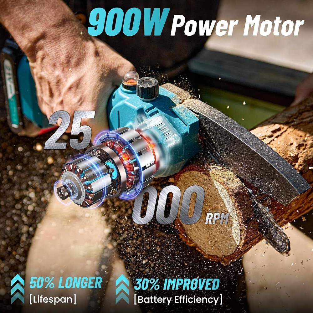 Perfect Companion for Everyday Tasks: Whether you're trimming branches in your garden, cutting firewood for a cozy night, or tackling a DIY project, the 6-inch mini chainsaw is designed to make every task feel effortless. It’s a practical and thoughtful gift for family and friends who love hands-on projects Get the Job Done 3X Faster: No more wasting time on slow, inefficient tools! With its powerful 900W motor and precision-hardened chain, this power chain saw breezes through logs up to 6 inches thick in just seconds—perfect for anyone looking to save time and energy Effortless Control for All Users: Weighing only 2.8 lbs, this small chainsaw is lightweight and easy to handle. Seniors, women, and beginners will appreciate how simple it is to use for pruning branches, shaping bushes, or clearing small logs—no prior experience needed Smooth Cuts Every Time: Say goodbye to frustrating jams or uneven cuts. The automatic chain lubrication system of chain saw keeps the chain running smoothly and prolongs its life, letting you work continuously without interruptions Safety You Can Rely On: Feel confident while you work with electric saw. The dual safety lock prevents accidental starts, while the chain guard protects against debris. The low kickback design adds an extra layer of stability, ensuring safe use for every user, every time Always Ready When You Are: With two long-lasting 21V 2000mAh rechargeable batteries, you’ll have up to 60 minutes of uninterrupted power for even your longest tasks. The fast charger gets you back to work quickly, so you’ll never have to stop mid-project Quiet Operation, Peaceful Work: Enjoy the quiet hum of your mini chainsaw—perfect for early morning or evening tasks without disturbing neighbors or loved ones. It’s the perfect balance of power and peace of mind Power Source Battery Powered Horsepower 900 Watts Item Weight 3.15 Pounds Product Dimensions 3"L x 2"W x 10"H Chain Length 6 Inches Chain Speed 16.5ft/s