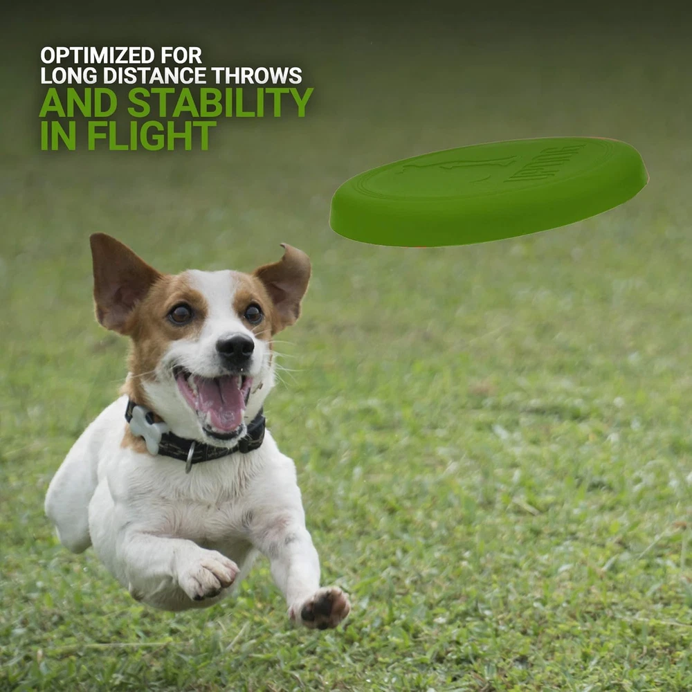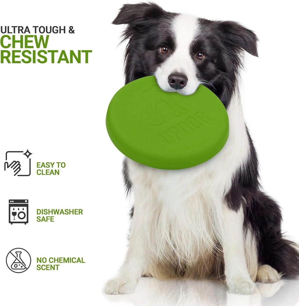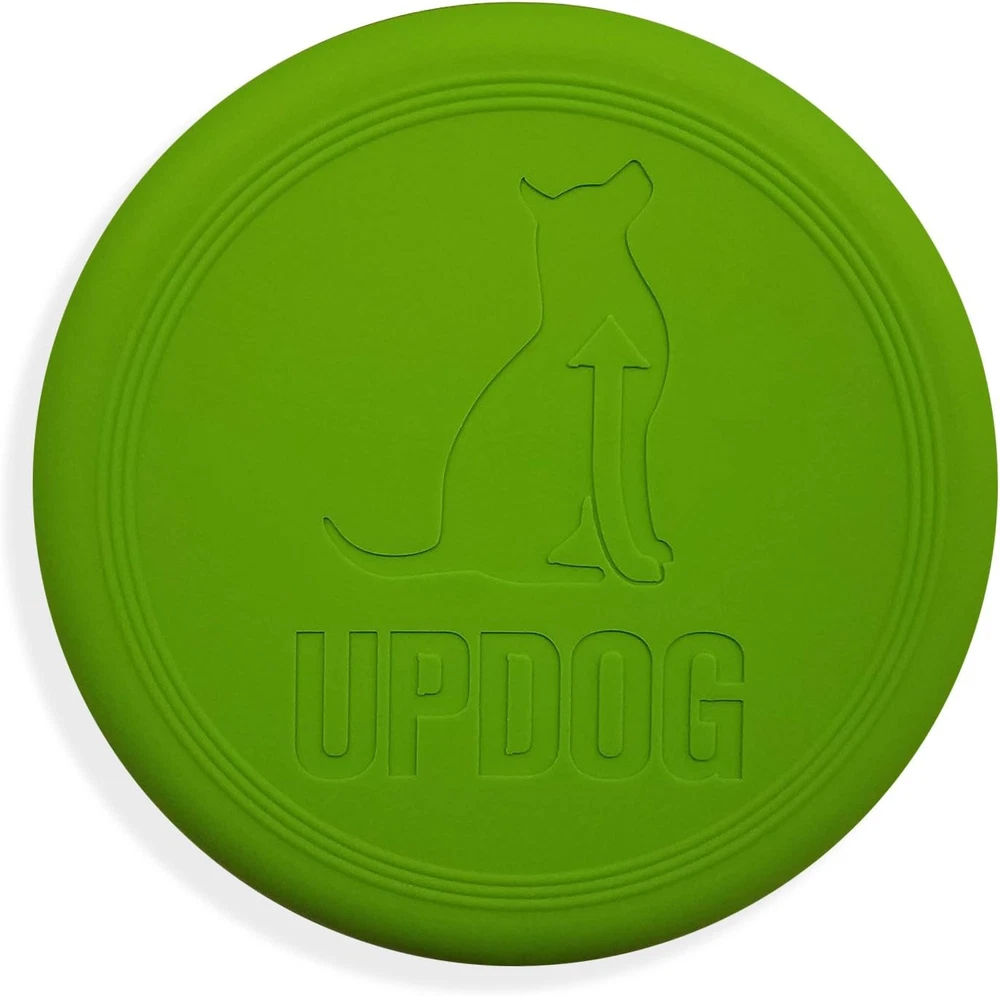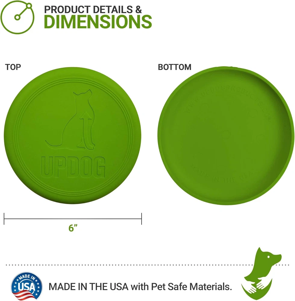 Made in the USA with Pet Safe Materials Flexible for safe indoor/outdoor play Ultra tough and chew resistant Dishwasher safe, easy to clean, no "chemical" scent The UpDog Ultra Tough 6" Flyer is an extremely durable and exciting fetch toy for your best friend. Made out of the highest quality US sourced flexible plastic, this toy won't injure the dog's mouth or owners hand. The design is optimized for long distance throws and stability in flight. Bright colors resist sun fading and are easy to find even in the thickest brush. If you've been unhappy with the quality of other brands, give this flying disc a try, it is the last frisbee you'll ever buy! Proudly made in the USA by dog owners, for dog owners.