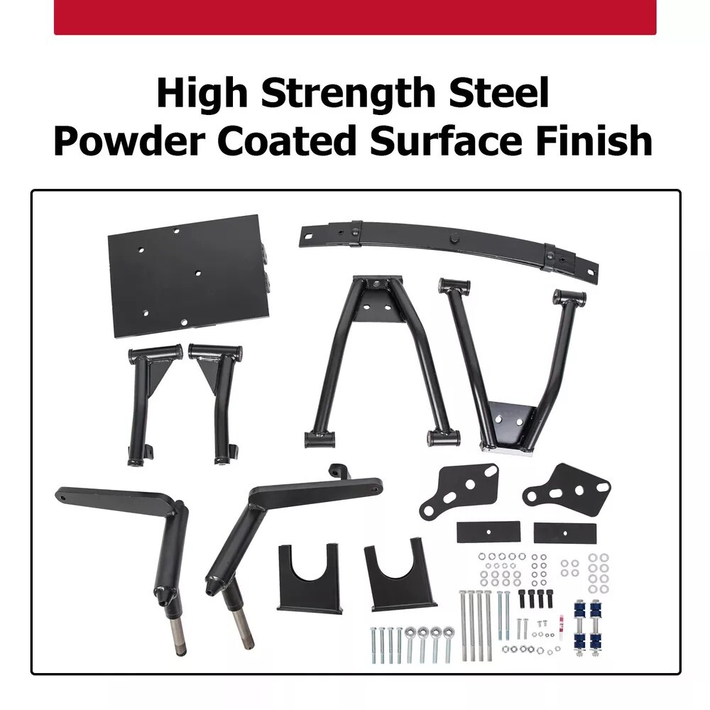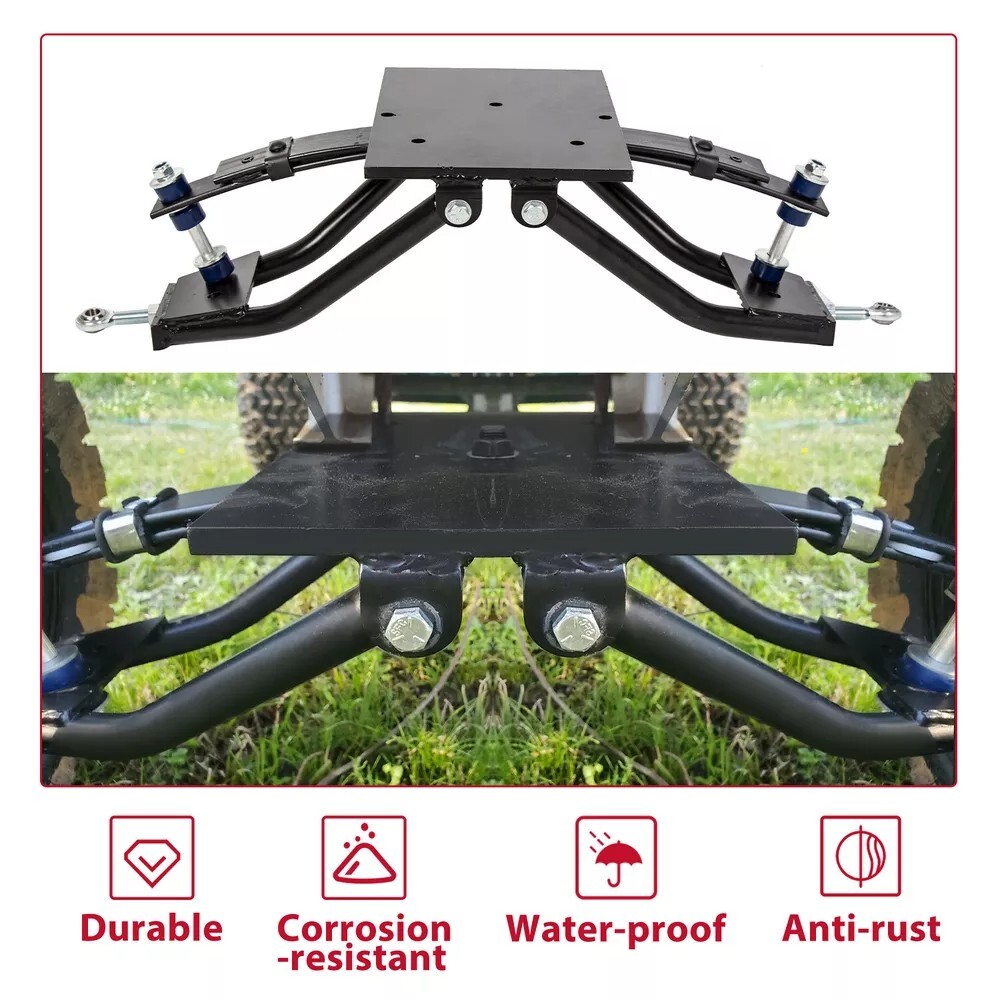 This lift kit completely transformed my Club Car DS—rides smoother and looks way more aggressive with the bigger tires! The double A-arm design feels sturdy, and installation was straightforward with all the included hardware. No modifications needed, just bolt-on and go. Perfect for both electric and gas models. The powder-coated steel looks sharp and holds up well. If you're hauling heavy loads, definitely pair it with heavy-duty rear springs to avoid rubbing with 23" tires. Totally worth the upgrade for better off-road performance!