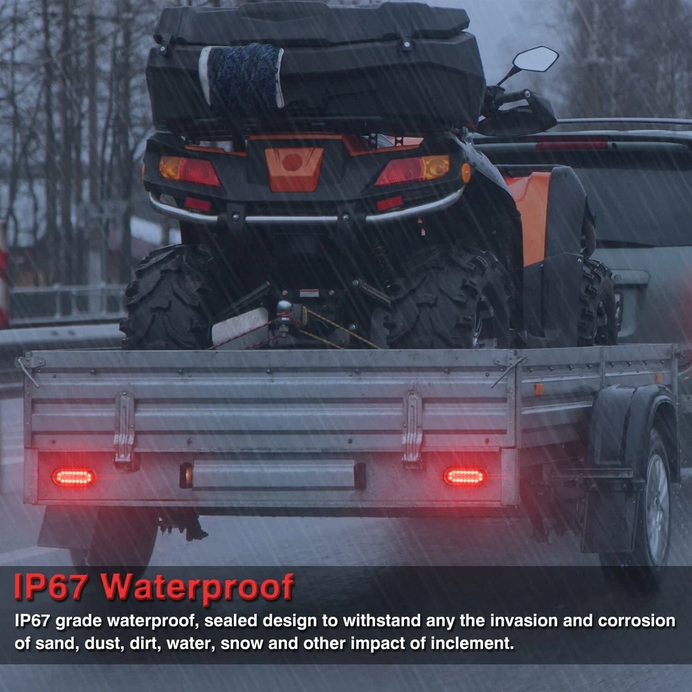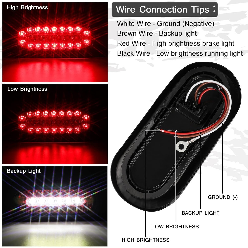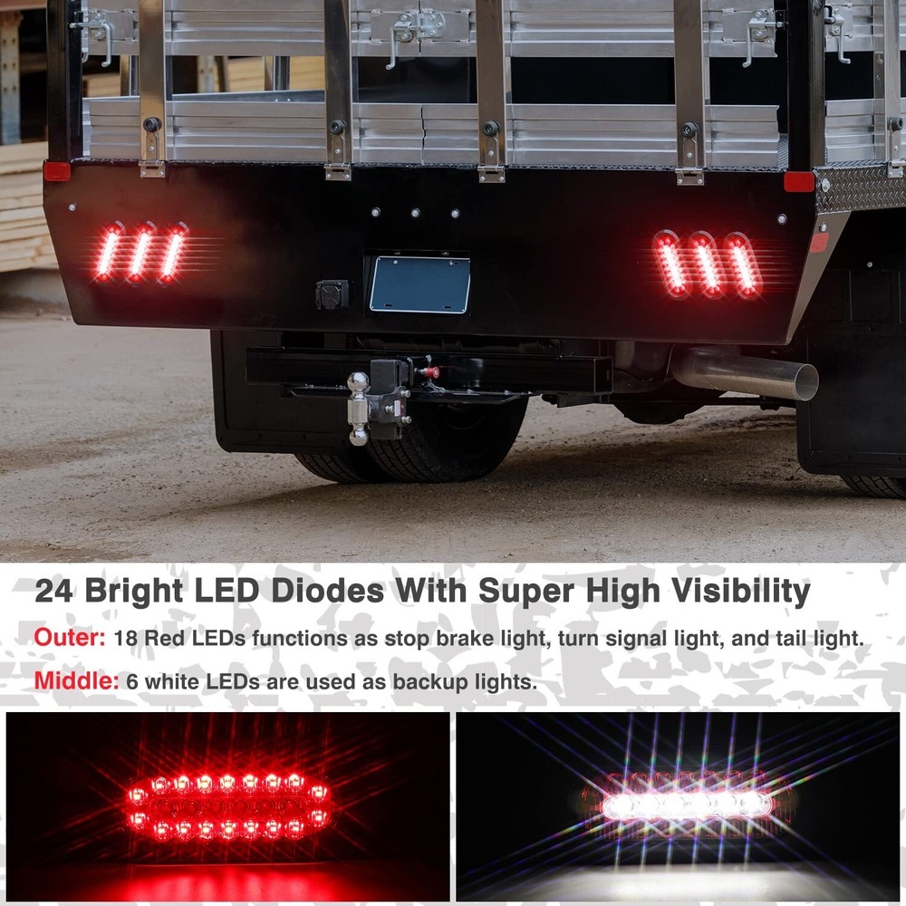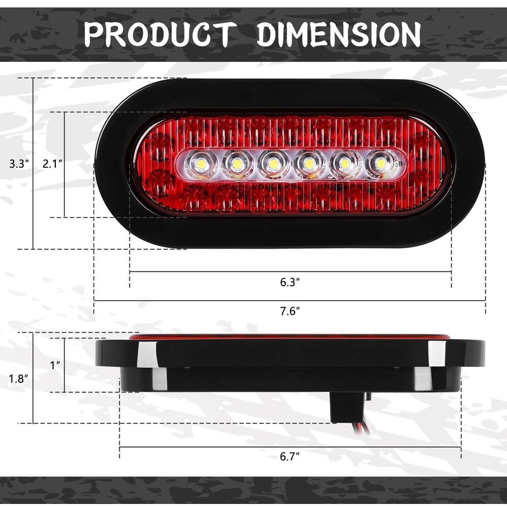 6 inch Oval Truck Trailer Lights, 24 LED Tail Stop Brake Lights Taillights Running Red and White Backup Reverse Lights with Waterproof Rubber Gaskets for Boat RV Truck (4) Product Details Brand: RONSTA Color: 4 Specific Uses For Product: Rear Lights Vehicle Service Type: Trailer, RV, Truck, Tractor, etc Year: 2023 Special Feature: Submersible Wattage: 40 watts Auto Part Position: Rear Lens Color: Red Lens Material: Durable Plastic or Polymer Brand: RONSTA Color: 4 Specific Uses For Product: Rear Lights Vehicle Service Type: Trailer, RV, Truck, Tractor, etc Year: 2023 Special Feature: Submersible Wattage: 40 watts Auto Part Position: Rear Lens Color: Red Lens Material: Durable Plastic or Polymer Assembly Required: Yes Manufacturer: RONSTA Vehicle Fitment Note: Fits various vehicles including trucks, trailers, RVs, and boats Model: VS Item Weight: 1.74 pounds Package Dimensions: 7.95 x 7.09 x 3.03 inches Country of Origin: China Item model number: VS-602D Manufacturer Part Number: VS-602D Special Features: Submersible Date First Available: May 16, 2023 IP67 Rate Waterproof and Submersible : Effectively protects the light from the invasion and corrosion of sand, dust, dirt, rain, snow, etc, excellent tightness makes it be definitely waterproof and submersible Amazing Brightness: Led Trailer Lights has bright LED diodes with super high visibility, making your vehicle or trailer visible in all weather and lighting conditions, reliable visibility and safety even in harsh weather Application Widely: suitable for use on a wide range of trailers, including heavy duty trucks, snowmobiles, camper trailers, and utility trailers, function as tail lights, turn/brake lights and backup reverse lights Easy Installation: Standard 6" size. Each light comes with an industry standard connector with 12" of wiring for installation. Install your lights in mere minutes Standard: The multi-function trailer tail lights adopt PC lampshade, and the bottom shell adopts new ABS material, which is in line with standard