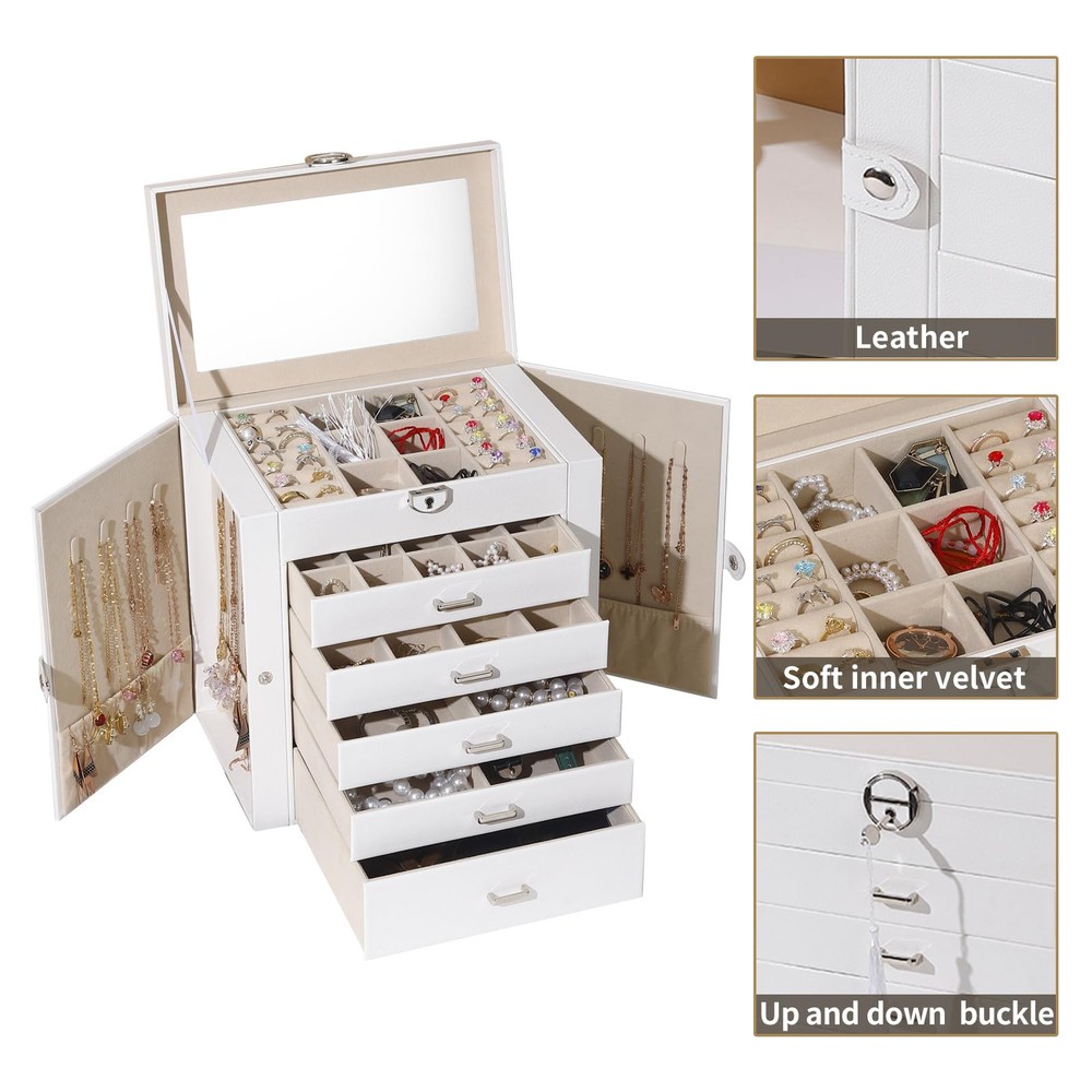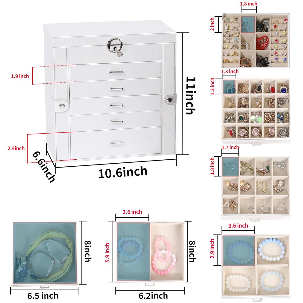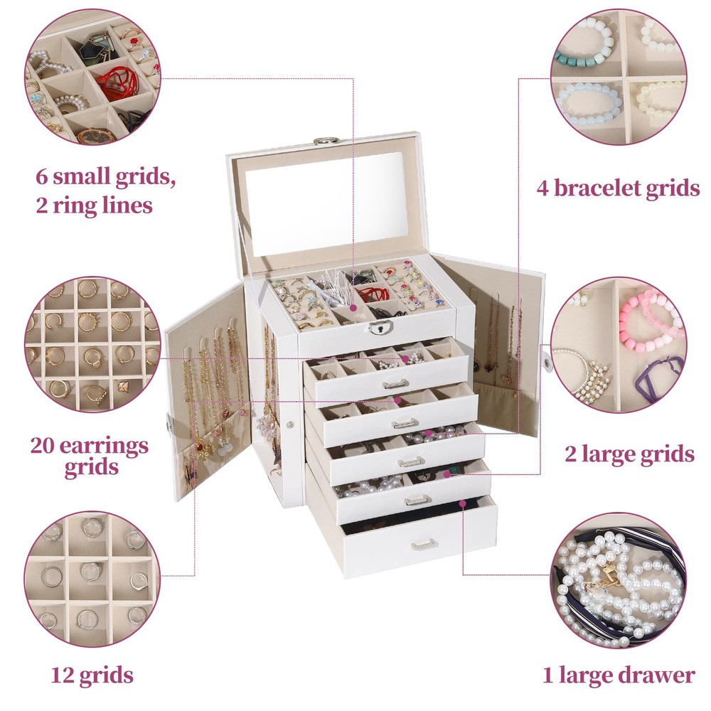 Multi-functional Jewelry Holder Organizer: The first layer on jewelry box with satisfy all your daily makeup needs. It with 6 earrings grids for stud earrings,brooches, Christmas charms. And it has 14 ring lines for ring holder, and 1 big mirror. Long Necklace Organizer: With excellent craftsmanship, this jewelry organizer will surprise you with its superior quality. With 16 necklace hooks on 2 jewelry organizer, you can hanging 16 necklaces in it. Makeup Organizer: The bottom drawer is really a huge drawer for your big stuffs, even for you cosmetics. With 5 drawers and 1 layer, you can take it as your makeup and jewelry box. All your daily storage needs will be take in it. Space and Time Saving for Makeup Table: With our 6 layer jewelry box, all your jewelry will be in good order and easy to reach. From then on, you have a bright dresser that saves space and makes your room look neater and more elegant. In addition, our jewelry travel boxes are designed to categorize your jewelry at a glance, shortening search time. Ideal Jewelry Gift Box : This PU leather jewelry box looks elegant and thoughtful. It is a perfect gifts for yourself, your friends, your wife or your mother for birthdays, Christmas, Valentine's Day, Mother's Day and anniversaries. This jewelry holder can be used not only as a girl's jewelry box, ring storage box, necklace storage box, earrings storage box, but also as a gift box for bracelets.