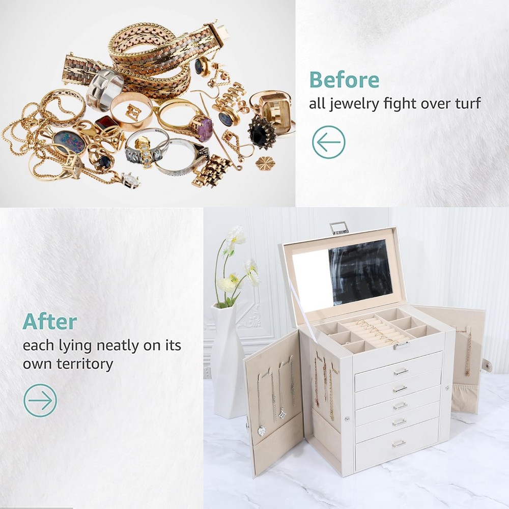 This is a high-capacity necklace, earrings, rings, bracelets, bracelets, watch jewelry collection box materials: the main body is MDF laminated PU leather, the interior is granular flannelette; appearance: 6 layers plus 5 drawers, there are two side doors (we call them double doors) on the left and right: A, the first floor has a mirror on top for makeup or earrings, and a row of sponge slots at the bottom for rings, the left and right sides have 6 grooves for various earrings or bracelets, etc. B, there are 5 layers of drawers below 36 large and small grooves suitable for storing earrings, pendants, bracelets, watches, hairpins, sunglasses, etc. . C, the left and right side of the door can hang 16 necklaces, elastic bands can also be used to hang many pendants Product parameters: Product name: double door & 6 drawers jewelry storage box, material: pu leather++ flannel, packing: 1 pack of desiccant/single PE bag/packing box, size: 10.6''*6.6''*11.02'' , Weight: 6.063 lbs UNIQUE DESIGN:Earring Jewelry Organizer boasts a unique , beautiful and a more convenient design than the other jewelry boxes out there. Our talented team of designers have worked hard to produce the perfect balance of modern ,sophistication, beauty and class to create this unique box with its gorgeous large mirror and attractive metal buckle. Unlike others our box possesses a magnetic snap that can be easily opened and closed with one hand for easy use. GIFT BOX & BLANK CARD - An elegant gift box and blank card is included with each Jewelry box for the most presentable gift giving. This makes a great gift for a mother, girlfriend , wife, daughter, colleague, friend or any other special woman in your life. This jewelry box for women is an ideal gift for Valentine's Day, Mother's Day, Thanksgiving, Christmas, birthdays and weddings. The high-grade jewelry storage containers is a good gift for women, girls, mothers, wives. If you have any questions about the product, click on the seller's name behind "sold by" at the bottom of the shopping cart, you can get help at any time. The large jewelry box includes earring boards, ring card slots, watch pillows and large drawers for glasses storage. Watches, necklaces, earrings, brooches, hair accessories, sunglasses, etc. can all be stored independently. Some partition boards can be moved and disassembled, and the flexible design allows you to adjust it according to your personal needs.