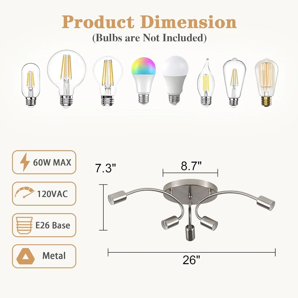 Store New Arrivals Add to Favorite View Feedback Contact 6-Lights Brushed Nickel Sputnik Chandelier Lighting, Modern Semi Flush Mount Ceiling Light Fixture, Metal Industrial Ceiling Lamp for Living Room Farmhouse Kitchen Bedroom (Brushed Nickel) Description Item model number Brushed Nickel Kitchen Light Fixtures Light Source Type Halogen, LED, Fluorescent, Incandescent Style Modern, Rustic, Classic, Farmhouse, Contemporary, Mid-Century Number of Items 1 Power Source ac Fixture Type Brushed Nickel Modern Chandelier, Ceiling Light Fixture, Kitchen Lamps for Ceiling Number of Light Sources 6 Control Method Touch Warranty Type 2-year warranty Theme kitchen lights Batteries Included? No Lighting Method Downlight Maximum Compatible Wattage 60 Watts Controller Type Push Button Unit Count 1.0 Count Room Type Kitchen, Bedroom, Living Room, Dining Room, Entryway, Hallway, Farmhouse Assembly Required Yes Product Dimensions 26"L x 8.7"W x 7.3"H Material Metal, Iron Installation Type Flush Mount Model Name Sputnik Chandeliers-002-S Finish Type Brushed Specific Uses For Product Industrial Ceiling Light, Semi Flush Light Fixture, Hanging Light Fixtures Bulb Features Cold White/Natural White/Warm White Indoor/Outdoor Usage Indoor Bulb Base E26 Country of Origin China Water Resistance Level Not Water Resistant Batteries Required? No Item Weight 1 pounds Light fixture form Ceiling Special Features Portable, Adjustable Color Temperature, Industrial Ceiling Light Special Feature Portable, Adjustable Color Temperature, Industrial Ceiling Light Part Number GDD-02 Shade Color Brushed Nickel Mounting Type Ceiling Mount Color Brushed Nickel Wattage 60 watts Shape Round Voltage 120 Volts Shade Material Metal Finish types Brushed Included Components 1 * Instruction Book, 1 * Mounting Accessories Set, 1 * Flush Mount Ceiling Light Switch Type Dimmer MINIMALIST 6-LIGHT BLACK LIGHT FIXTURE DESIGN - Brushed nickel kitchen light fixtures has open design and Industrial style, simple and elegant, creating a comfortable and modern ambiance to your house. Different light effects when you choose different bulbs. The silver light fixtures is perfect for your home lighting and decoration, not only suitable for mid century style but also modern home family. MARKET CERTIFICATION-QUALITY & DURABILITY - The brushed nickel kitchen lighting comply with market standard. Equipped with sturdy die-cast metal, you do not have to worry about aging, bent or color fading problems. Vintage style industrial ceiling light is made of high quality metal baking paint. The modern brushed nickel kitchen ceiling lights can long-lasting use. Save you the trouble of frequent . BLACK CHANDELIER BULB REQUIREMENTS- This ceiling lights for kitchen requires 6 x E26 base bulb (Max 60W) such as LED, CFL, incandescent, and halogen (BULBS ARE NOT INCLUDED). The kitchen lights ceiling also compatible with dimmer switch (not included), you can use a dimmable bulb to meet various lighting requirements and create different ambience. CLOSET LIGHT FIXTURES WIDE APPLICATION - Can be used as modern ceiling light fixture and black ceiling light. The elegant hanging light fixtures can be used as lighting for kitchen ceiling, hallway light fixtures, entryway light fixture, farmhouse ceiling light, bedroom lights for ceiling, modern chandeliers for dining room, lights for living room. It brightens and decorates your house. CUSTOMER SATISFACTION - Your satisfaction is always our goal to pursue. If you have any questions about this small chandeliers ceiling light or have any trouble when install this light fixtures ceiling mount, please feel free to , we will solve your problem within 24 hours. Product Description Different effects when you choose different bulbs. 6-Lights Semi Flush Mount Ceiling Modern ceiling light fixture has open design and Industrial style, simple and elegant, creating a comfortable and modern ambiance to your house. Modern Industrial Design Ceiling Light Different light effects when you choose different bulbs. The sputnik light fixture is perfect for your home lighting and decoration. Best Light Fixture for Your Family Gorgeous brightness and charming lights bring warmth to your home. It is also a good decorative piece while providing lighting. The socket is compatible with 6 x E26 bulbs (Max 60W, BULB NOT INCLUDED! ). Dimmable bulbs and dimmer switch (not included) can be used to meet your various lighting requirements and adapt to different ambience. Modern Sputnik Chandelier 6-Lights Semi Flush Mount Ceiling Light Fixtures with E26 Base Voltage: 110-130V; Frequency: 60W MAX. Light bulb: 6 * E26 (NOT including light bulb) Fully dimmable when using dimmable bulbs and a compatible dimmer switch. Perfect for Farmhouse, Hallway, Dining Room, kitchen, Restaurant, Bar, Garage. Different light effects when you choose different bulbs. ABEAJAT Light Fixtures for Bedroom Living Room Kitchen Farmhouse Hallway Add to Cart Add to Cart Add to Cart Add to Cart Add to Cart Add to Cart Customer Reviews 4.3 out of 5 stars 14 4.6 out of 5 stars 381 4.3 out of 5 stars 58 4.6 out of 5 stars 164 4.6 out of 5 stars 164 4.1 out of 5 stars 32 4.6 out of 5 stars 35 Price $42.99 $ 42 . 99 $44.99 $ 44 . 99 $39.99 $ 39 . 99 $48.99 $ 48 . 99 $54.99 $ 54 . 99 — $39.99 $ 39 . 99 Bulb Base E26 E26 E26 E26 E26 G9 E26 Voltage 110-130V 110-130V 110-130V 110-130V 110-130V 110-130V 110-130V Wattage 60 60 60 60 60 60 60 Number of Light Sources 6 3 1 3 3 2 3 Color Brushed Nickel Black Wood Gold Black White White & Gold Power Source ac ac ac ac ac ac ac Material Metal Metal, Iron Wood Rattan, Metal Rattan, Metal Glass, Metal Metal, Iron Indoor/Outdoor Usage Indoor Indoor Indoor Indoor Indoor Indoor Indoor Specific Uses Home Decor Home Decor Home Decor Home Decor Home Decor Home Decor Home Decor Room Type Living Room, Kitchen, Hallway Living Room, Kitchen, Hallway Living Room, Kitchen, Hallway Living Room, Kitchen, Hallway Living Room, Kitchen, Hallway Living Room, Kitchen, Hallway Livi