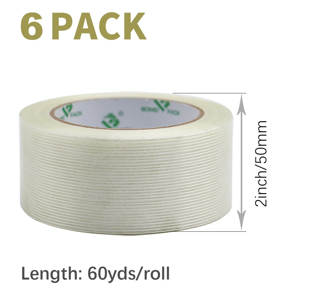 ✔5.5 mil thickness clear reinforced packing tape, thick enough, better adhesion, strong bonding. It is perfect for heaviest, toughest tasks that need industrial grade adhesion, strong holding power. Cut by scissors. ✔Transparent filament strapping tape with smooth surface is perfect for heavy duty goods packing, strapping, fixing, reinforcing, repairing and palletizing. ✔With Special formulated, straight filament packing tape adhere to variety of surfaces: glass, wood, plastic, metal, fiberboard, nylon, cardboard etc... ✔Fiber reinforced adhesive packing tape is weatherproof, moist resistant, UV and temperature resistant, suitable for most repairs, green house and outdoor use. ✔Filament fiber reinforced tape is ideal for furniture maintenance, heavy duty packing, carton sealing, carpet fixing, toy& vehicle patching, repairing and protecting. Product description BOMEI PACK Heavy Duty Fiberglass Reinforced Tape Reinforced Strong Packing Tape 2 inch Fiberglass Tape is combined with PET film and glass yarn material coated rubber adhesive. It is widely used for metal/wood materials furnishings packing, heavy duty packaging and electric equipment (like washing machine, refrigerator etc) packaging 6Rolls: 5.5mil x 2inch x60yds, total 360yds Heavy Duty Fiber Reinforced Fiberglass Reinforced Shipping Tape With extraordinary adhesion and tear resistance fiber reinforced packing tap e can tolerate moisture, abrasions, scuffing, nicks, and center seam splitting. This nylon filament tape adhere to a wide variety of surfaces: glass, wood, plastic, metal, fiberboard, etc. BOMEI clear reinforced heavy duty shipping tape is weatherproof and ensures that your packages survive tough storage and moving conditions. Waterproof& UV resistant Clear reinforced packing tape can use in extremely harsh environment: both hot and cold. Cut by tool The fiber tape resists tearing and puncture, when use need tool to cut Strong adhesive With strong adhesive, it is perfect for heaviest, toughest jobs Application of Heavy Duty Reinforced Packing Tape Fixing cable Fiber tape suitalbe for all kinds of fixing: cable, picture album, rug carpet... Repair broken items Suitable for most repairs: window, vehicle, furniture, tube children’s toys, pet’s accessories, and for outdoor, office, green house... Fasten equipment Fasten equiement and machine With strong adhesive reinforced packaging tape is ideal for heavy duty tasks that need industrial grade adhesion, strong holding power and long adhesive lifespan. Mainly include: heavy goods packing, strapping, fixing, reinforcing, repairing and palletizing... For example: carton sealing, heavy goods packing &strapping, steel bundling, fixing cable, holding carpet, warehouse palletizing… Suitable for most repairs: window, vehicle, furniture, tube children’s toys, pet’s accessories, and for outdoor, office, warehouse, green house... Strapping Heavy Duty Goods