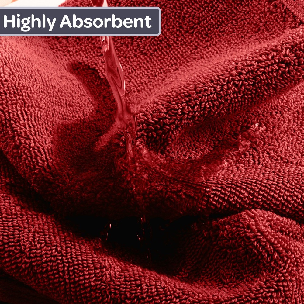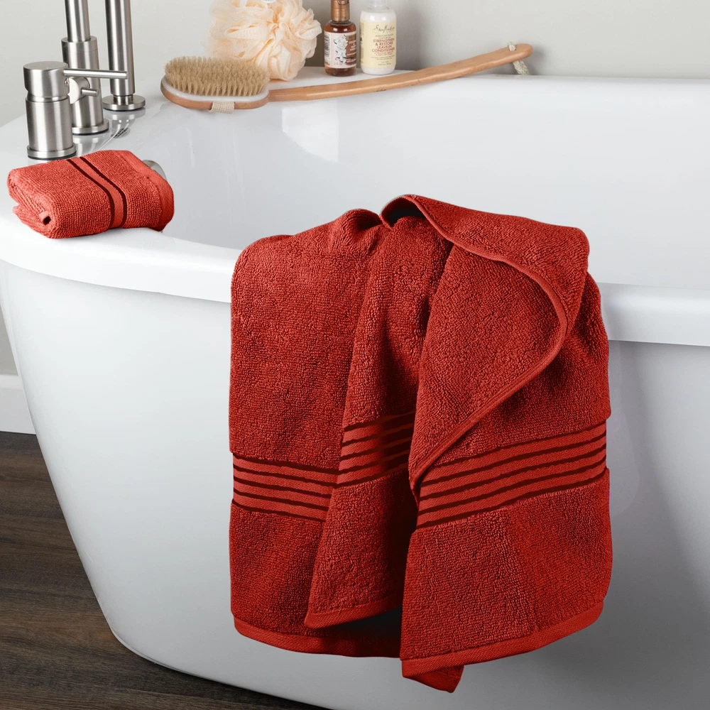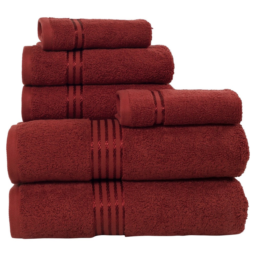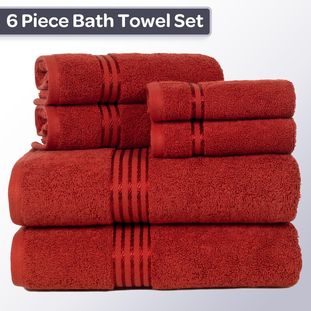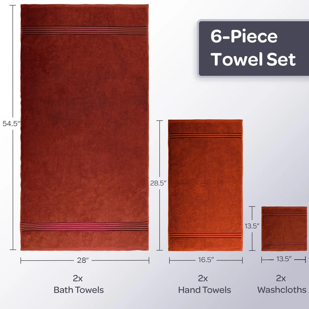 6PC BATH TOWEL SET - This bathroom towel set comes with 2 towels, 2 bathroom hand towels, and 2 washcloths for a uniform look and versatile use in your restroom. The towels set features an understated striped detail to complement any bathroom decor. PREMIUM QUALITY - Each towel is made from 100% cotton, with a plush 625 GSM thickness and velour finish that is soft to the touch, breathable, and provides plenty of warmth. These bathroom essentials feature enhanced durability for long-lasting use. HIGHLY ABSORBENT - Count on the luxury bath towels for a lightweight, yet highly absorbent, design that’ll look great hanging in your bathroom. The loop construction on each bath towel wicks away moisture quickly for a luxurious after bath experience. MULTIPURPOSE USE - Use the large bath towels in your main, guest, ensuite, or dorm bathroom as well as at the gym, spa, or rental location. They are machine washable for easy cleaning — wash on warm with like colors, do not use bleach, and tumble dry. PRODUCT DETAILS - Materials: 625 GSM 100% Cotton. Dimensions: Bath Towels: (L) 54.5” x (W) 28”; Hand Towels: (L) 28.5” x (W) 16.5”; Washcloths: (L) 13.5” x (W) 13.5”. Made in India. Includes 2 Bath Towels, 2 Hand Towels, and 2 Washcloths. Color: Burgundy.